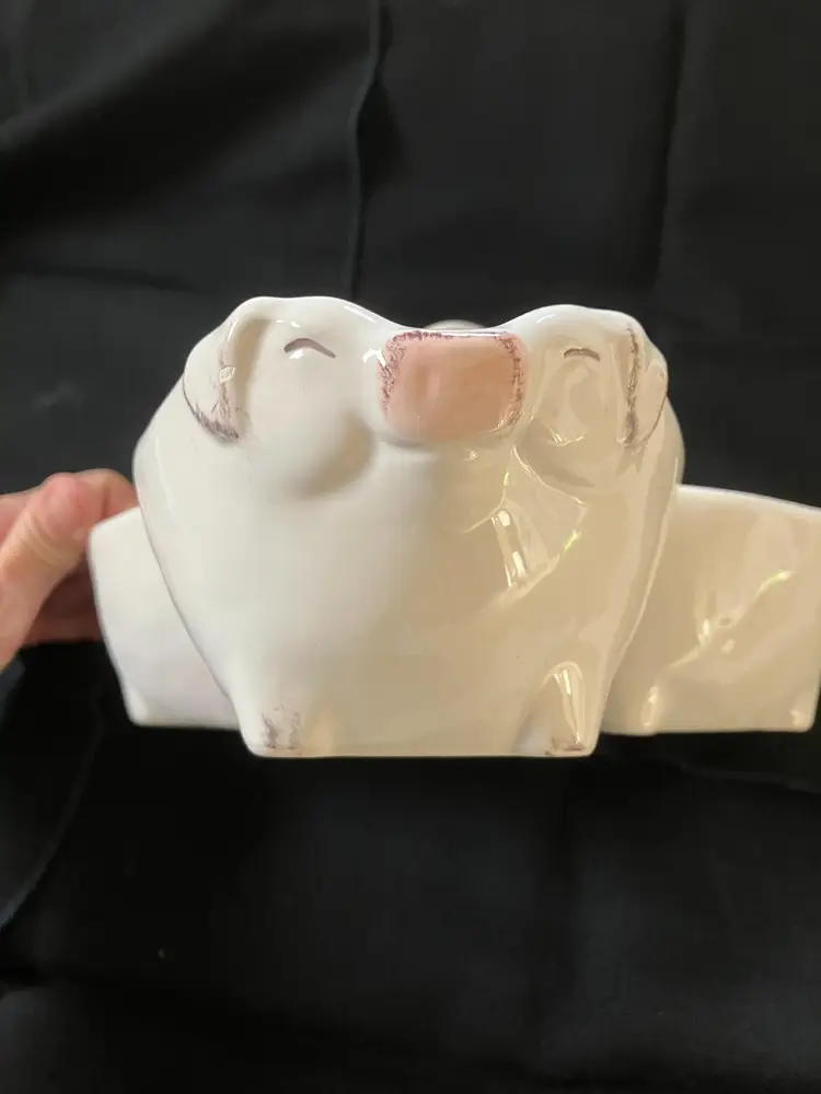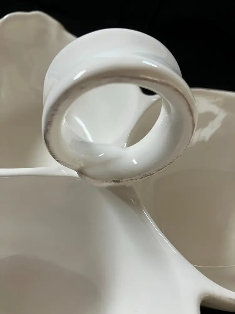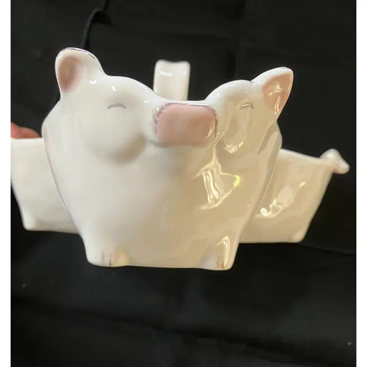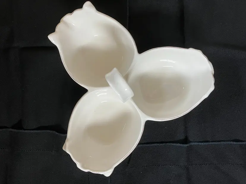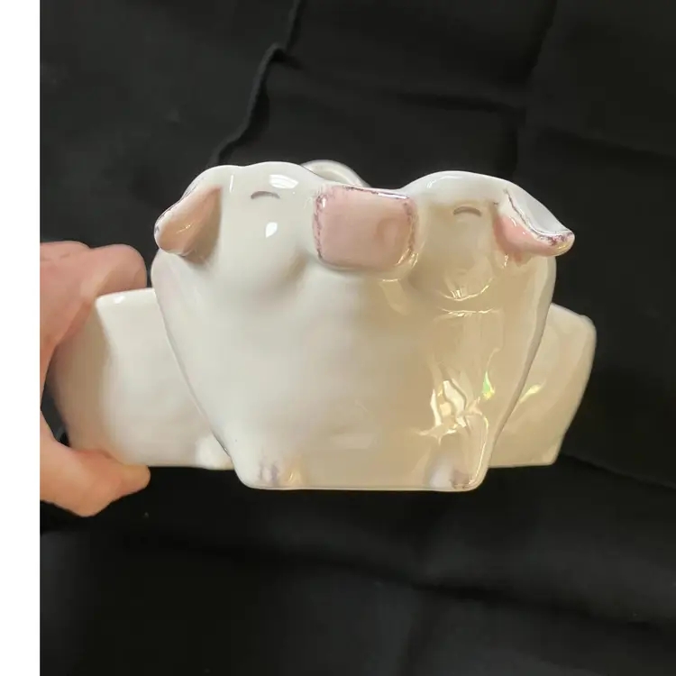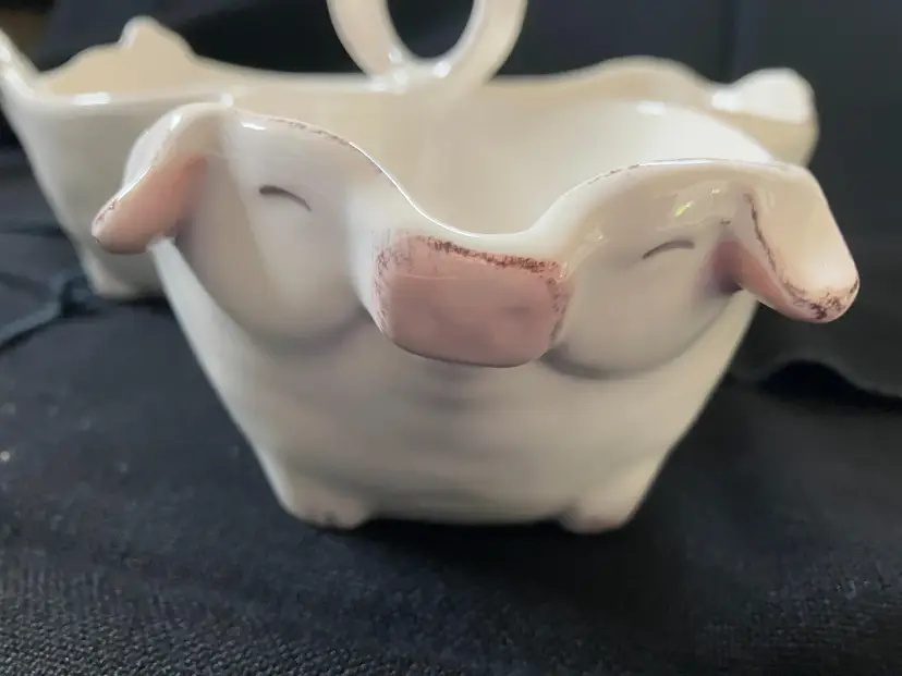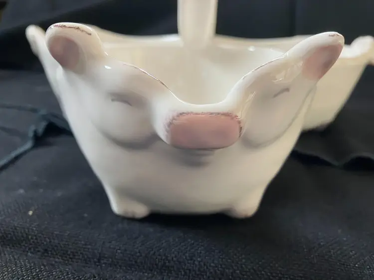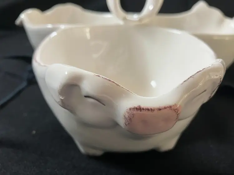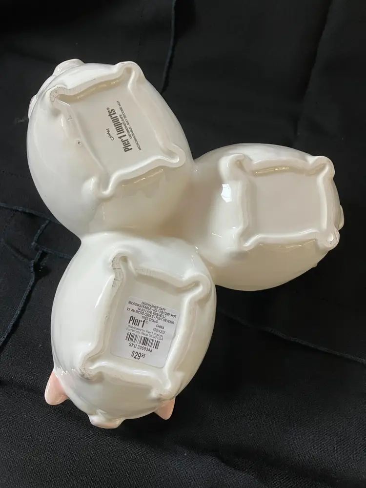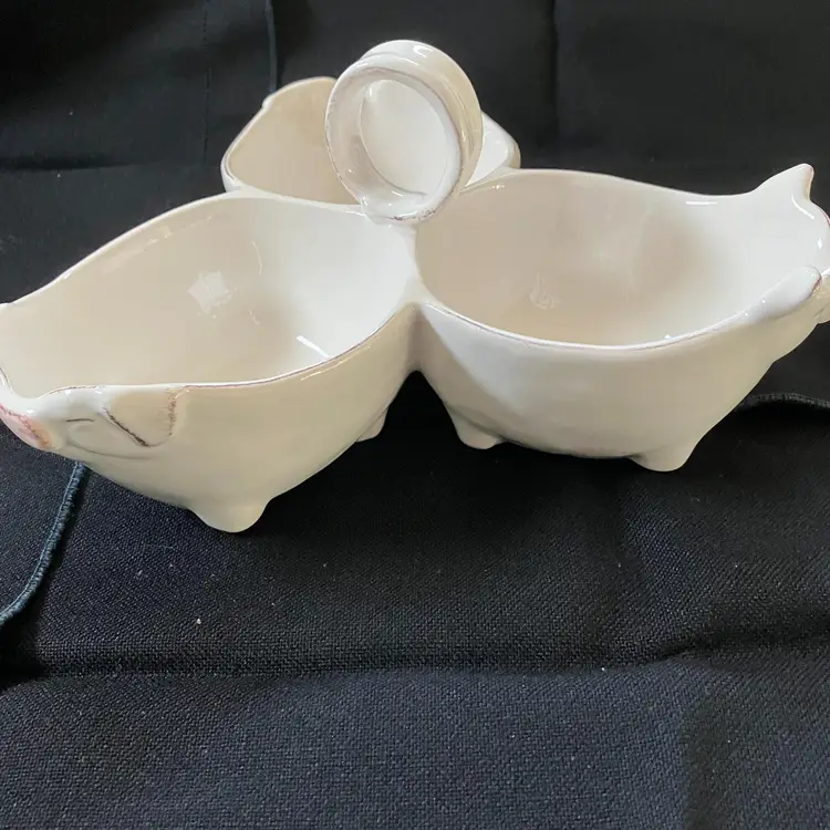 Adorable 3 pig connected bowls for serving snacks, dip or whatever. There is a tiny chip on the pig with the ears that are up on the right ear see photo.