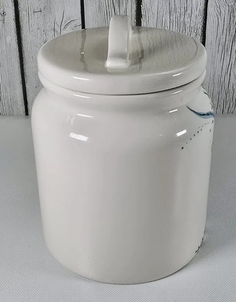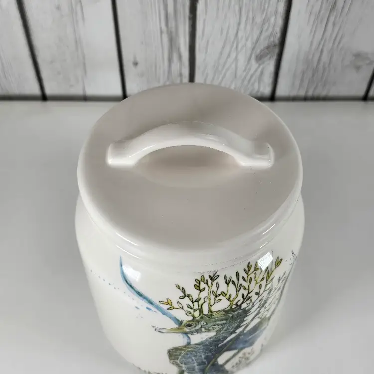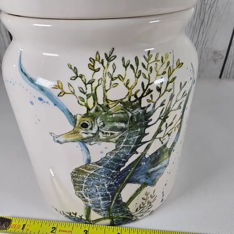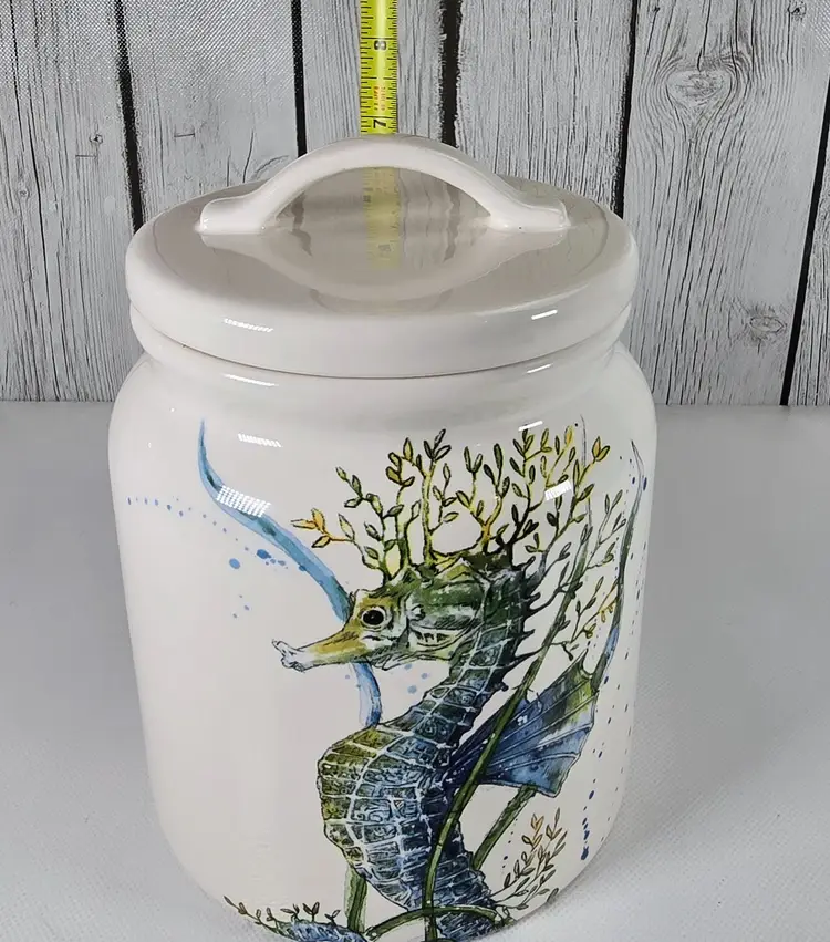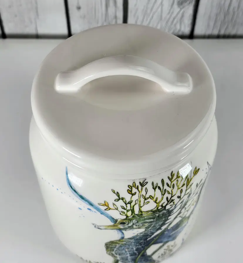 This Pier 1 Sea Life ironstone canister features an elegant raised seahorse to add coastal charm to your kitchen or collection. Measuring 7.5” tall and 5.5” wide, it offers both decorative appeal and functional storage. • Pier 1 Sea Life ironstone canister with raised seahorse motif • Durable ceramic storage jar ideal for kitchen pantry shelf or countertop decor • Kitchen canister style enhances coastal coastal farmhouse or nautical interior trends • Measures approx 7.5” tall x 5.5” wide Era 2000s porcelain collectible