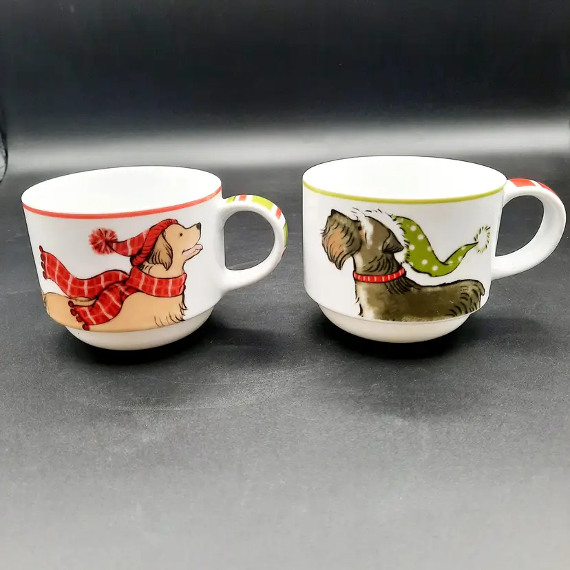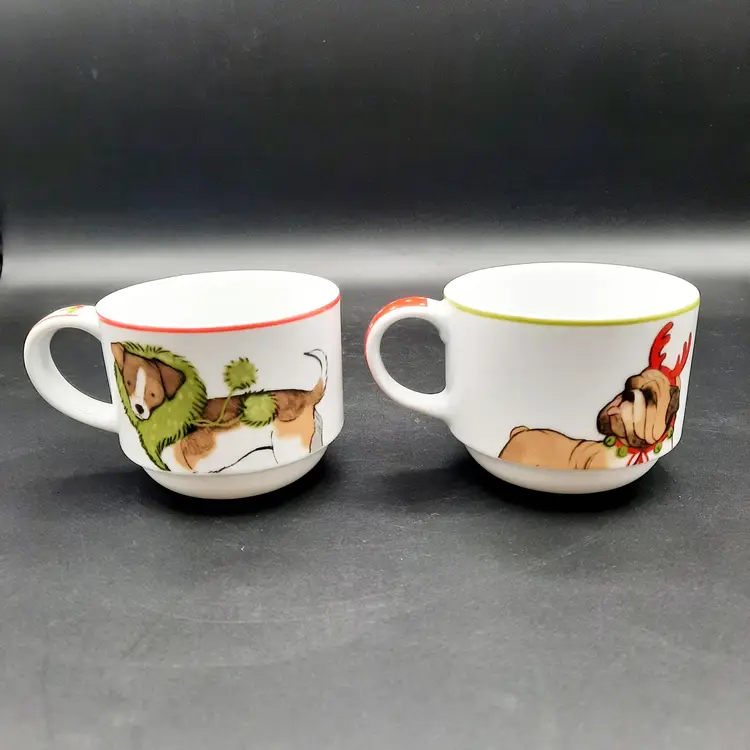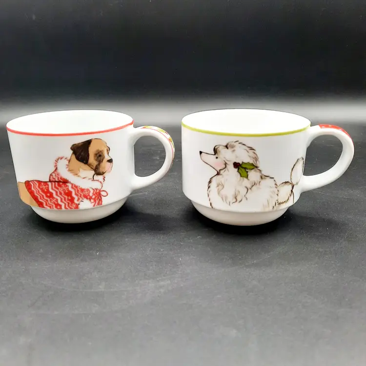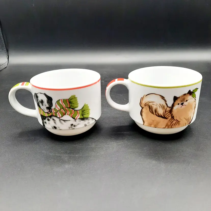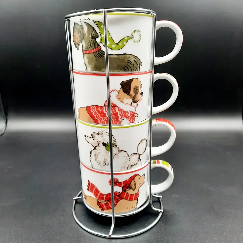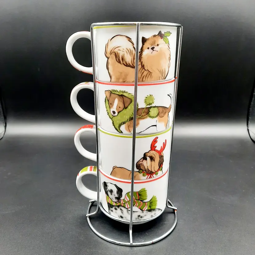 2 3/4"H mugs, 4 mugs have 8 different dog designs, excellent condition - one mug has a few dark specks in glaze, metal stand does have a few rust spots