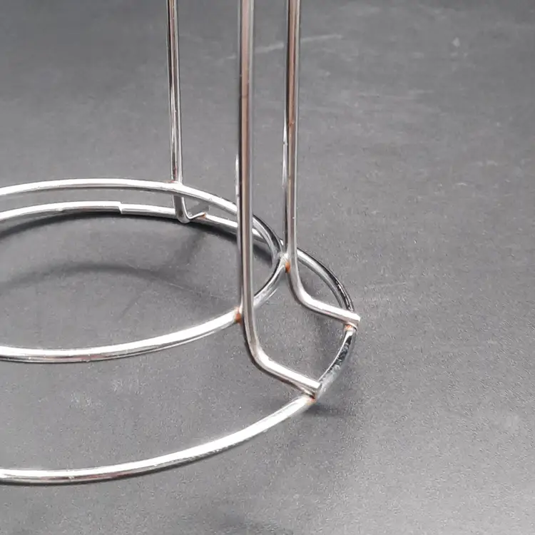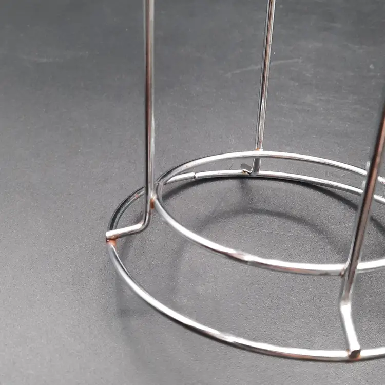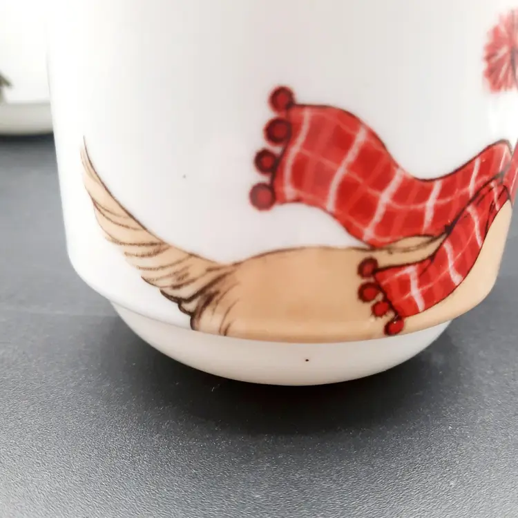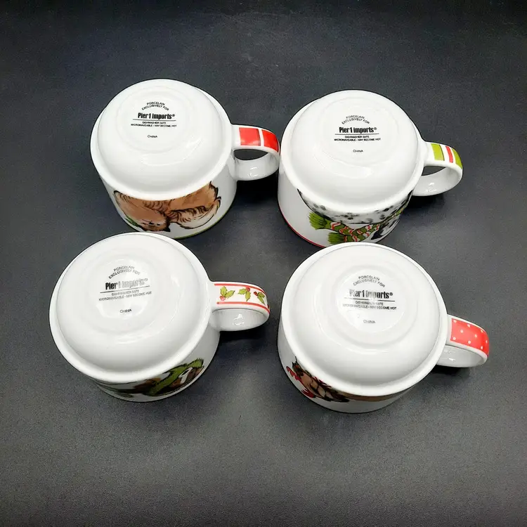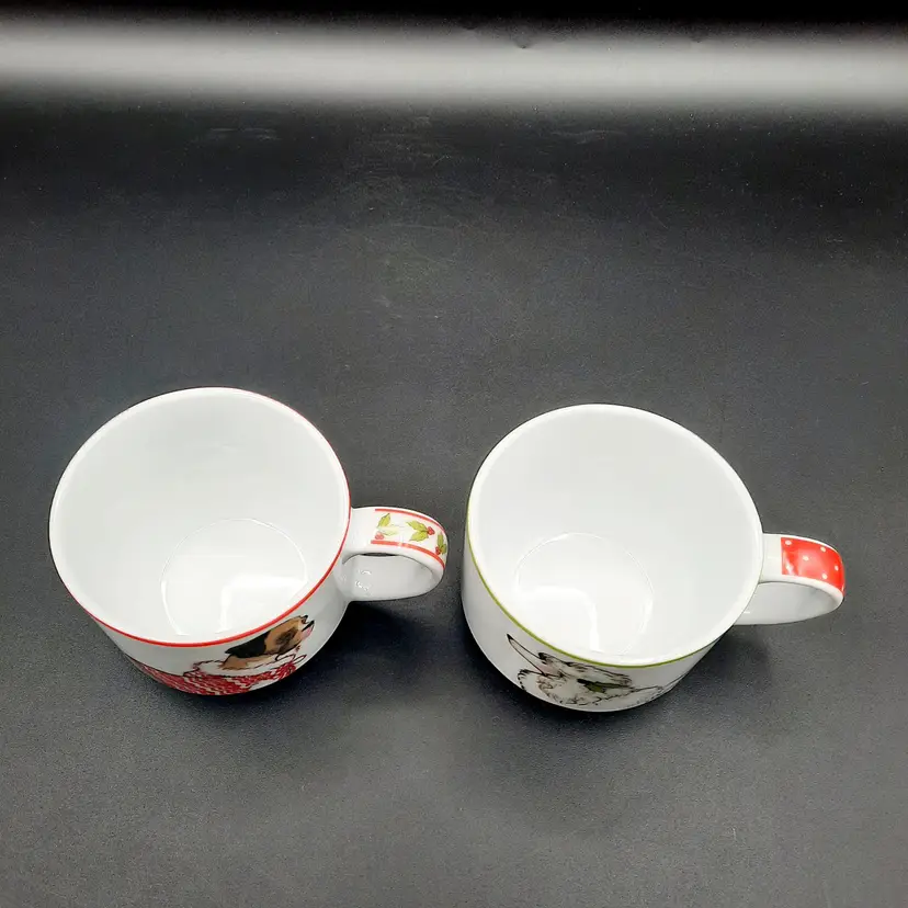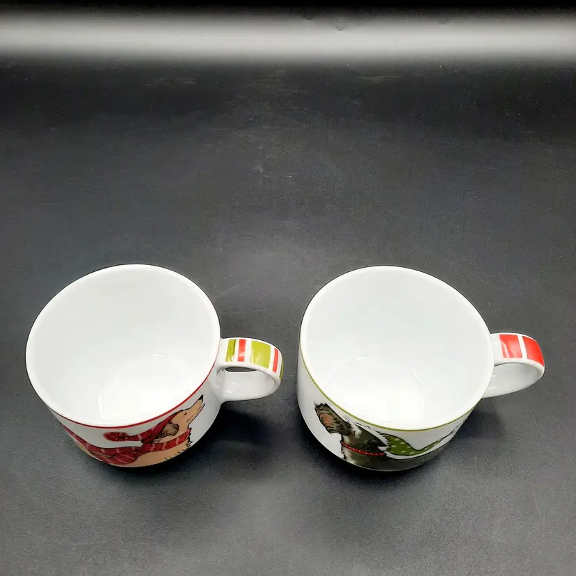 2 3/4"H mugs, 4 mugs have 8 different dog designs, excellent condition - one mug has a few dark specks in glaze, metal stand does have a few rust spots