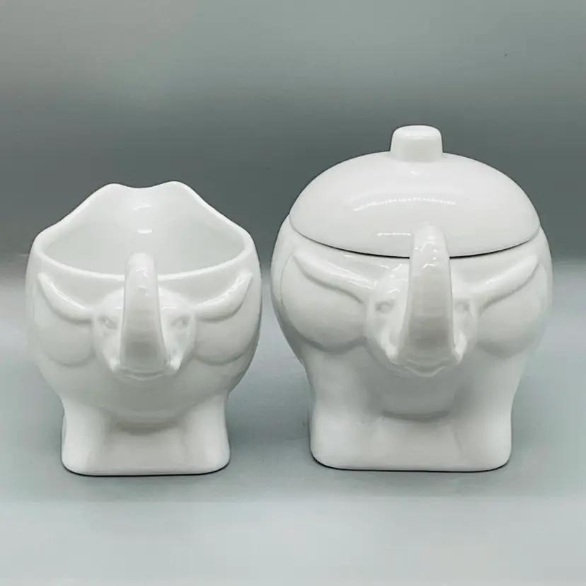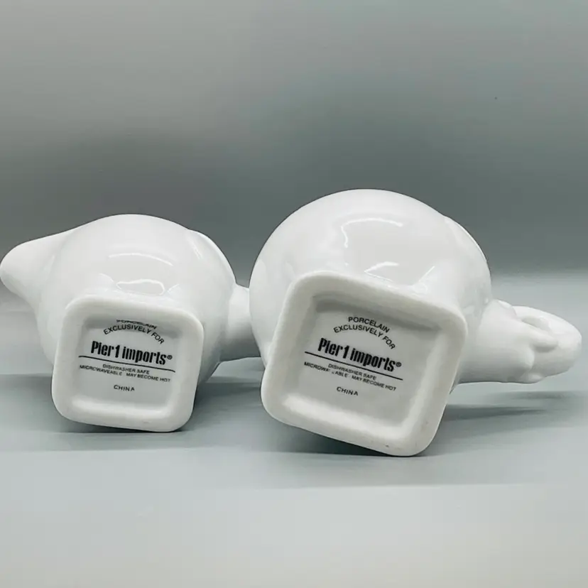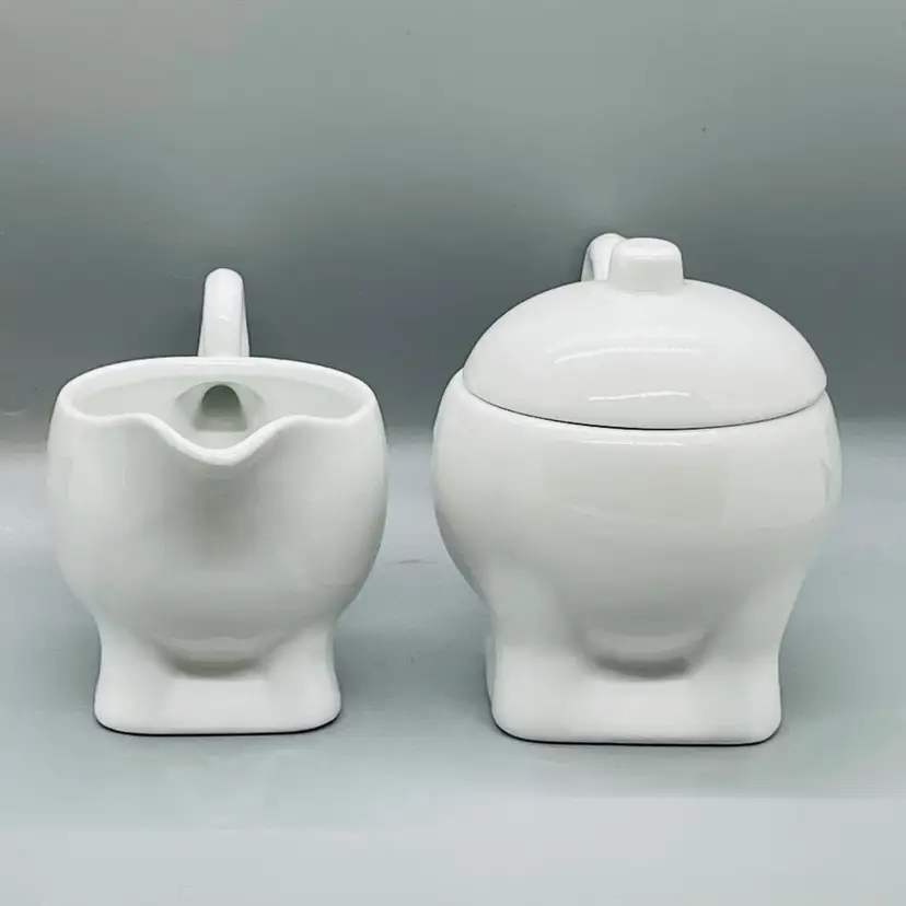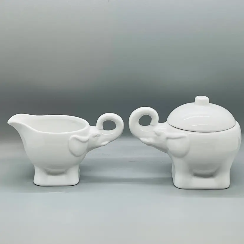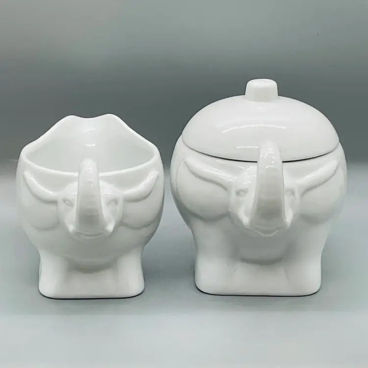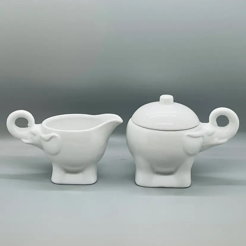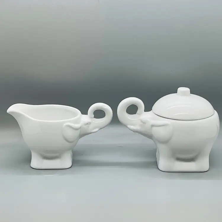 This is a Pier 1 White Elephant Creamer & Sugar Bowl Set with lid. Both elephants have their trunks UP, which is supposed to bring good luck.