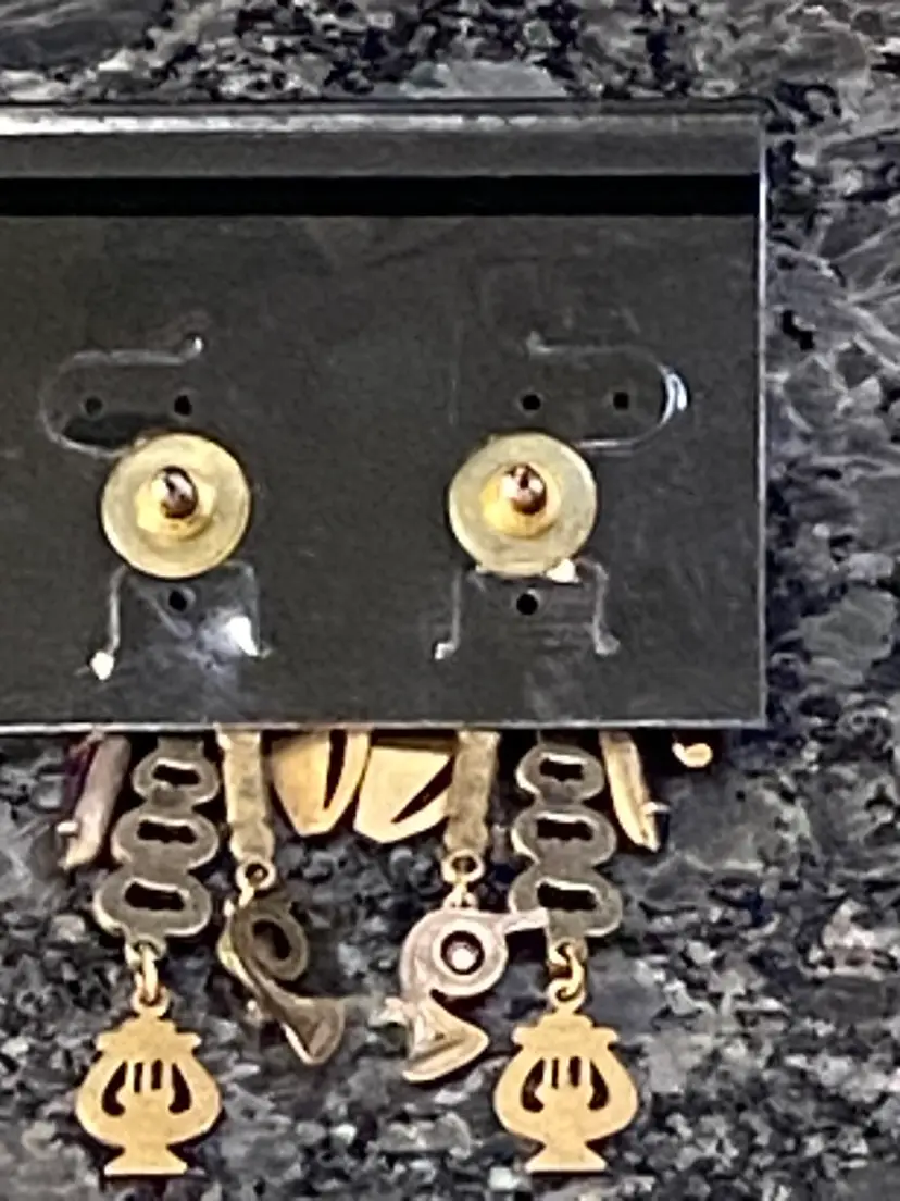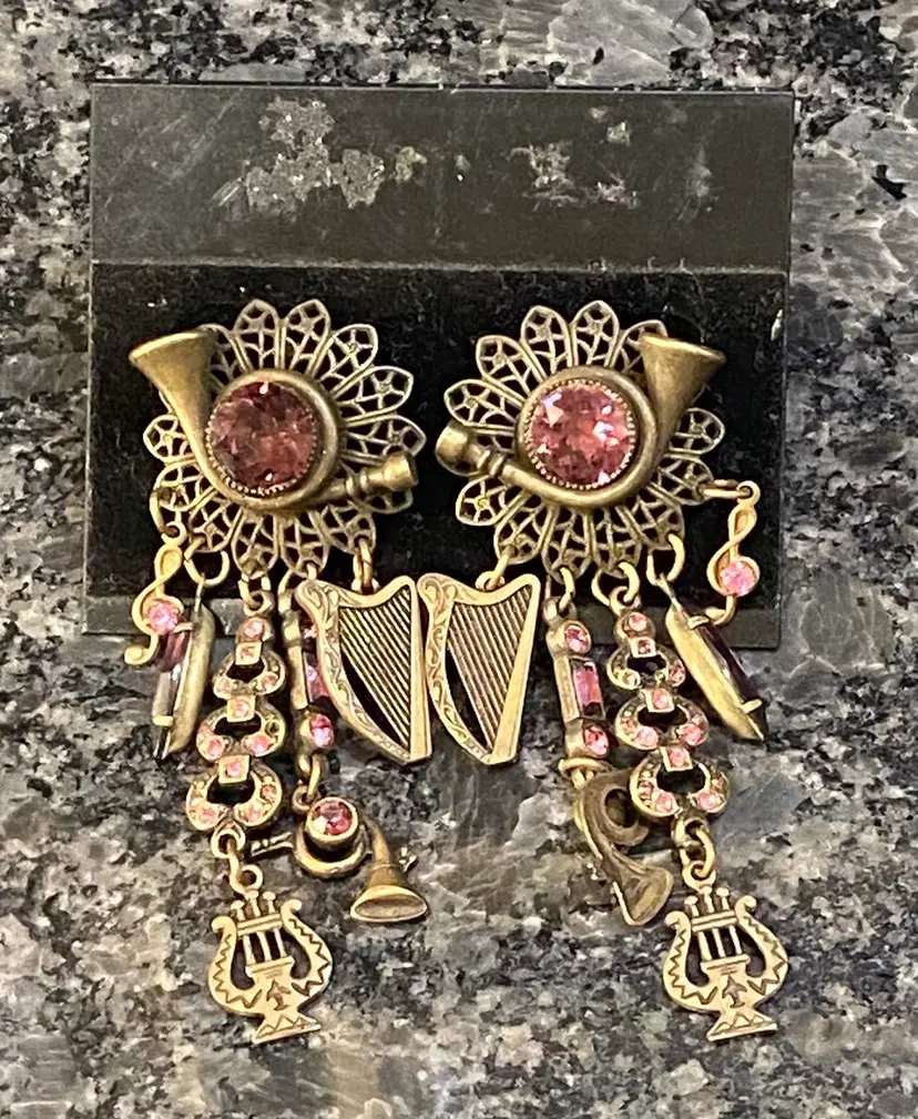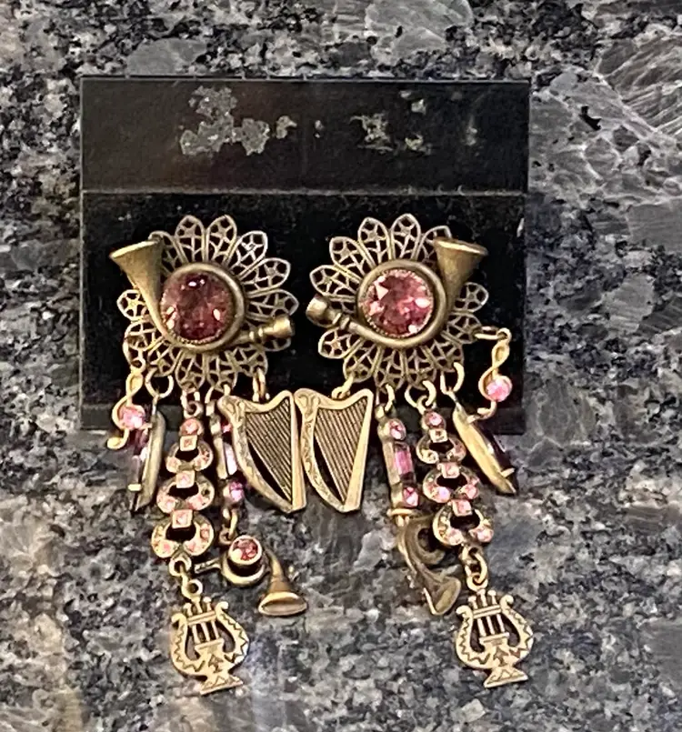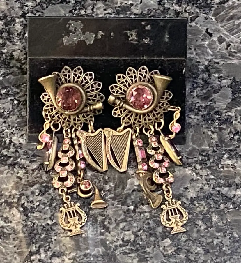 Pierced earrings featuring musical instruments motifs And rhinestone accents. Costume jewelry.. jewelry needs cleaning. Estate sale find