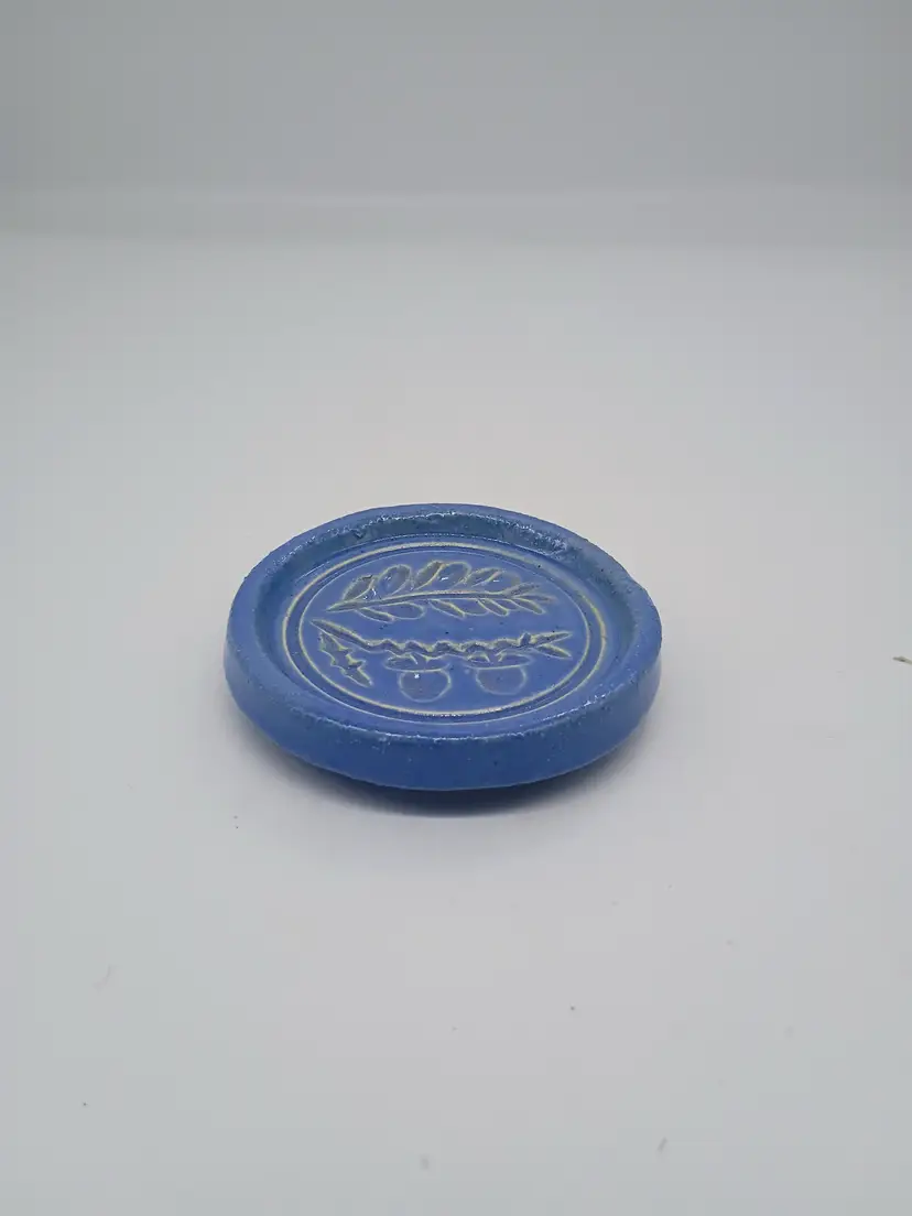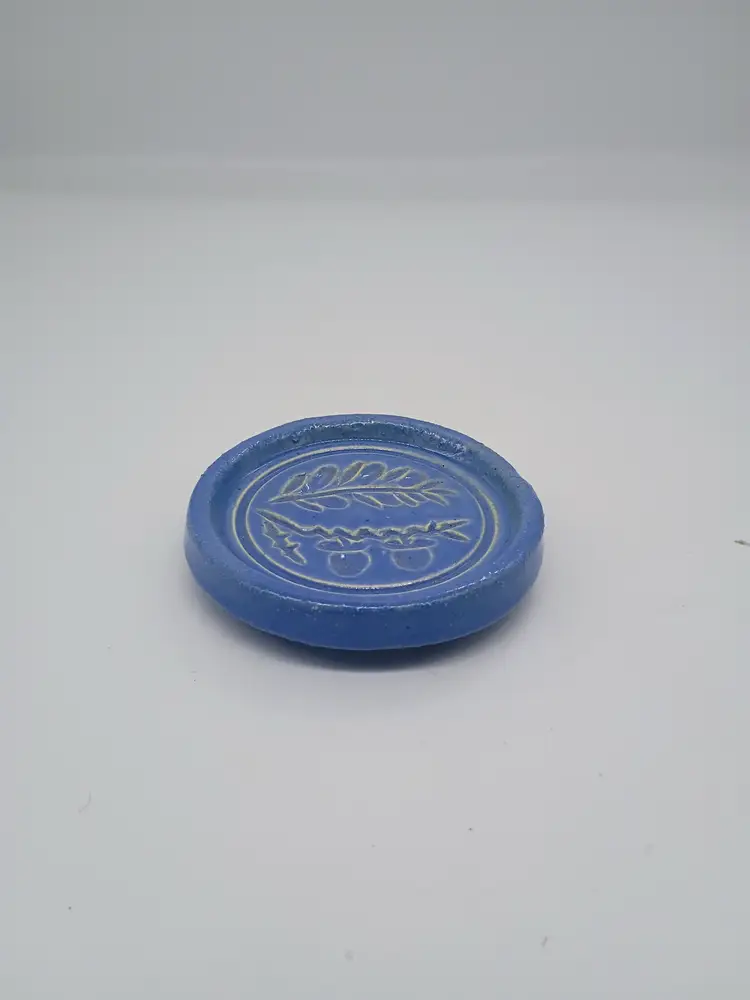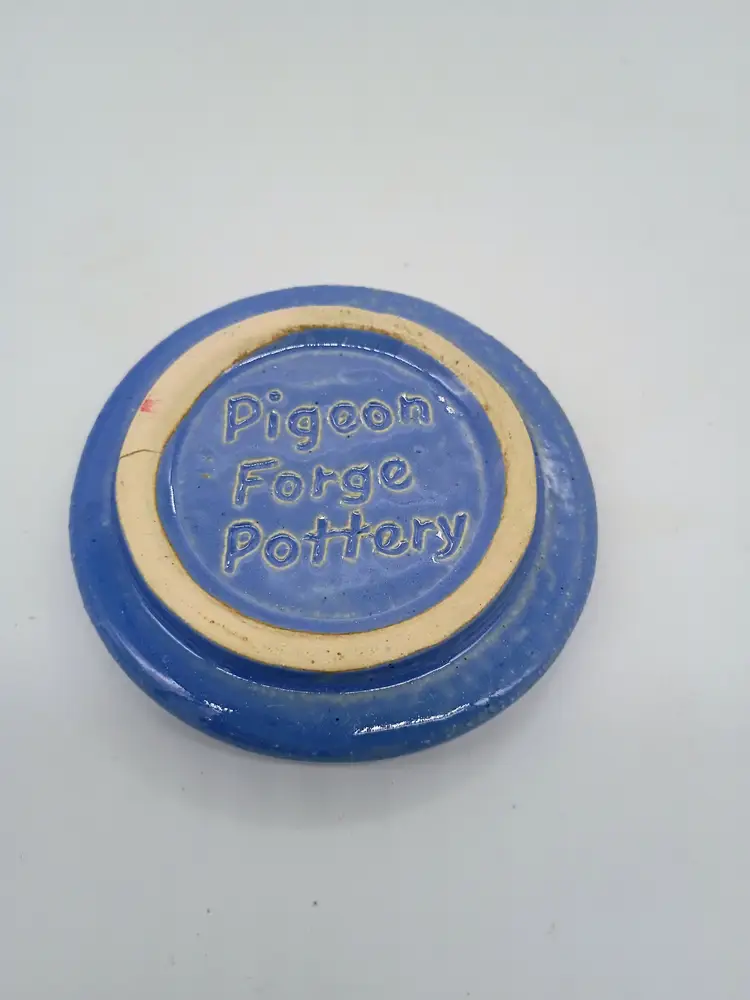Pigeon Forge Pottery Butter Mold Print Coaster Light Blue Oak Leaf Acorn Pattern. These were made between late1970's into late 1990's . This is 3.5" in diameter and is 0.75 inches tall at rim. While this was sold as a coaster it can also be used as a trinket or pin dish. This is preowned, No chips cracks or flea bites, no damage to design. Excellent condition. Ships USPS domestically and International Shipping globally