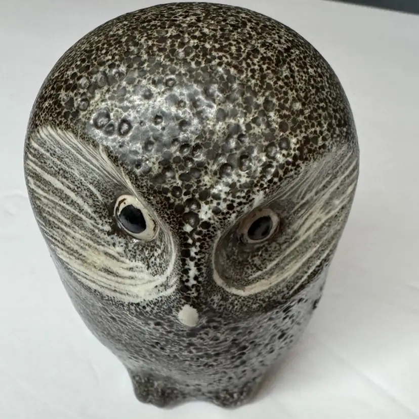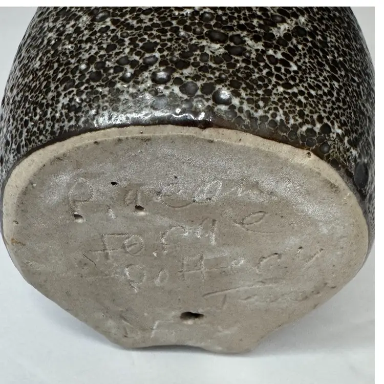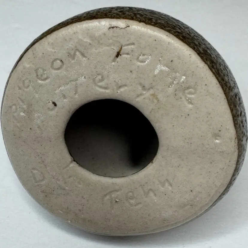 This set of 2 Pigeon Forge Pottery owls feature a dark brown spotted textured surface. Pigeon Forge pottery is from Tennessee. Each owl is marked with the brand's hallmark incised backstamp ensuring its authenticity. The largest owl measures 4 3/4" x 3 1/4". In excellent condition!