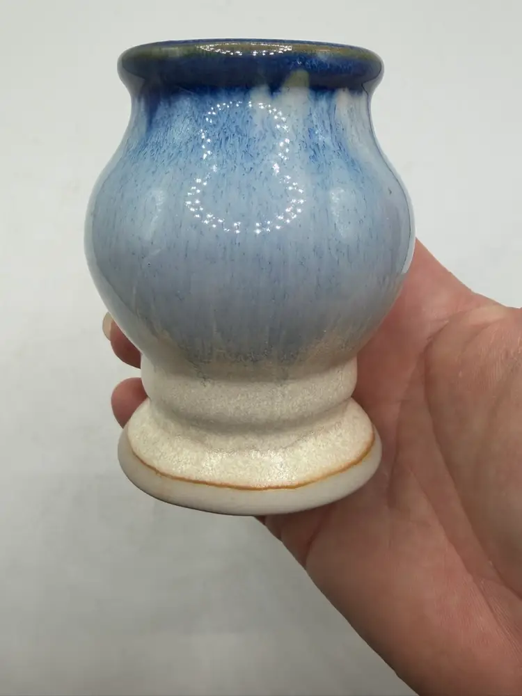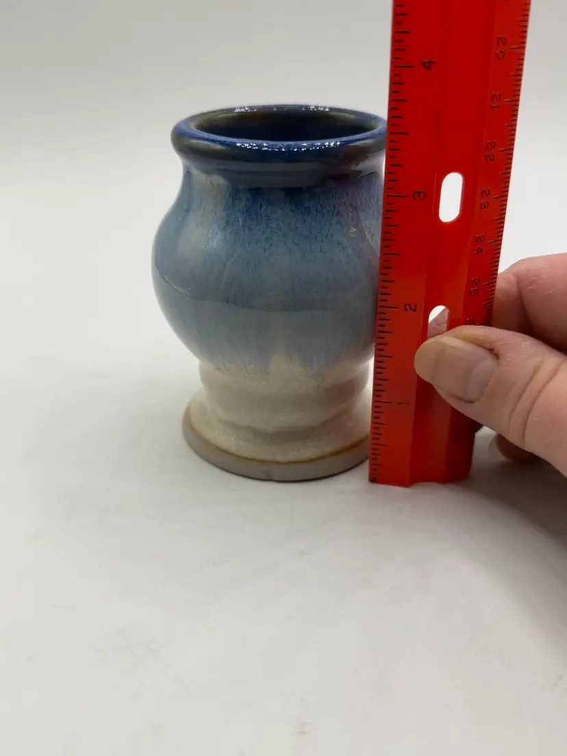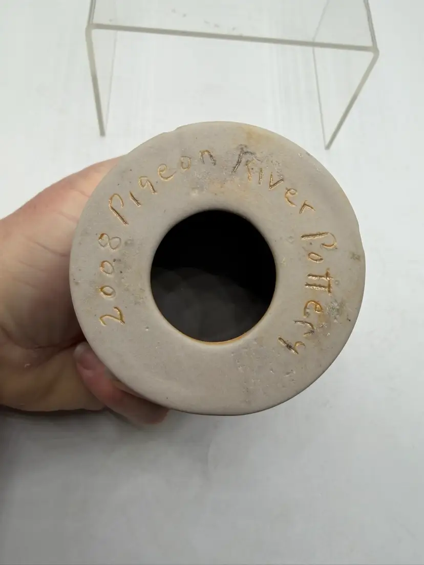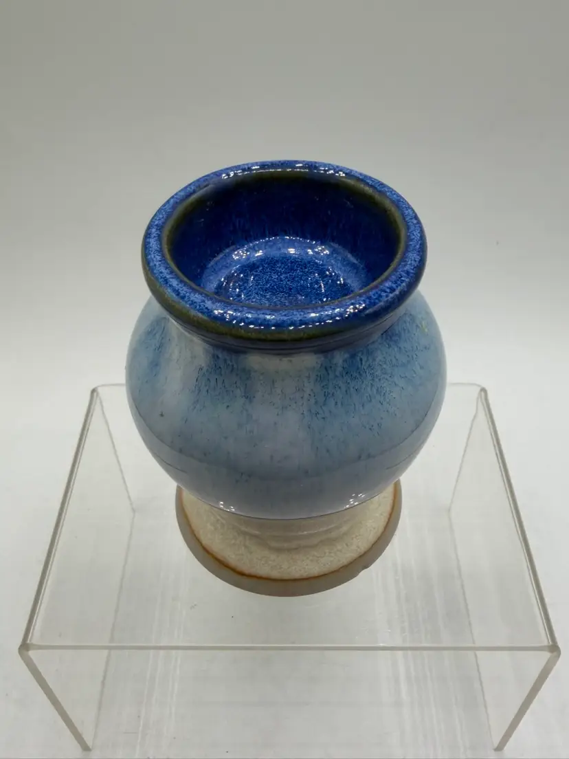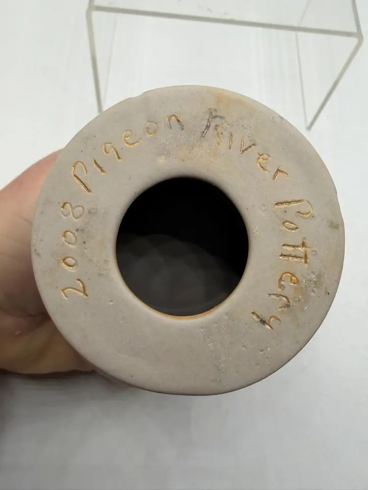 The Pigeon River Pottery 2008 Blue Drip Glaze Art Pottery Votive Candle Holder is a unique and handmade piece of decorative pottery from the United States. Signed by the artist, this abstract-themed candle holder features a beautiful blue drip glaze, adding a touch of artistic flair to any space. Made of clay using traditional pottery techniques, this original piece stands at 3.5 inches tall and is suitable for holding votive candles. Perfect for adding a rustic and artistic touch to your home decor, this candle holder captures the essence of art pottery production in the 2000s.