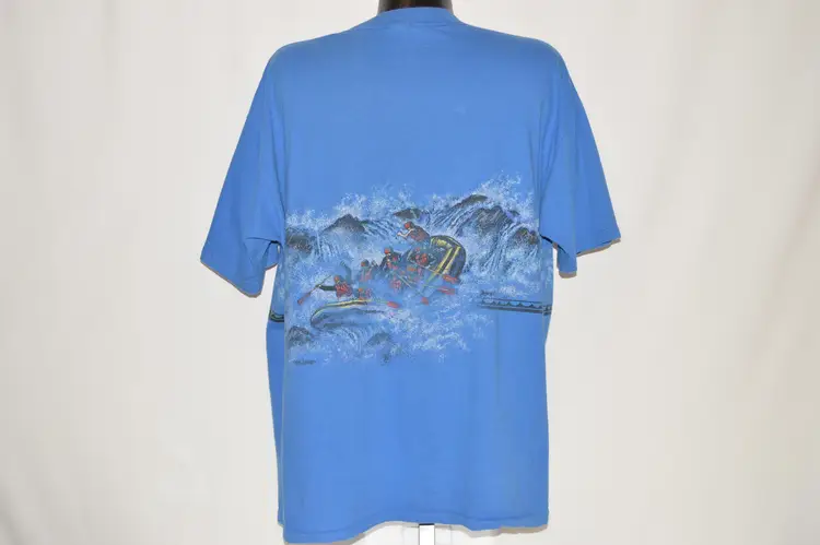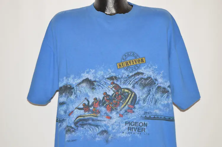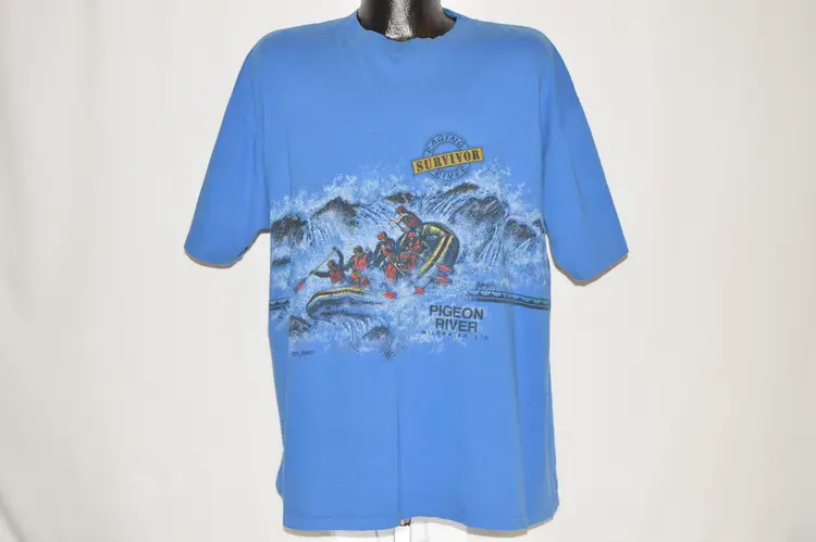 24x28, souvenir t-shirt from a white water rafting trip down the Pigeon River in Tennessee. Features wraparound graphics and says, "Raging River Survivor"