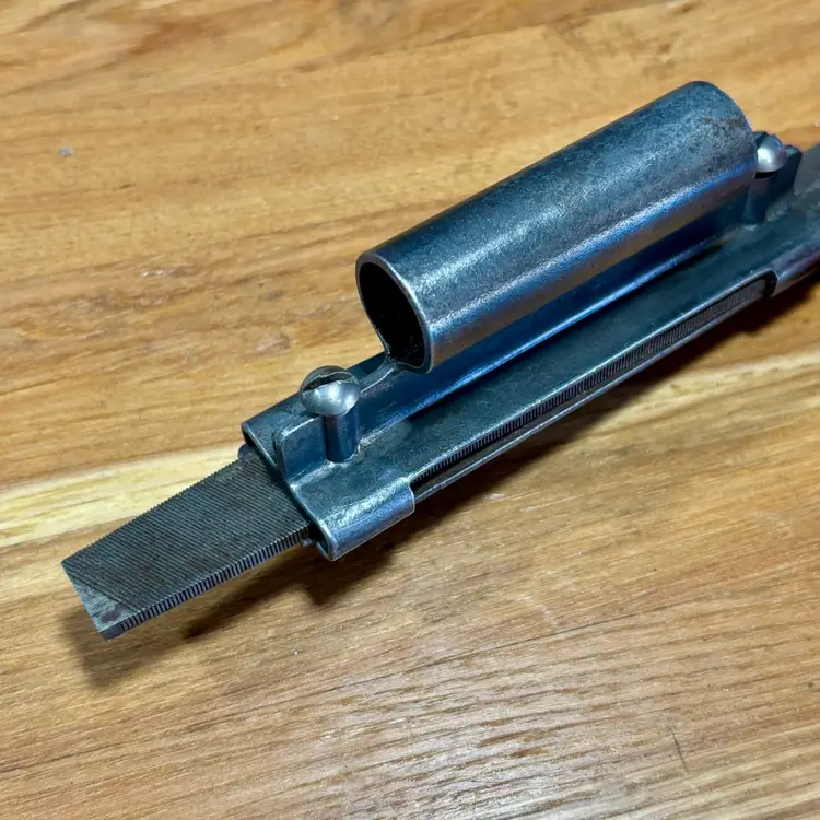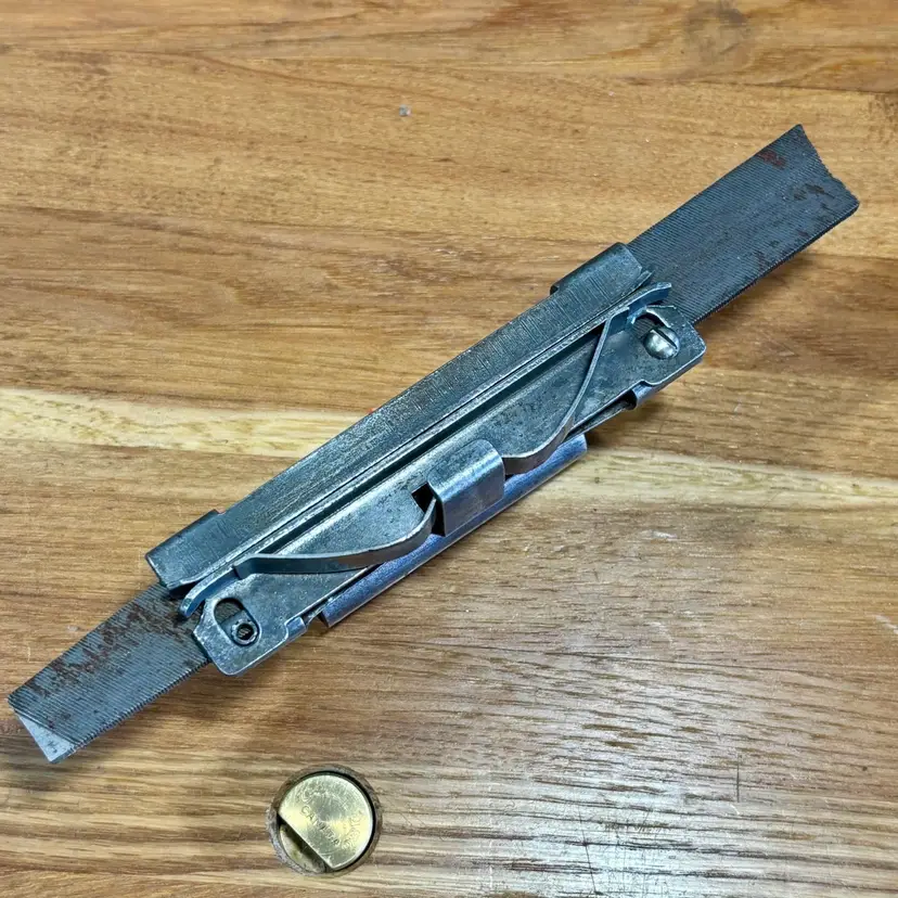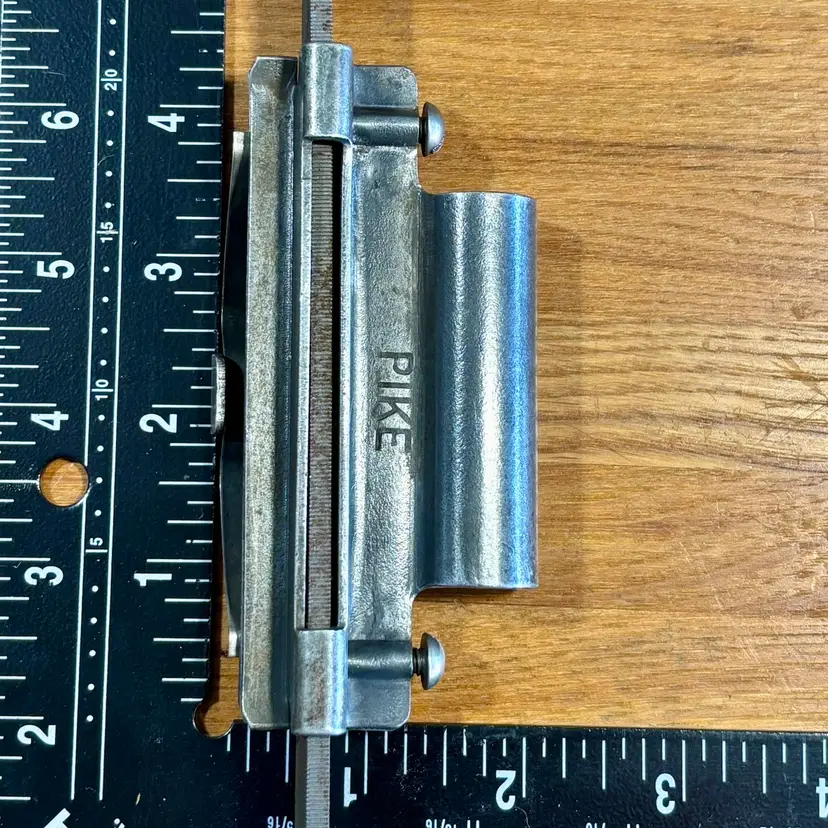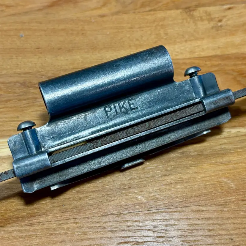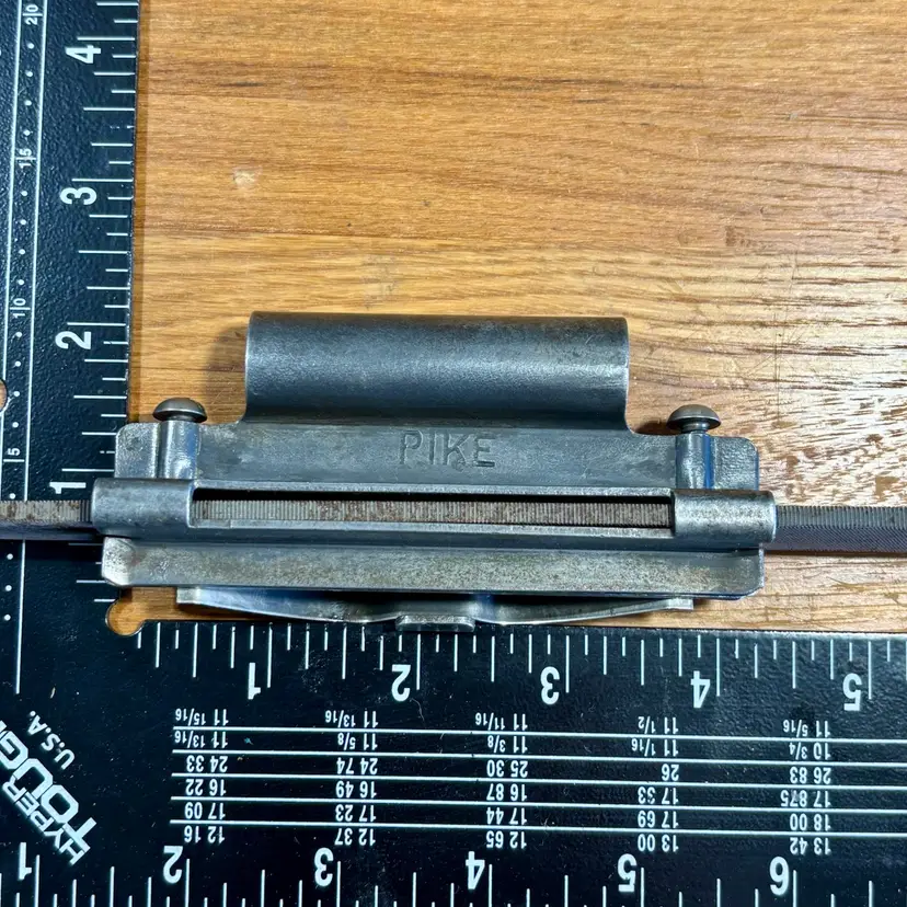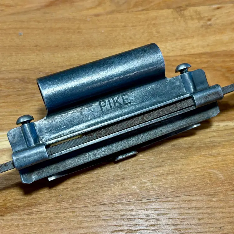 Really nice Pike brand Hand Saw Jointer with File. This jointer is in great shape, but is missing one small screw that holds the spring plate in place. This does not appear to affect the functionality and could likely be replaced with a trip to your local hardware store. I just don't have time to get that done. The jointer features a really nice spring loaded mouth to make sure the saw blade is secure and fixed as you file down the length. See pictures for details. Let me know if you have any questions.