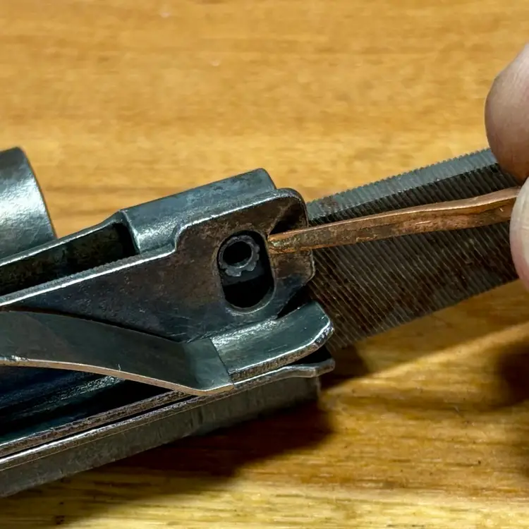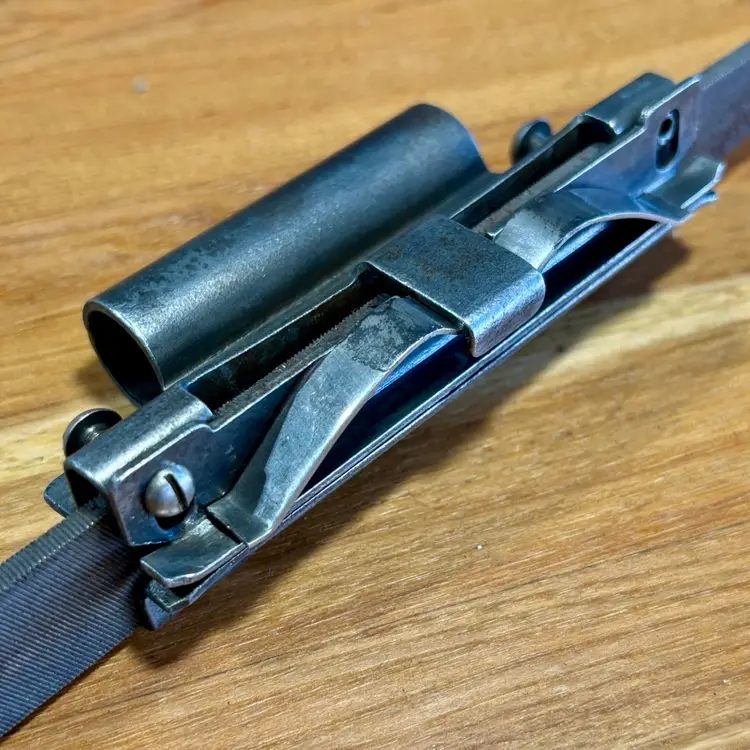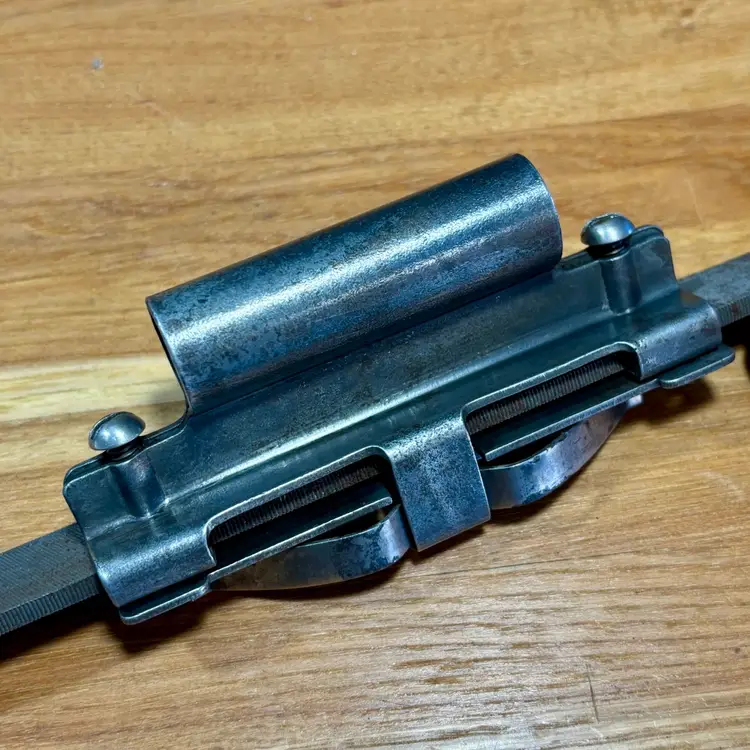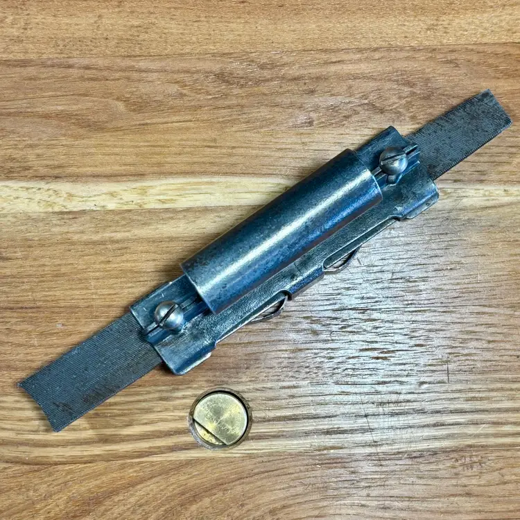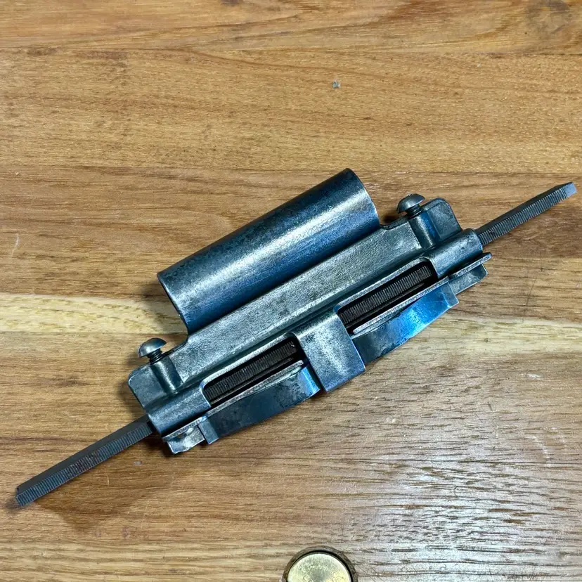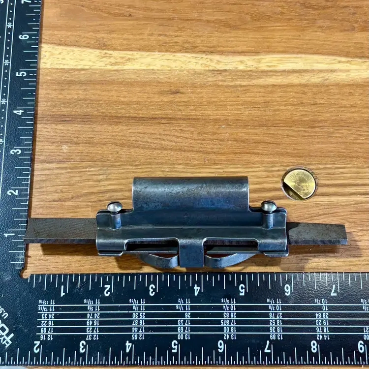 Really nice Pike brand Hand Saw Jointer with File. This jointer is in great shape, but is missing one small screw that holds the spring plate in place. This does not appear to affect the functionality and could likely be replaced with a trip to your local hardware store. I just don't have time to get that done. The jointer features a really nice spring loaded mouth to make sure the saw blade is secure and fixed as you file down the length. See pictures for details. Let me know if you have any questions.