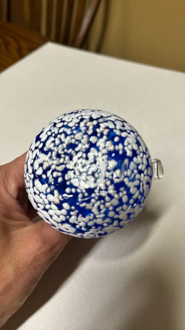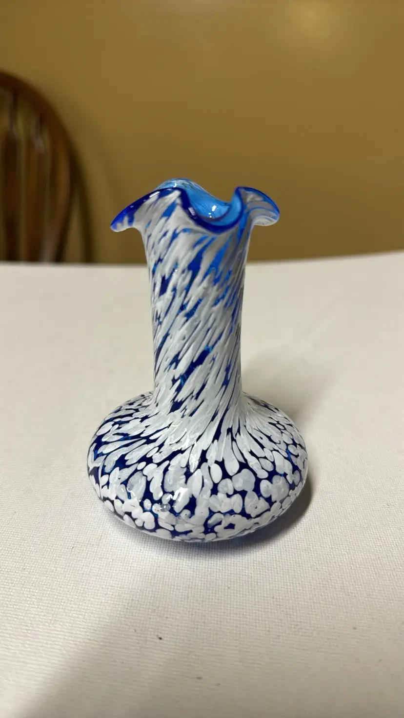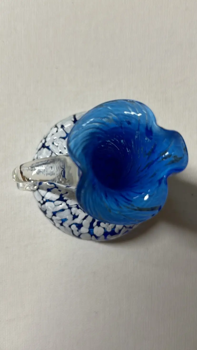 Vintage MCM 60's pilgrim Art glass small pitcher hand blown splatter white on blue 4.25” tall 3” wide No breaks or chips (281115246)