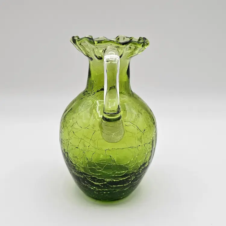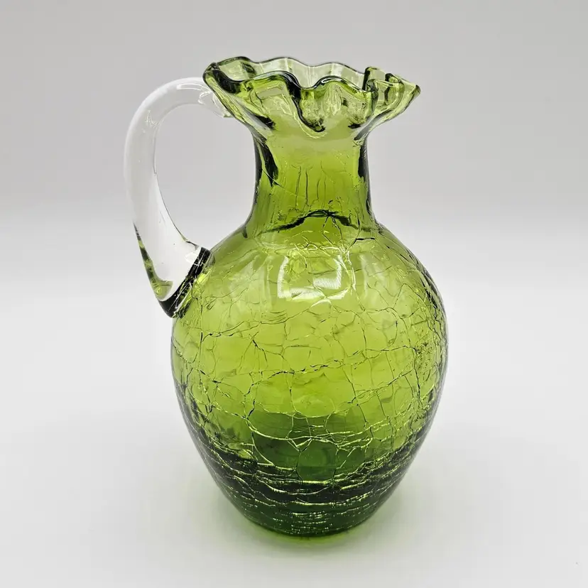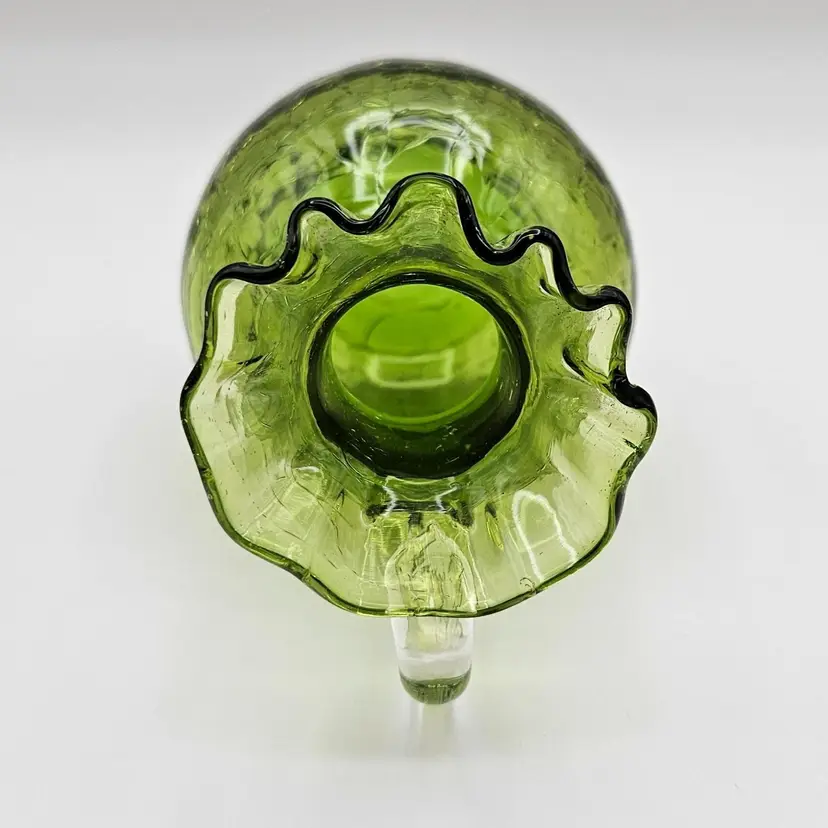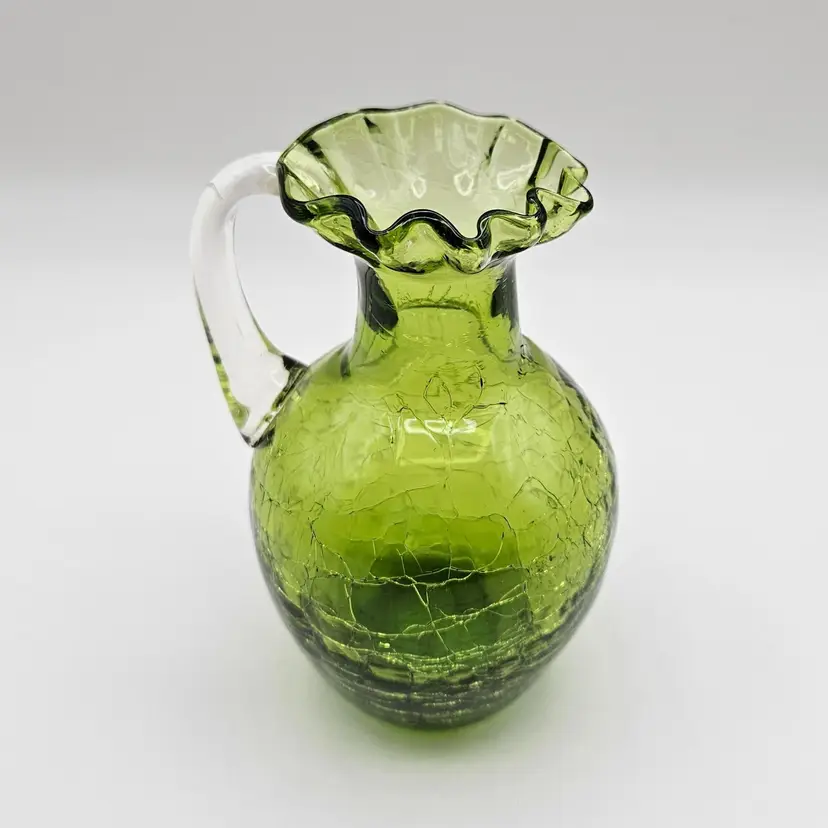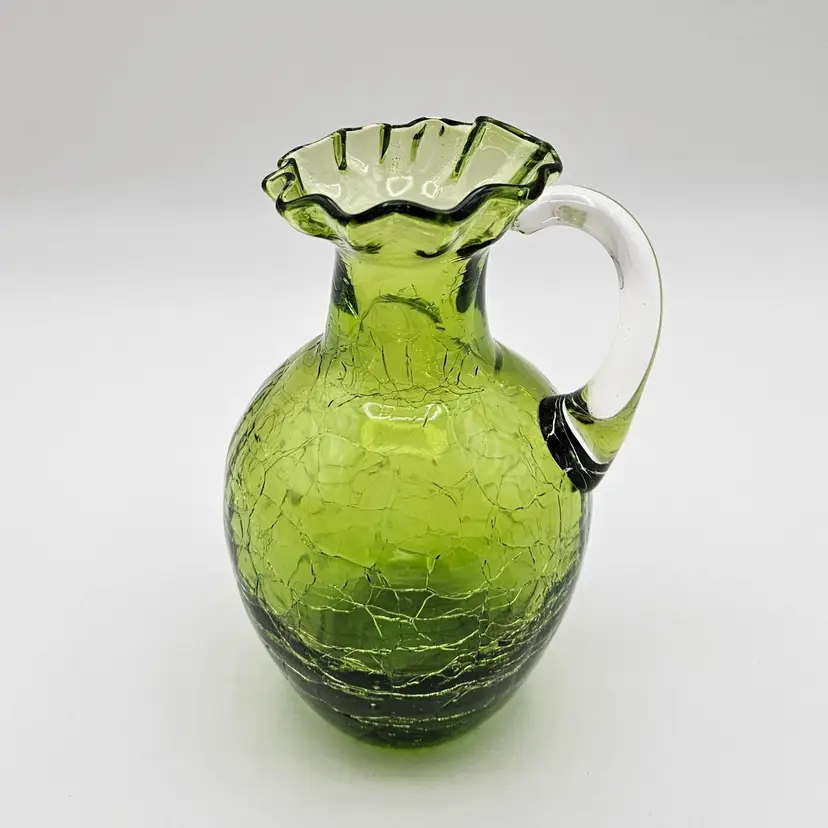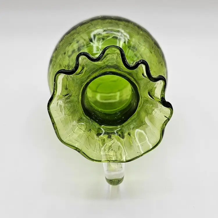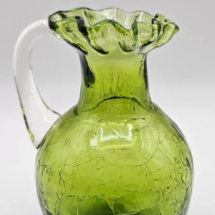 Pilgrim Crackle Glass Pitcher Vase Green Hand Blown Art Glass Applied Clear Handle Rigaree Ruffle Rim Vintage