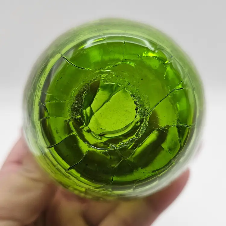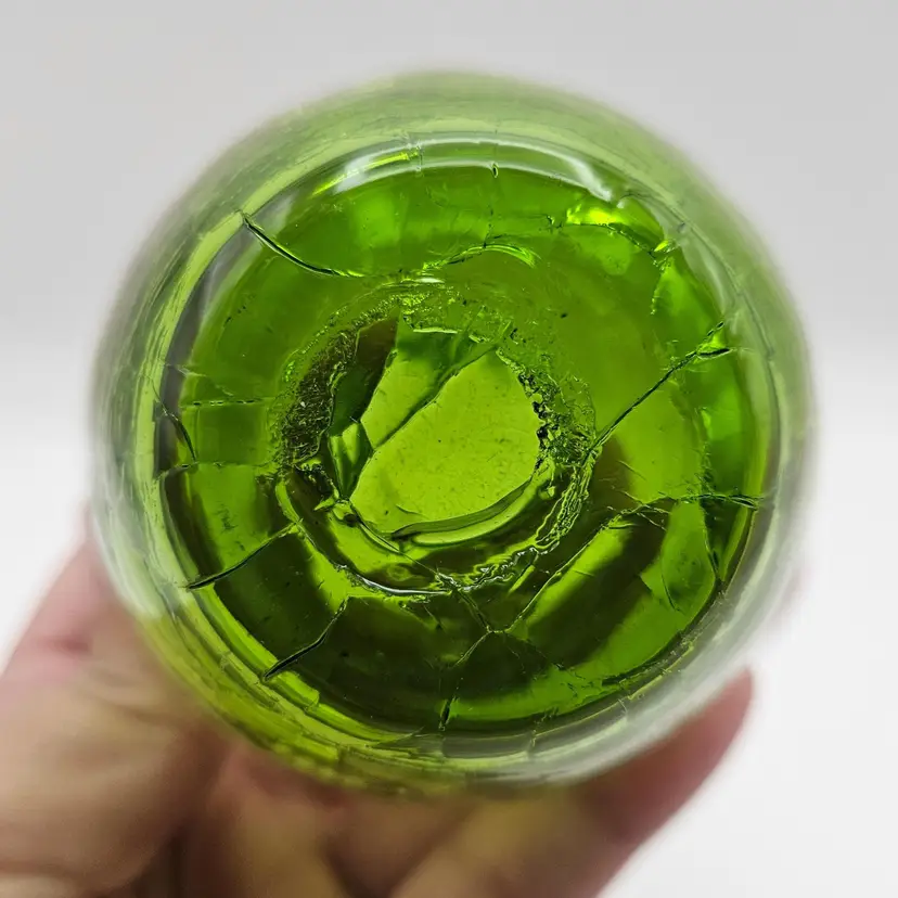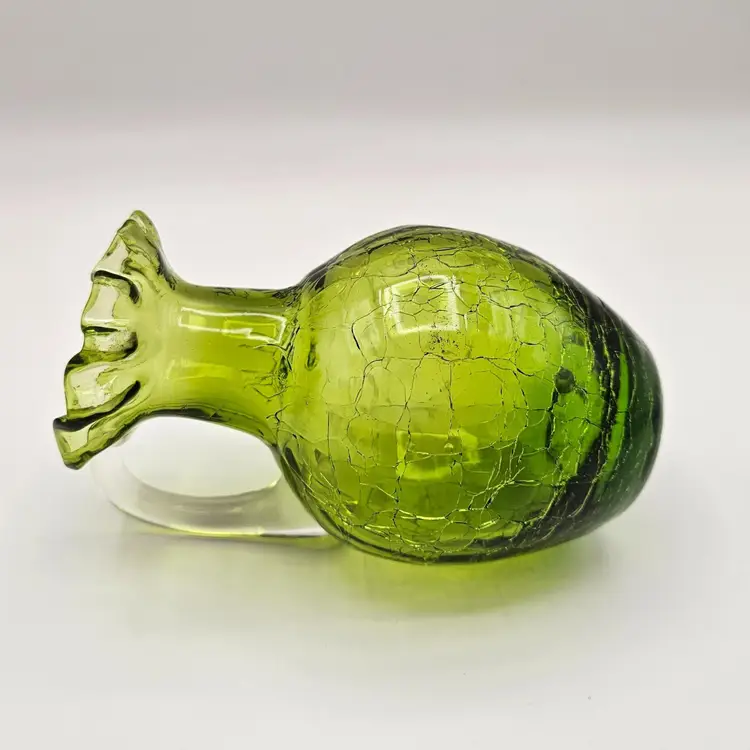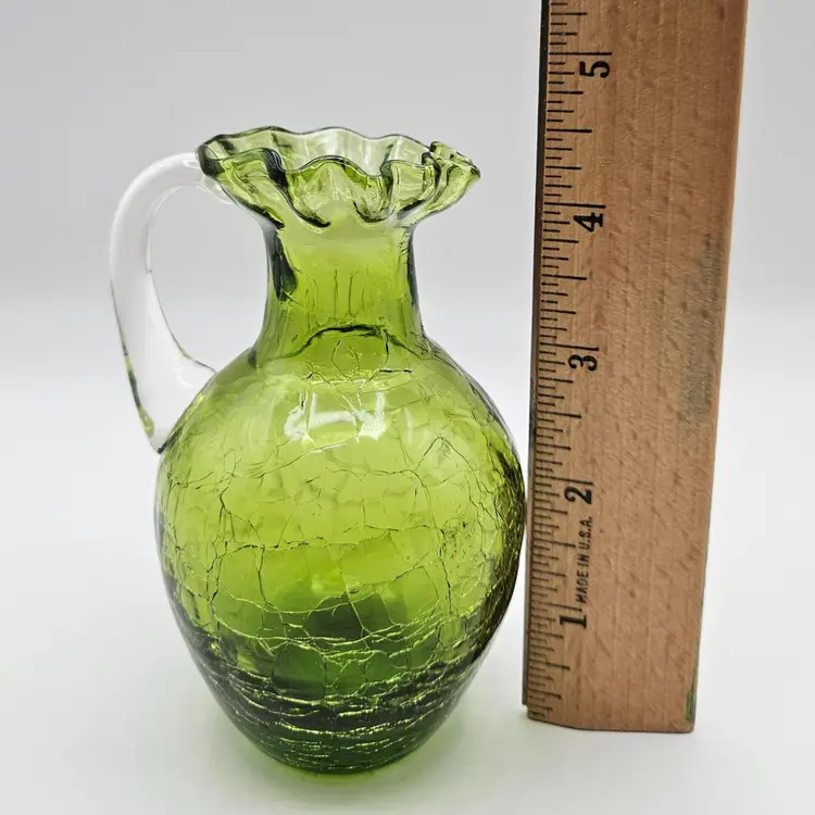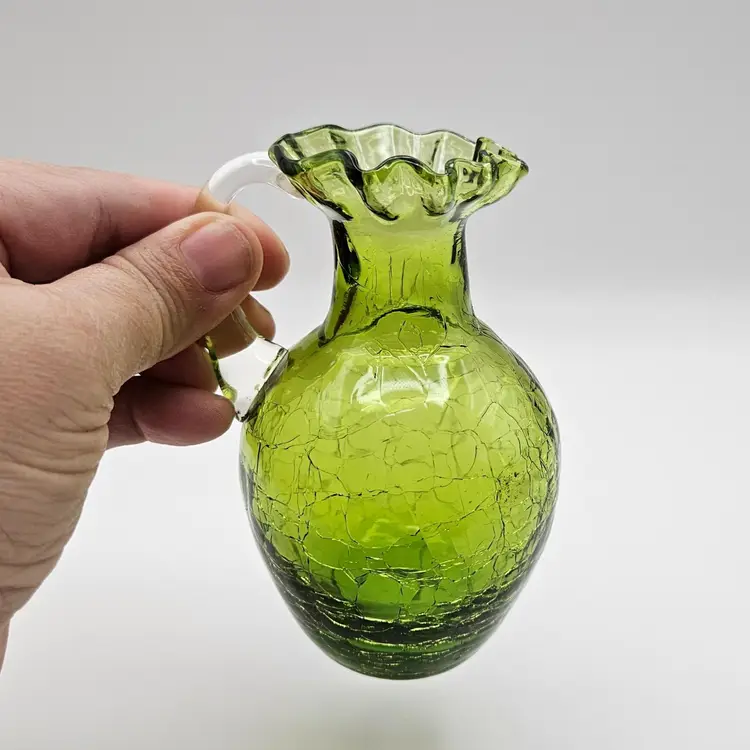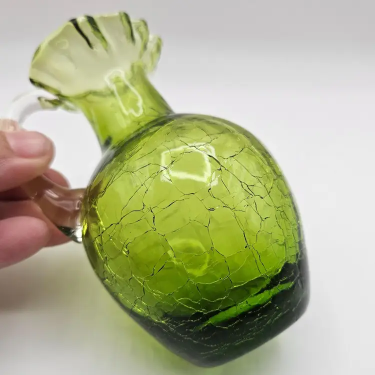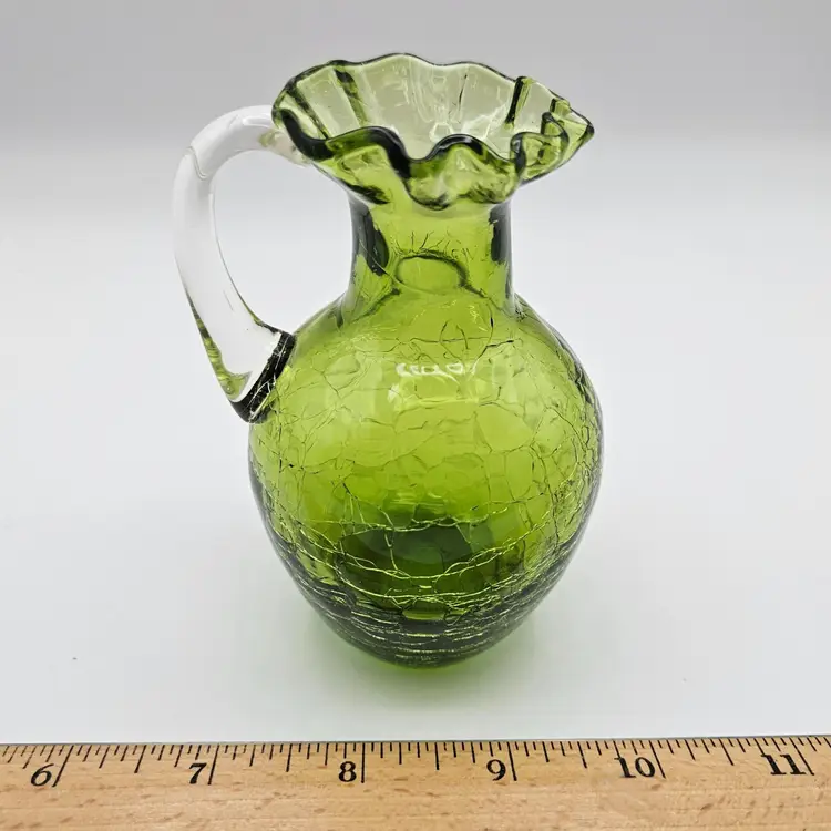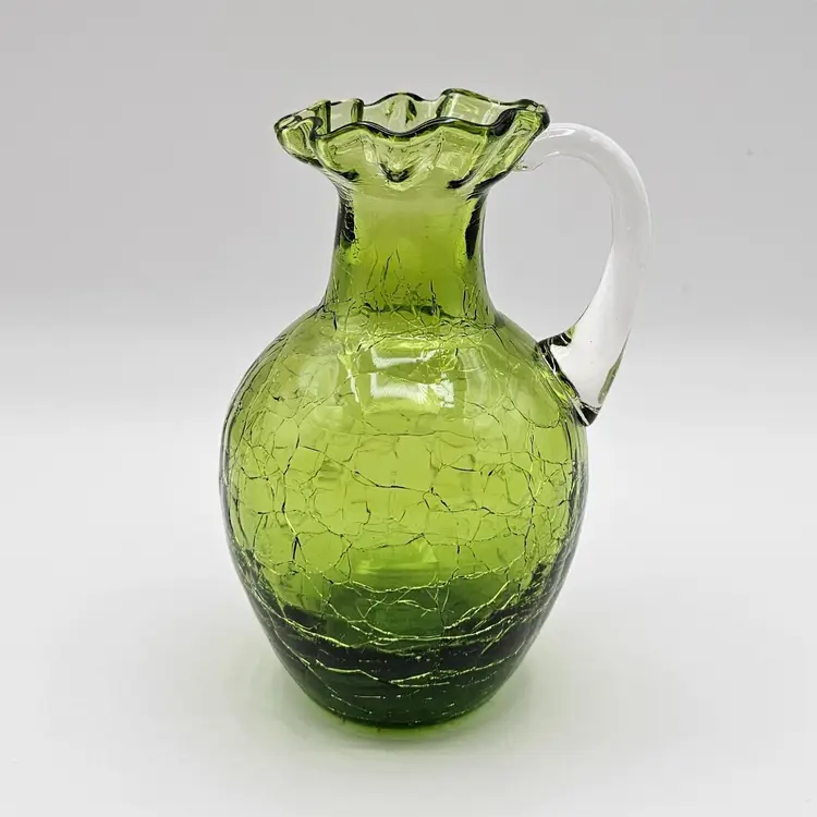 Pilgrim Crackle Glass Pitcher Vase Green Hand Blown Art Glass Applied Clear Handle Rigaree Ruffle Rim Vintage