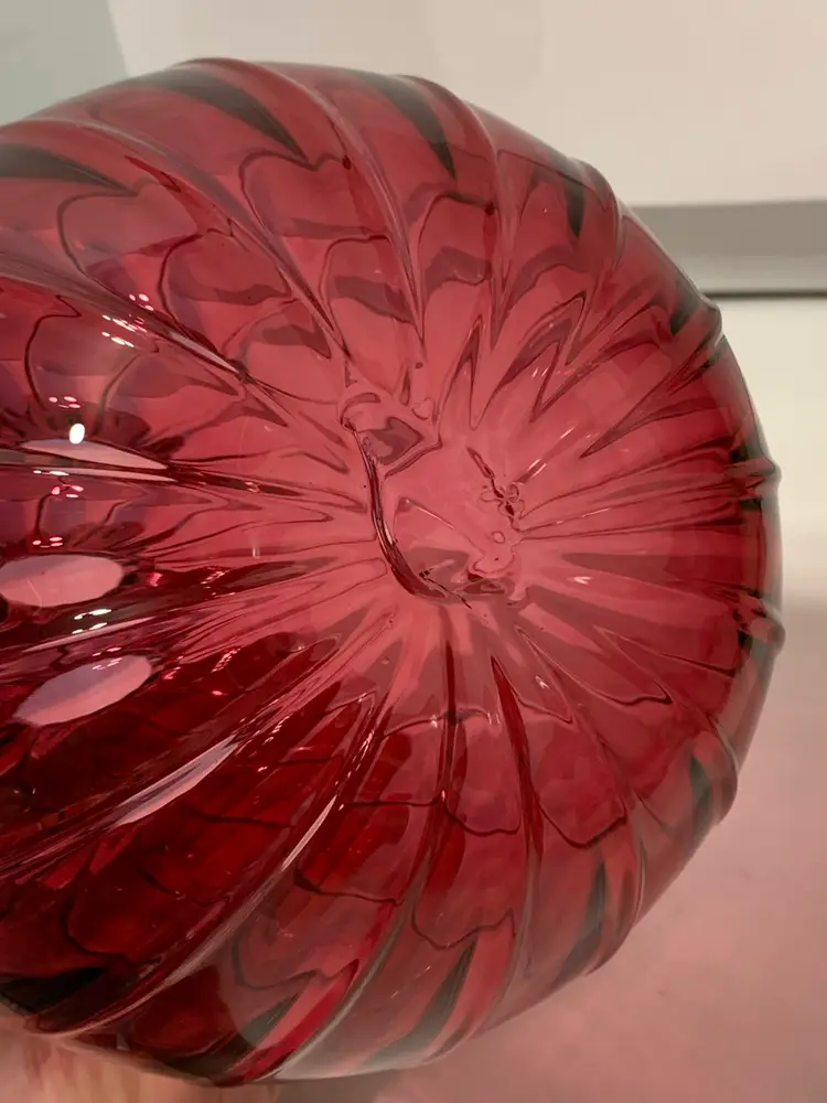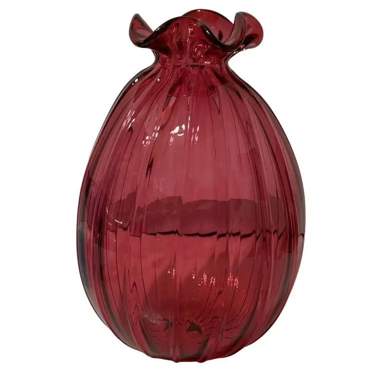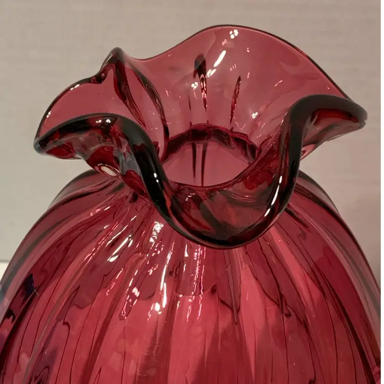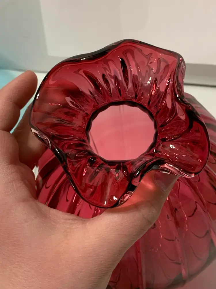 Lovely 9” vase with ruffled rim. There is a large mold mark line in the glass. Free from cracks or chips. Sold as is.
