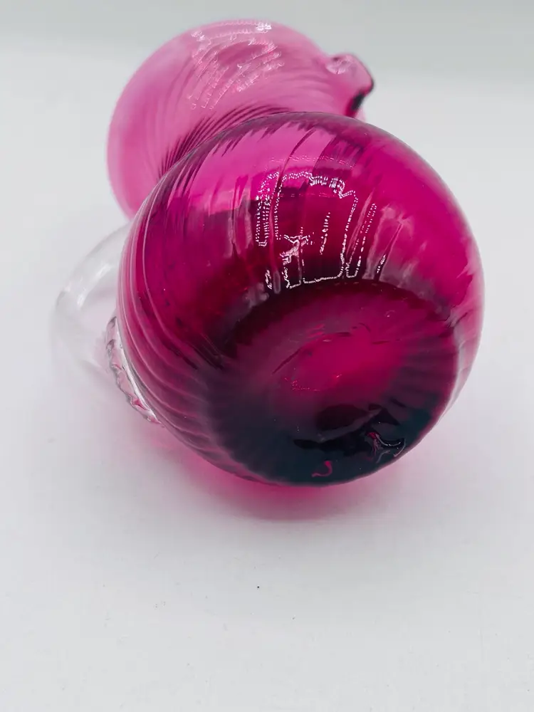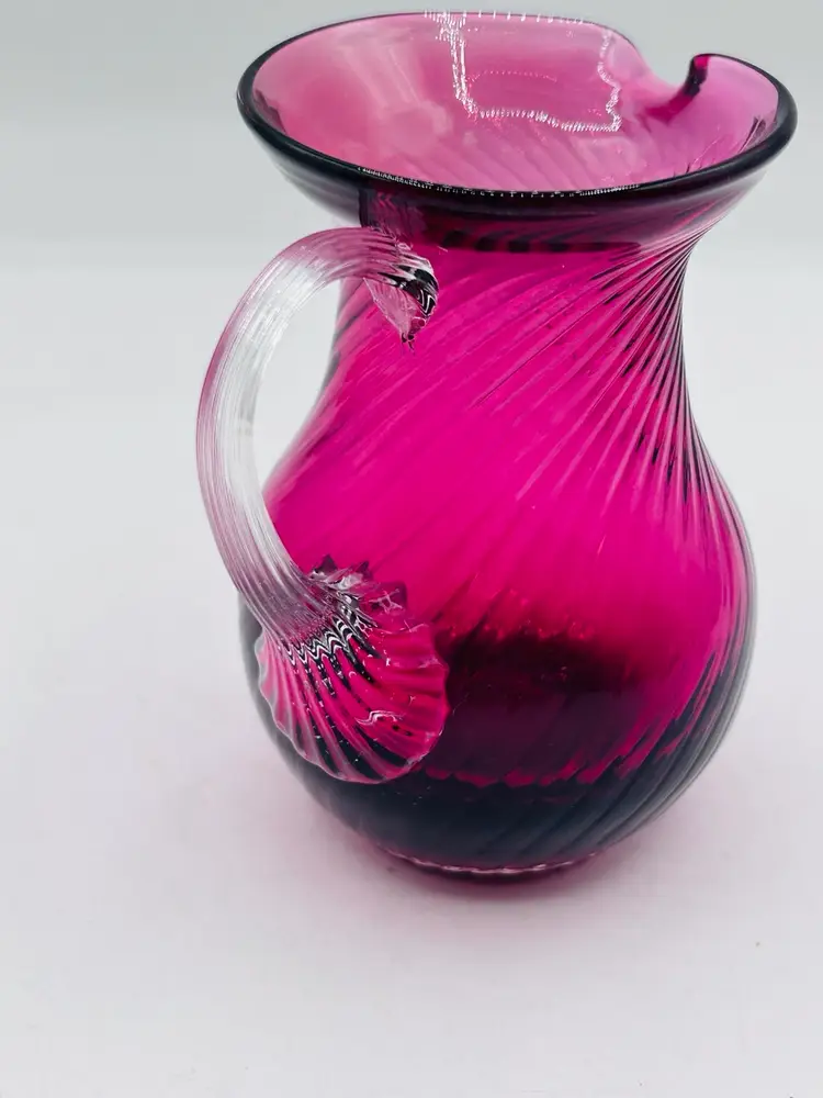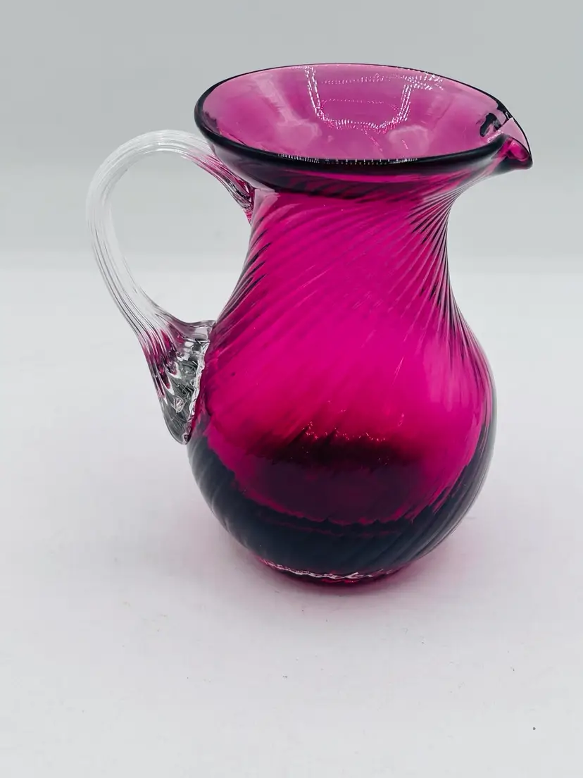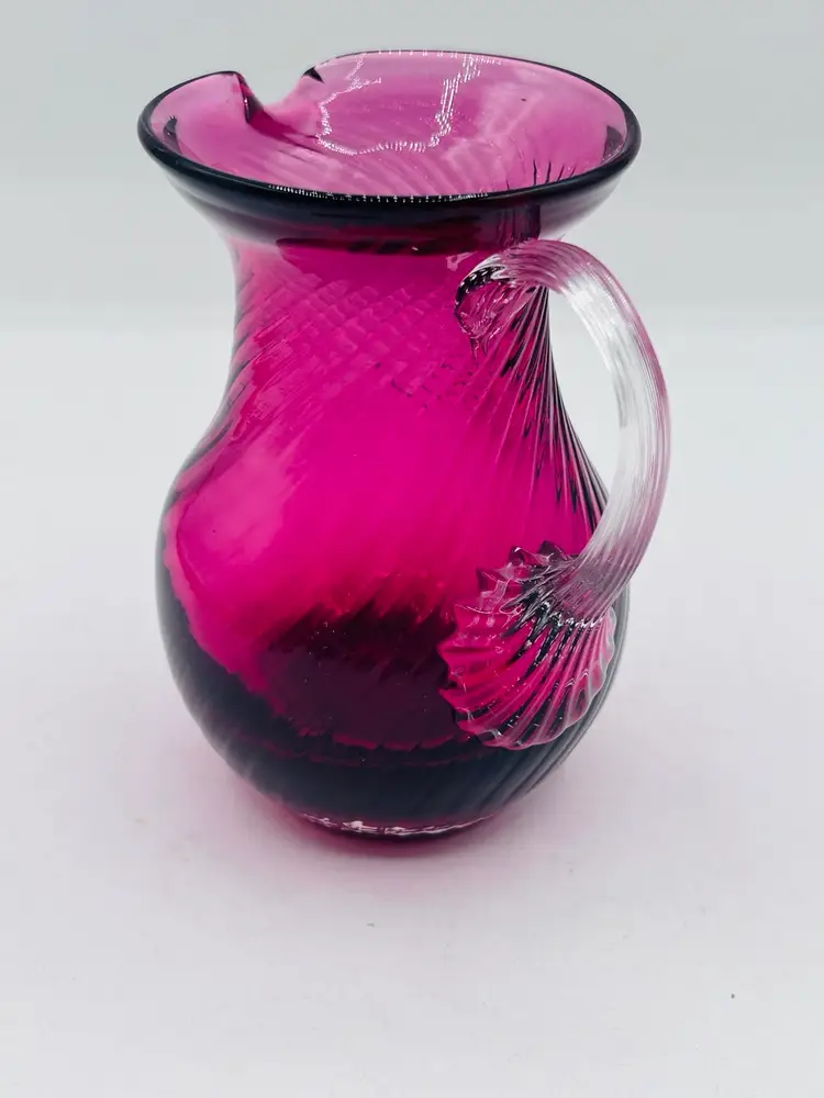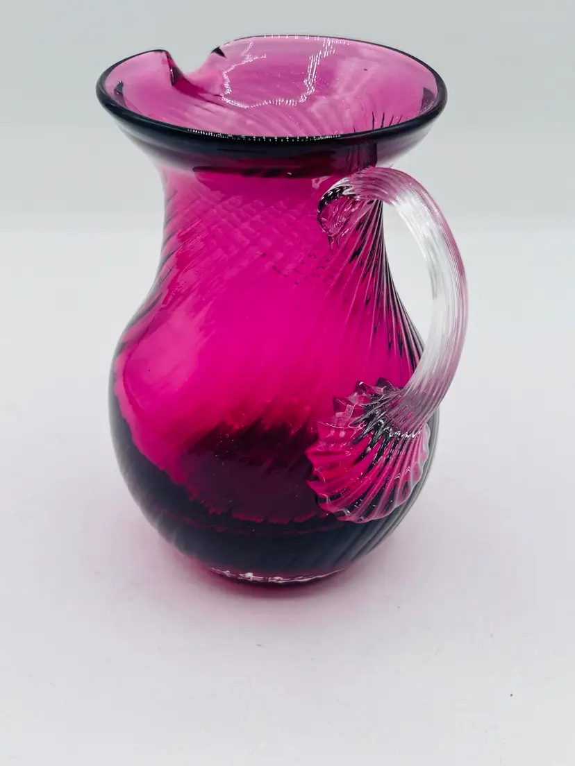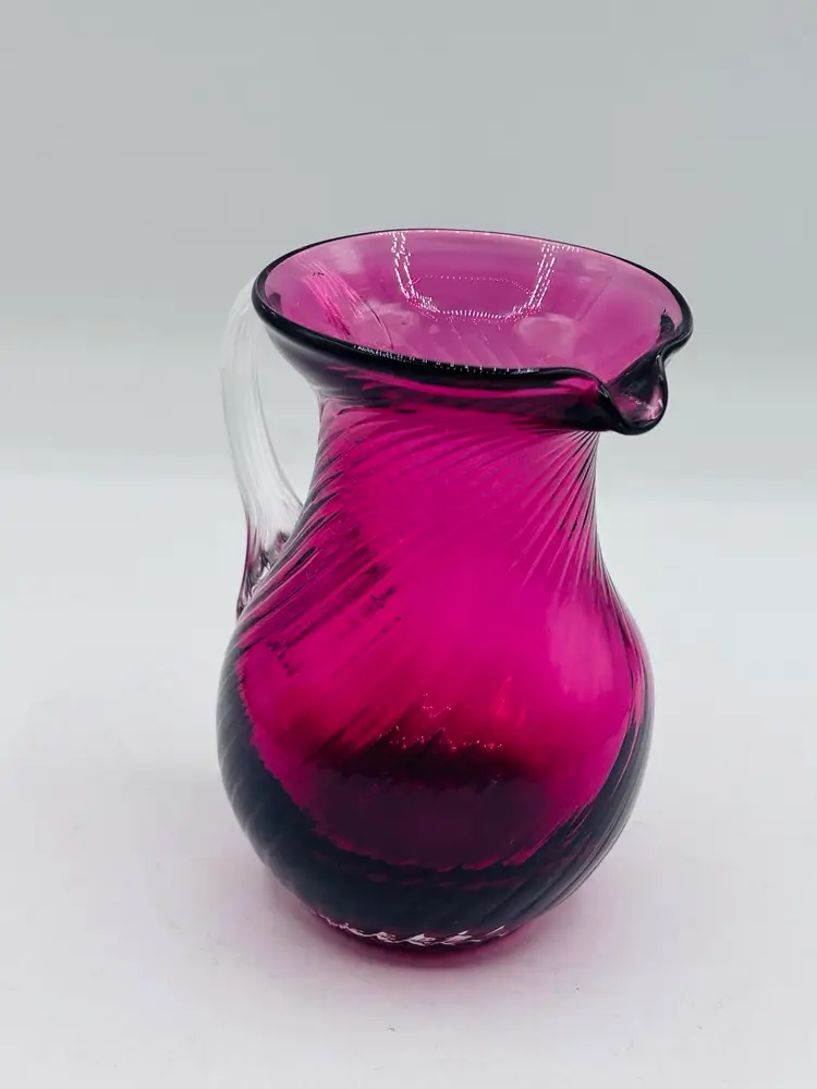 The Pilgrim Cranberry Small Mini Pitcher Creamer is a vintage piece of art glass that is hand-blown and made in the United States. Standing at 4.5 inches tall, this red cranberry glass creamer is a charming addition to any collection of decorative cookware, dinnerware, or serveware. With its original design and unique production technique, this Pilgrim creamer is a delightful and nostalgic vintage find for glassware enthusiasts.