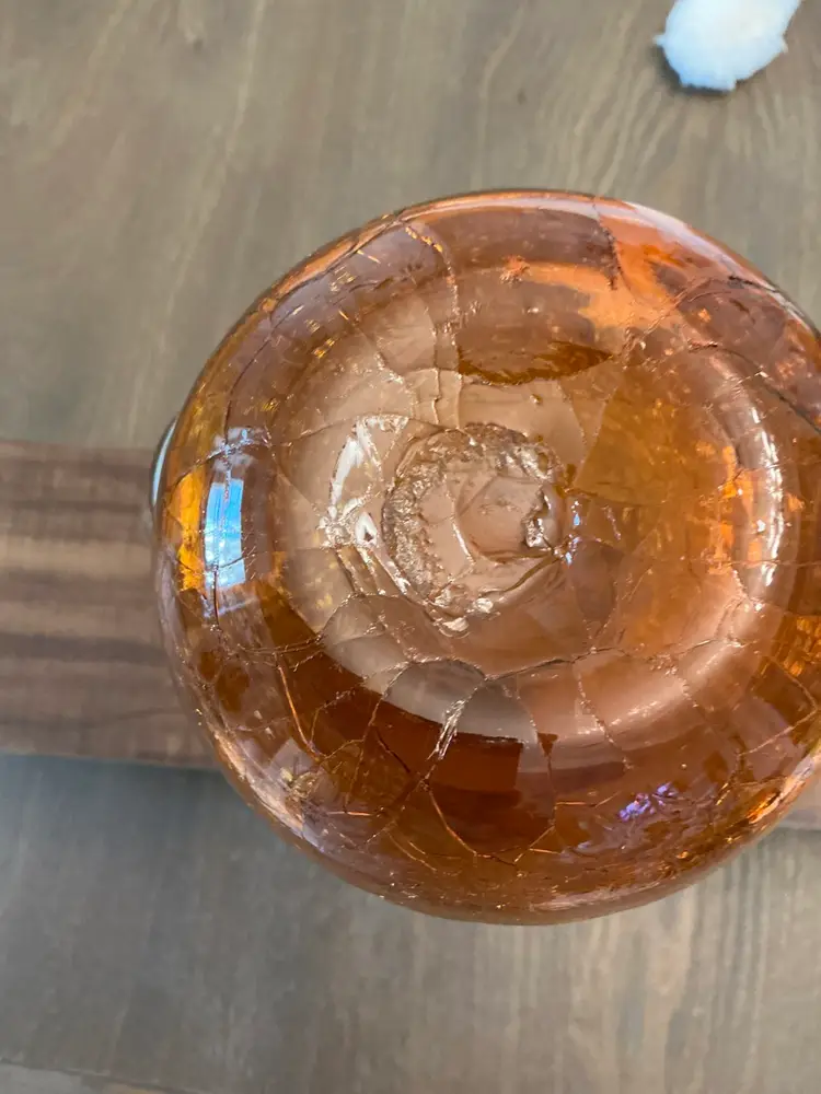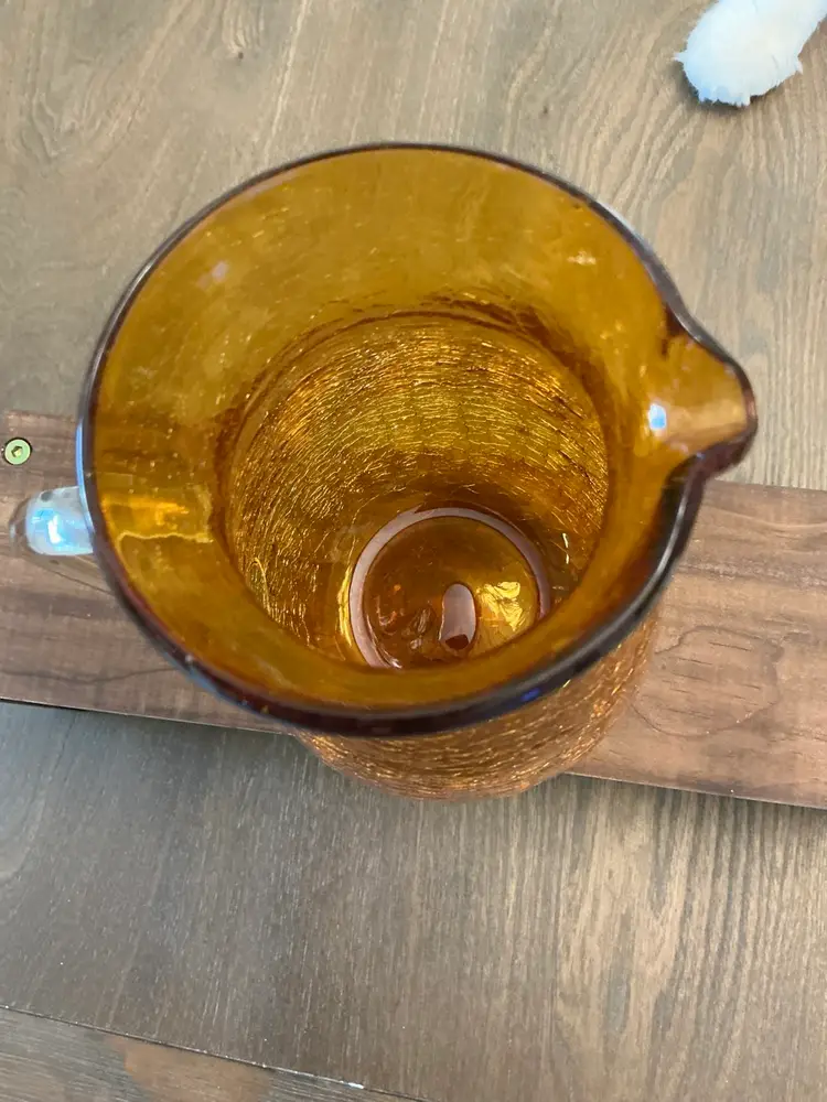 Vintage Amber colored crackled glass pitcher with applied clear handle. Hand blown with pontil mark on bottom. 7” by 5”