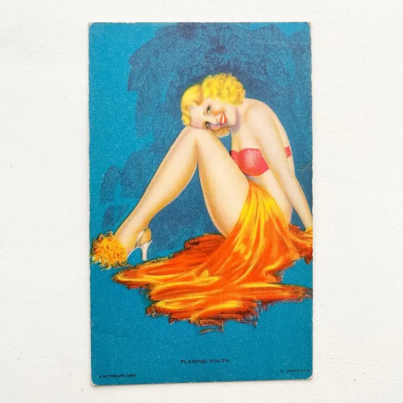 Pin Up Card Mutoscope Litho Vtg 1940s Vending Machine Arcade Blue Orange Retro Pin Up Girl With Flaming Orange Wrap Scarf Condition: Wear around the edges and on the corners. Crease on the upper right corner (best seen on the back side). You can feel the crease but you can't see you can't see it well on the front side. Measures 5-1/4 inches x 3-1/4 inches Packaged in a plastic sleeve inside a rigid envelope Visit my store to see more vintage ephemera, advertising, novelties, gifts, estate sale and yard sale finds https://district.net/u/finderspickerspaper SKU B32
