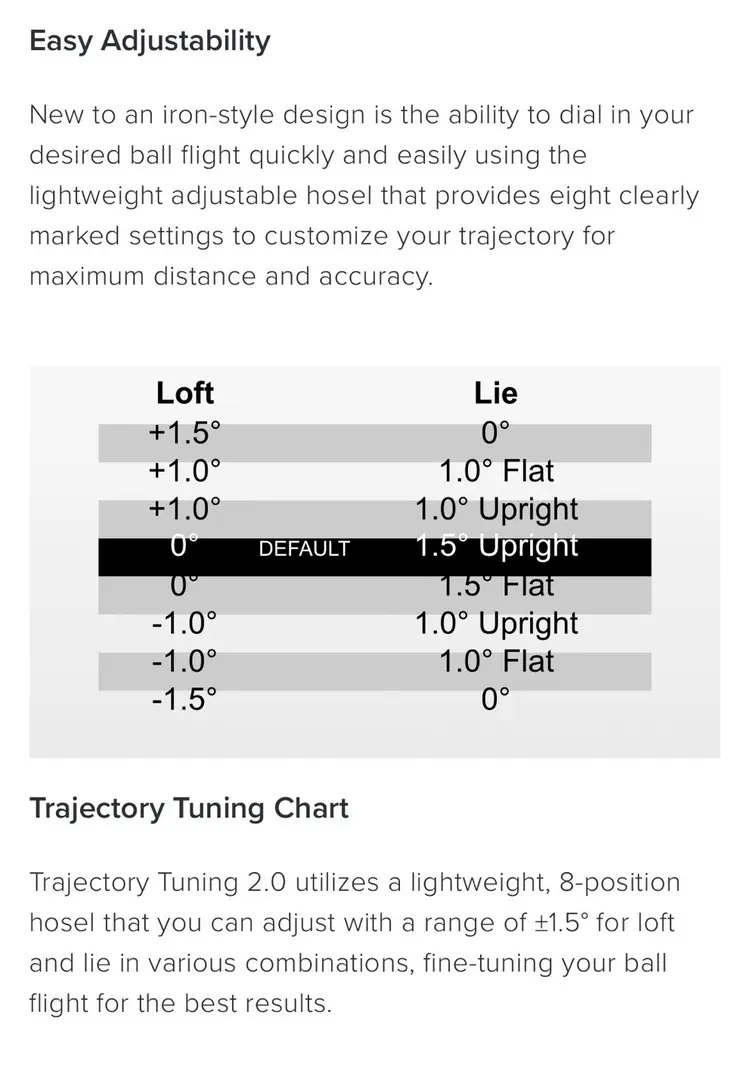 Newly designed with proven Trajectory Tuning 2.0 adjustability, this compact design for better players elevates long-iron performance from a lower CG and maraging steel face that generate faster speed and higher launch to carry shots farther with stopping power. An EVA polymer enhances feel and sound. The rounded lead edge optimizes turf interaction, a toe screw and tip weight increase MOI, and shorter club lengths ensure better control. Precision-milled MicroMax grooves and the matte-black hydropearl 2.0 finish deliver consistent launch and spin from dry and wet conditions for more accuracy.
