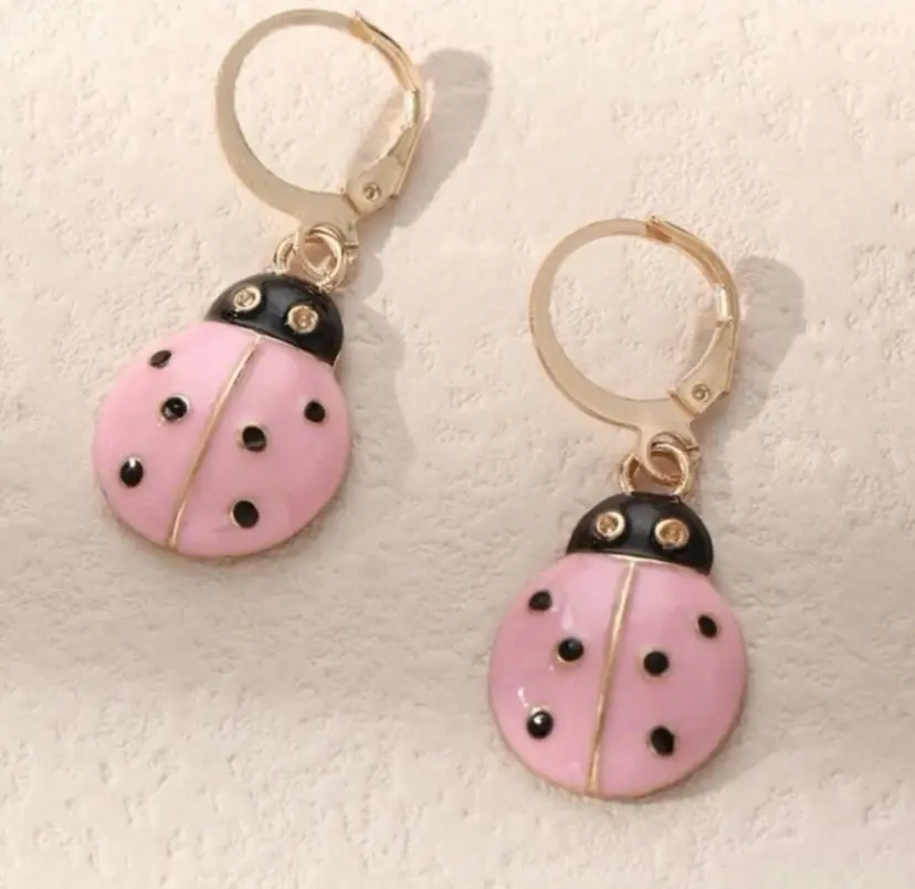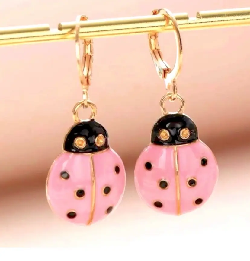 Pink And Black Lady Bug Dangle Earrings length is 1.38 inches. Huggie style closure.