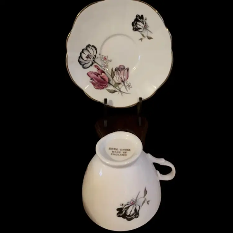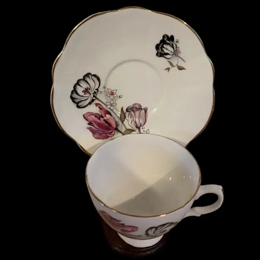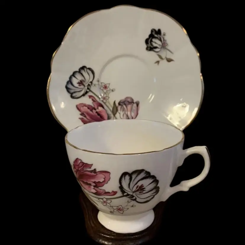 Vtg. Pink & Black Rose Floral Bone China Teacup & Saucer, Made In England Excellent Condition and would be a beautiful add to your collection.