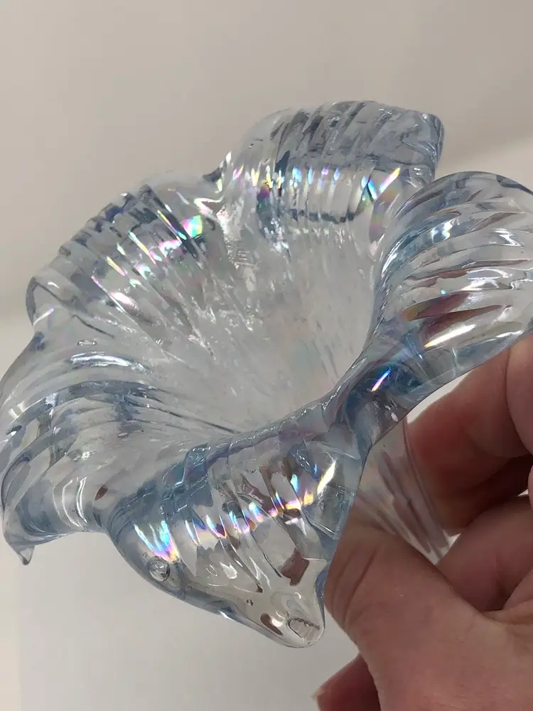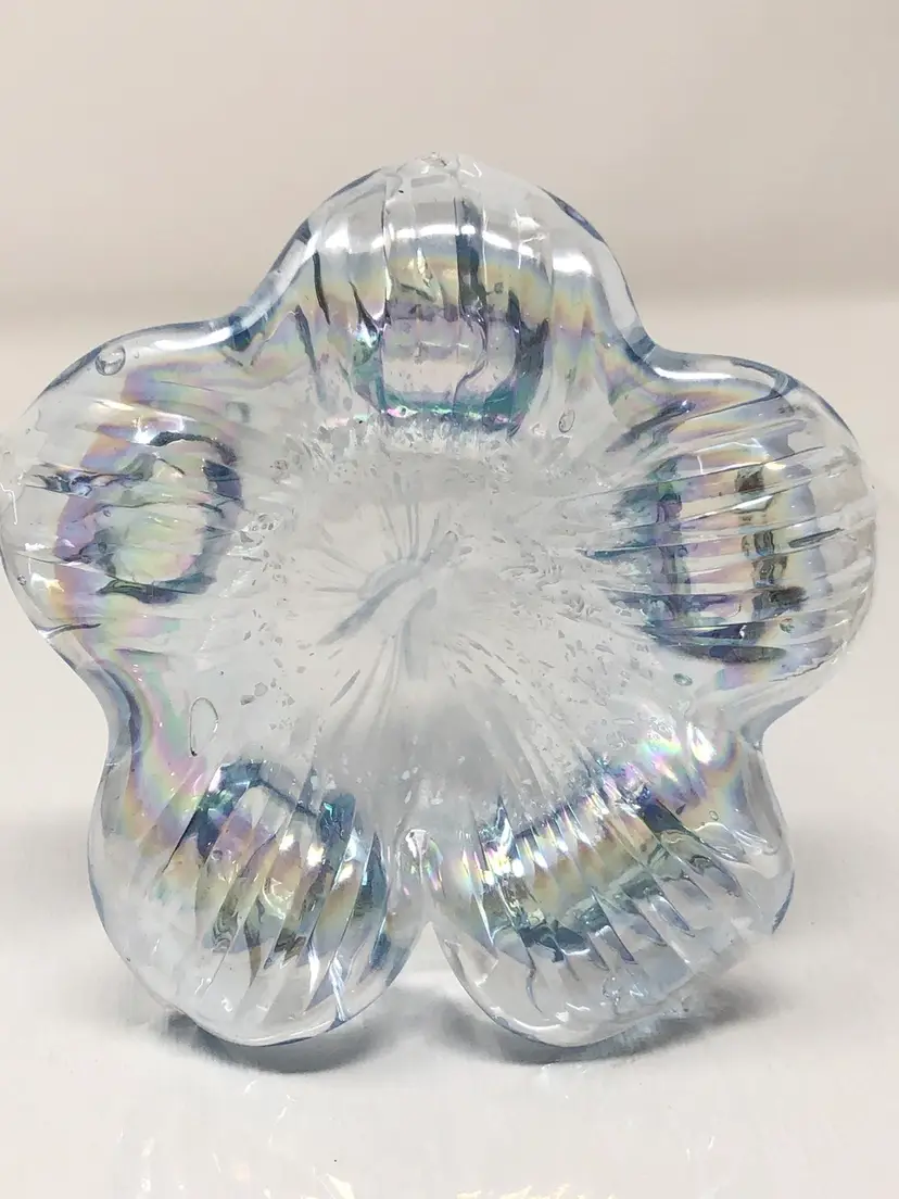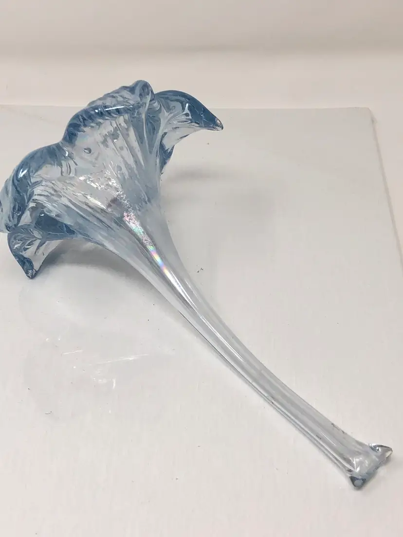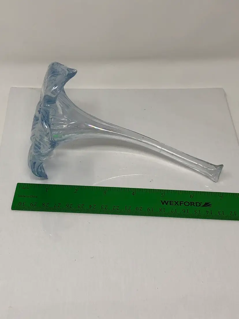 7" iridescent glass lily flower vase speckled and iridescent. No markings or labels, no chips or cracks.