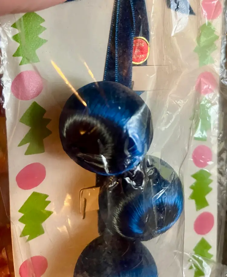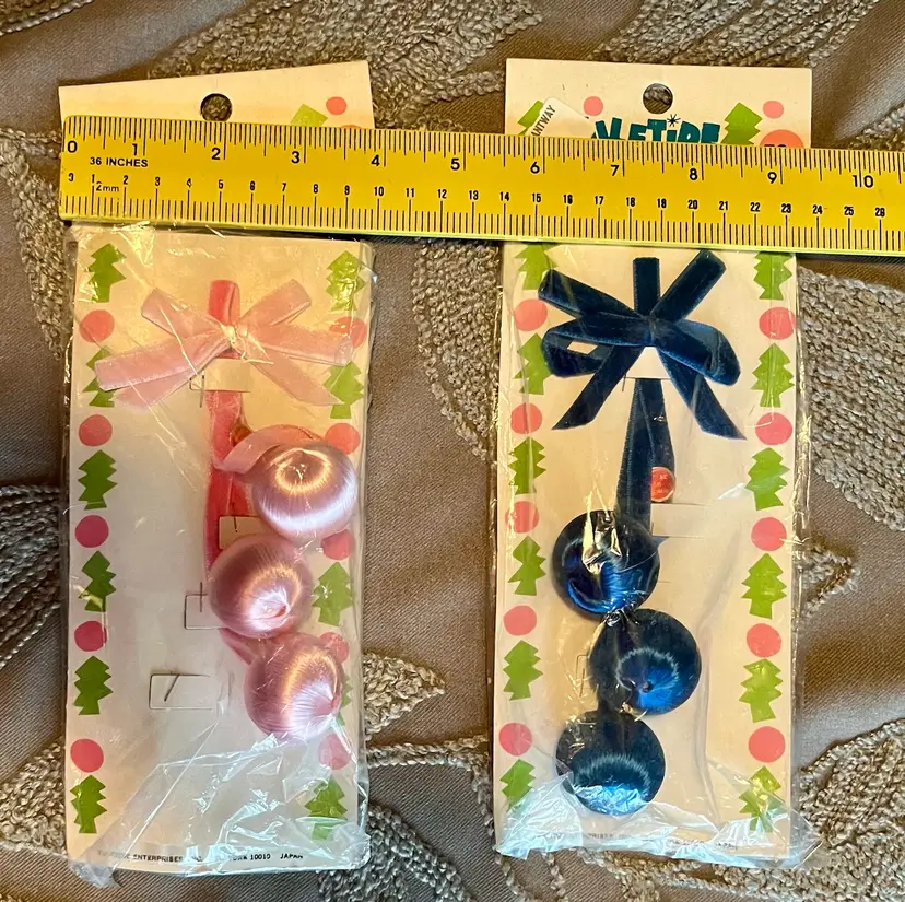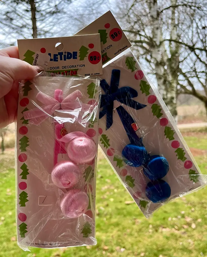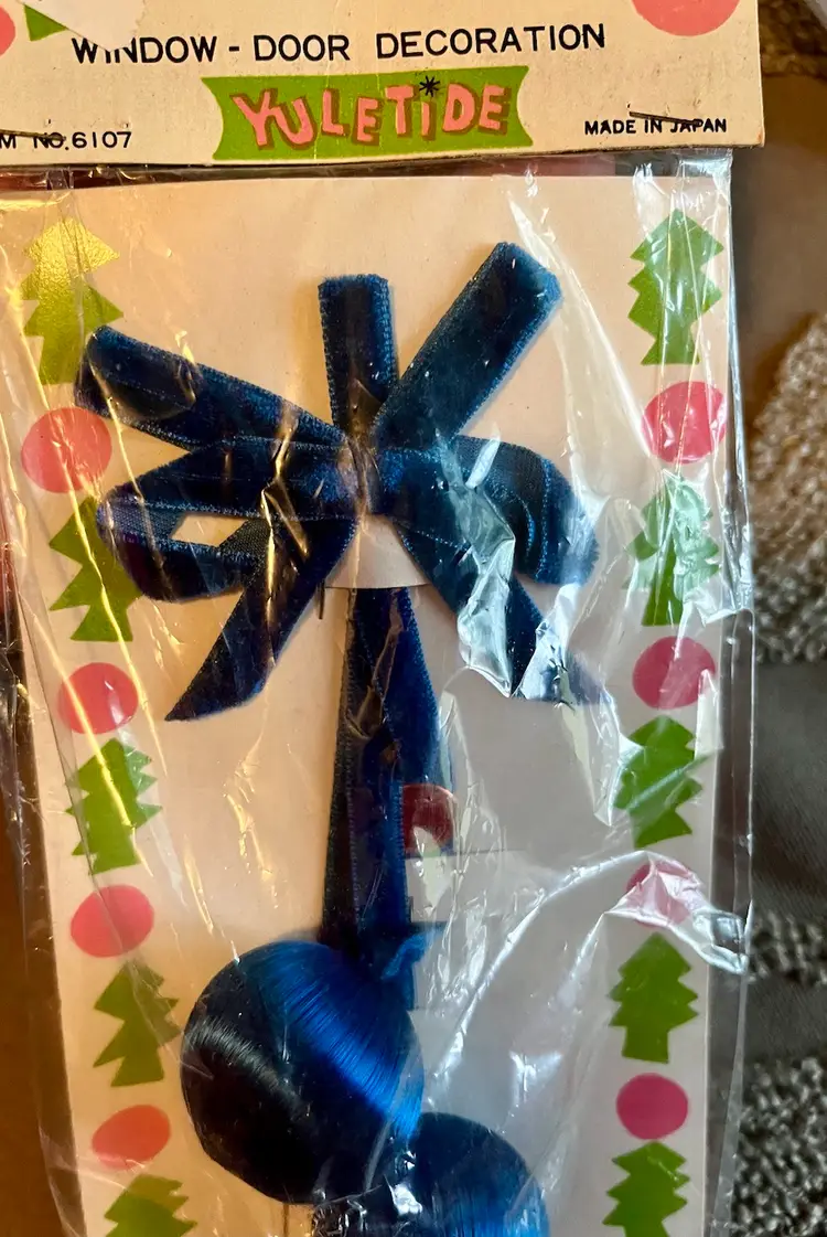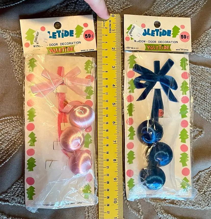 Pink Blue Yuletide Spun Silk Velvet Christmas Window Door Decor Made in Japan Old Stock - packages show some age and the pink decor’s card stock top is separated from the cello wrap.