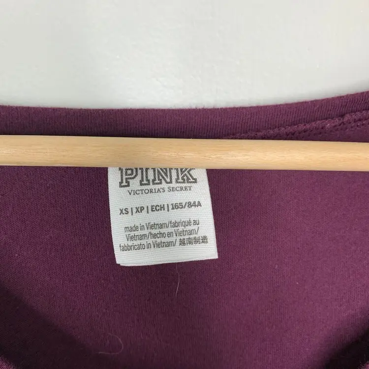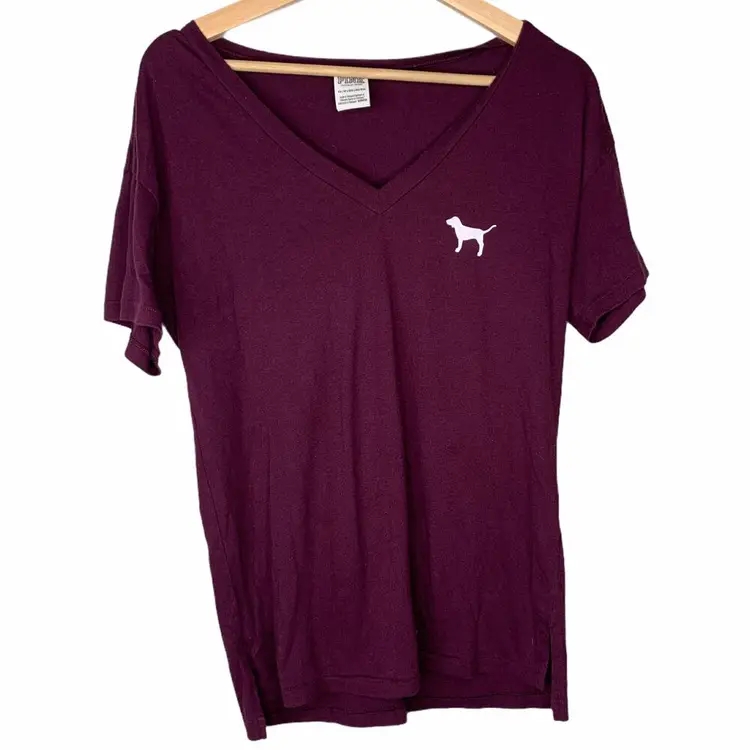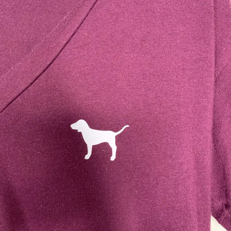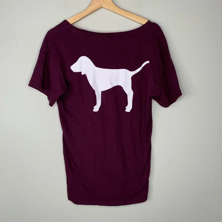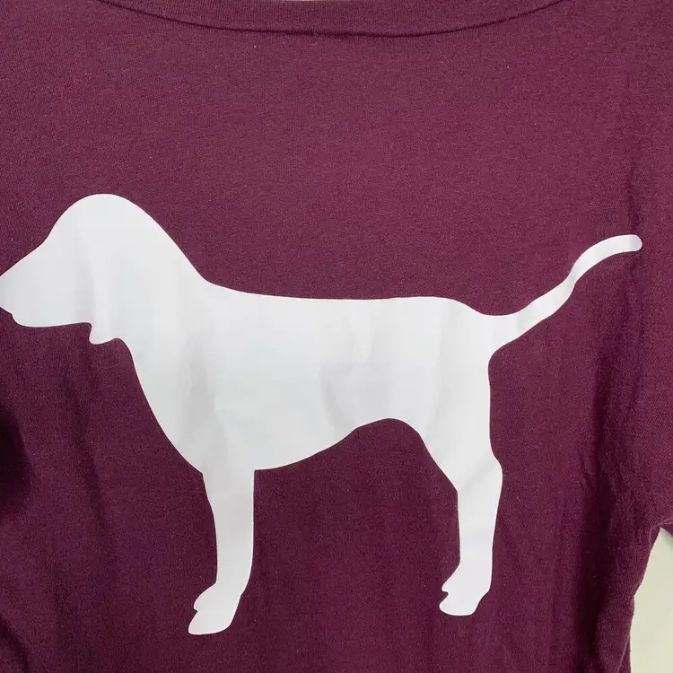 PINK by Victoria's Secret Maroon Short Sleeve T-Shirt Dog logo on front and back Pre-owned, no flaws Size: Women's XS - extra small Cotton and polyester Cute casual summer tee
