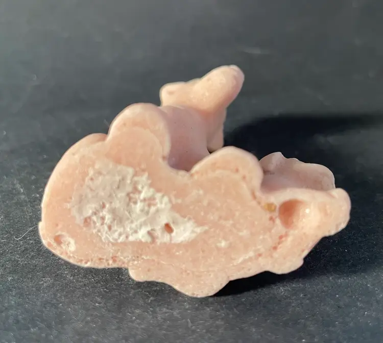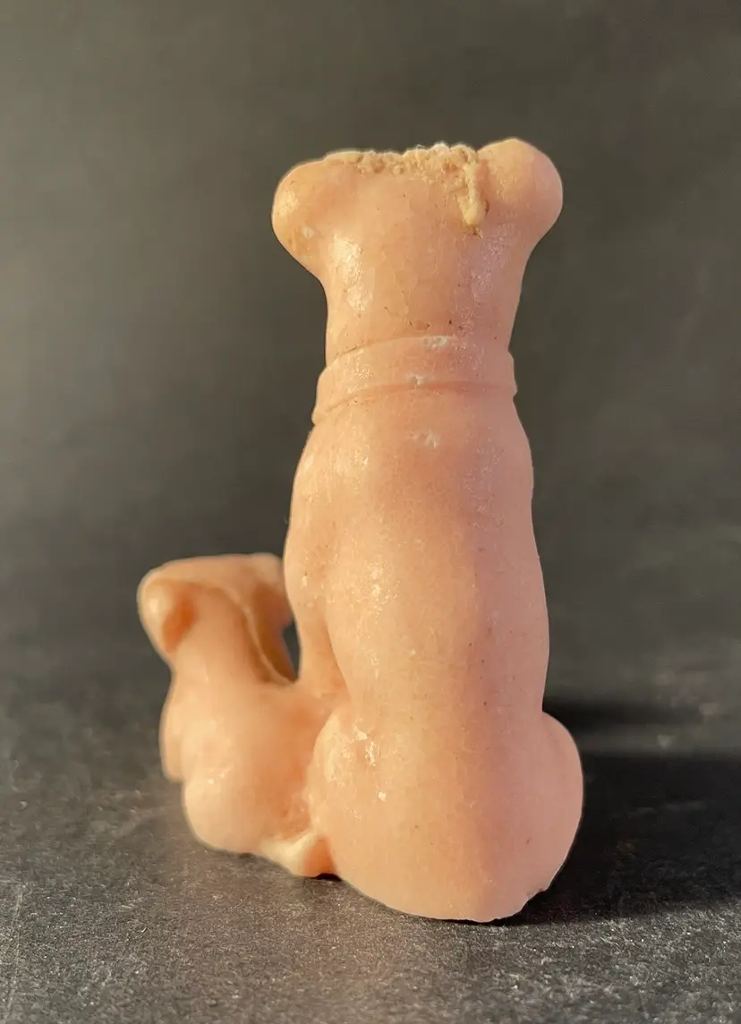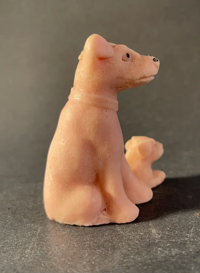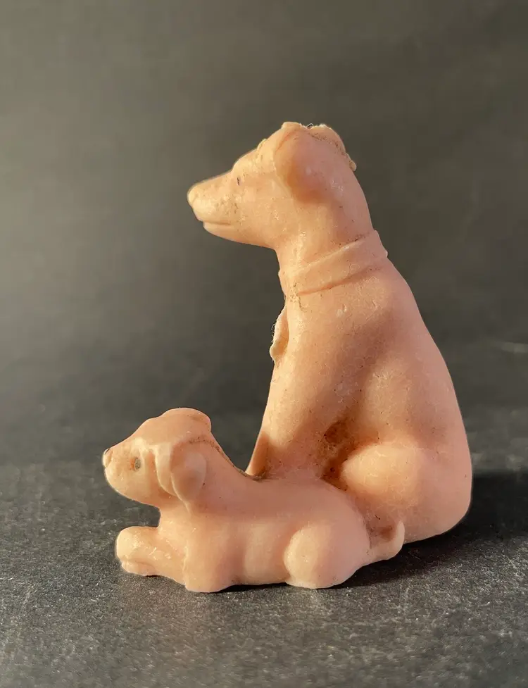Small pink dog with puppy. Looks like an old carnival prize. It’s made of some kind of pink crystalline stone-like material, looks like it was made in a mold. There is a little excess on the big dog’s head. It is 2 1/4” tall and 1 3/4” wide.