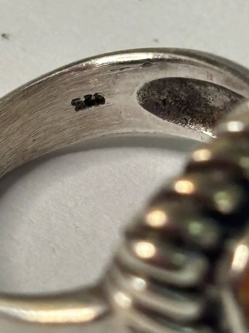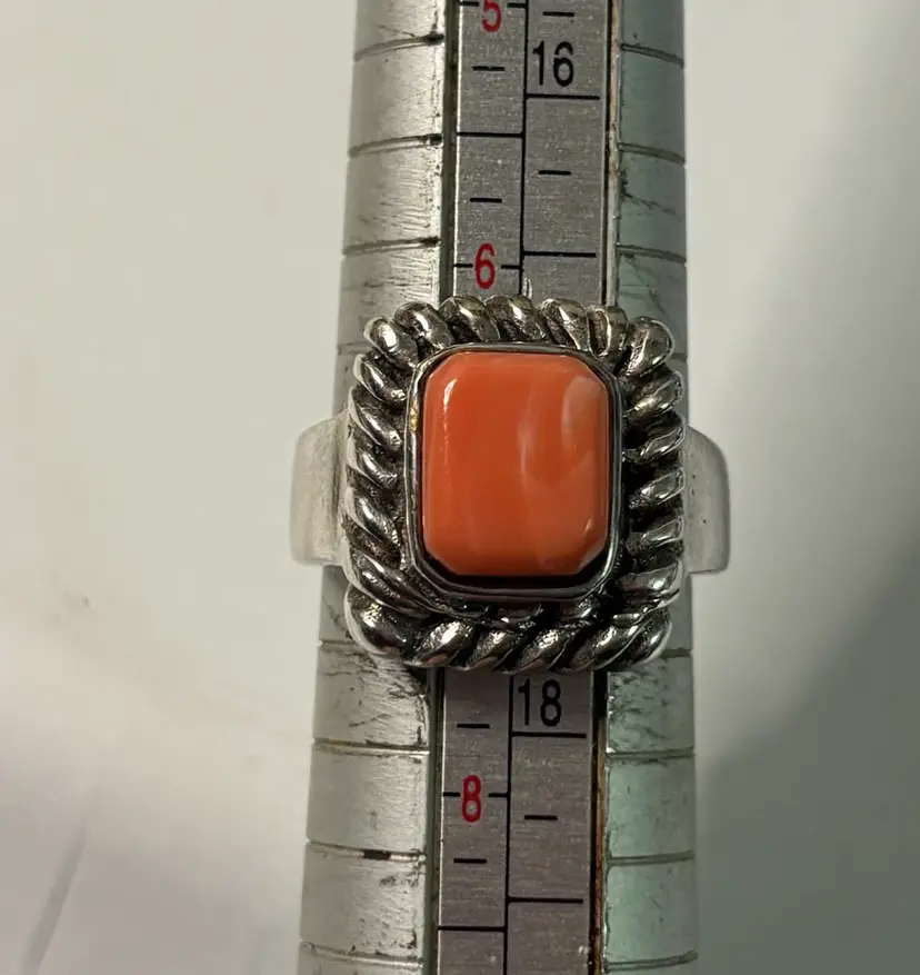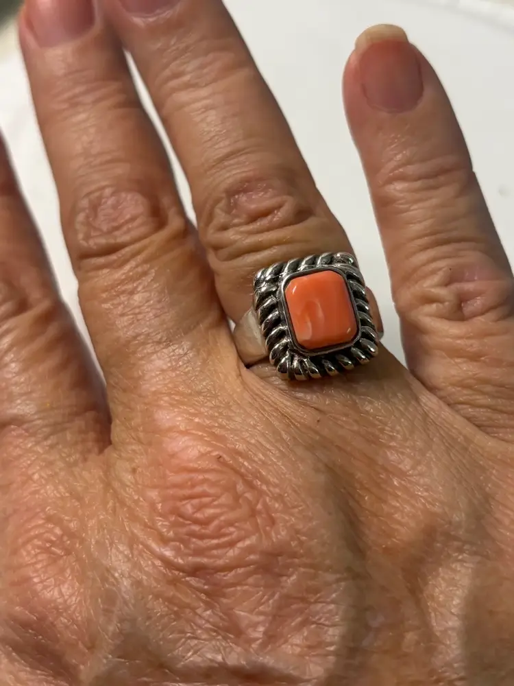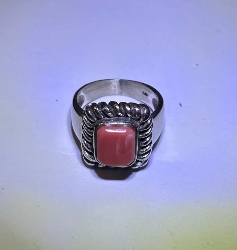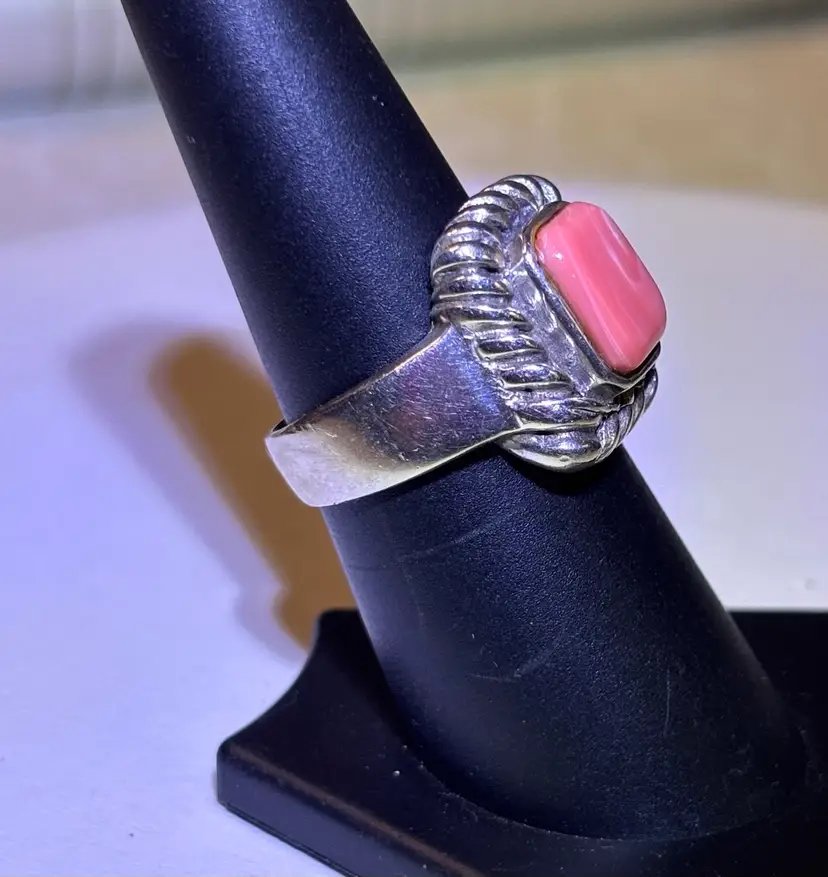 Pastel pink coral square bezel set with braid detail. Pretty setting with a wider band. Nice, sturdy ring in a sz 7.