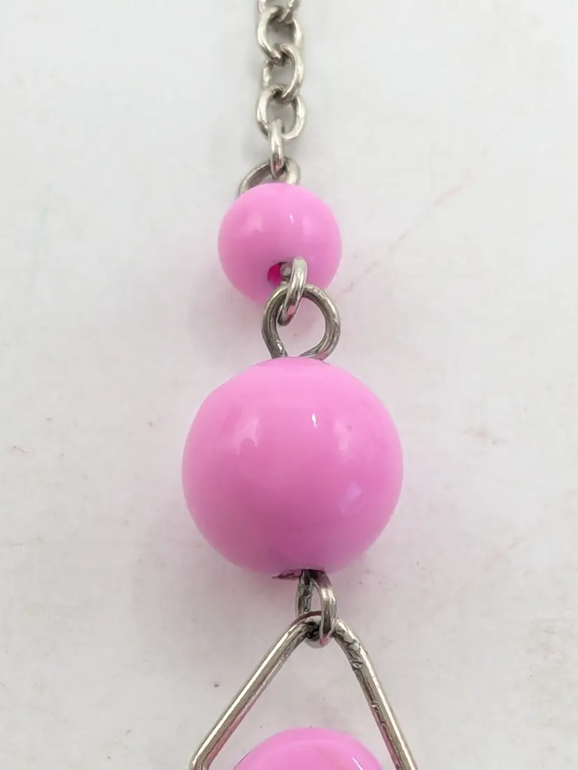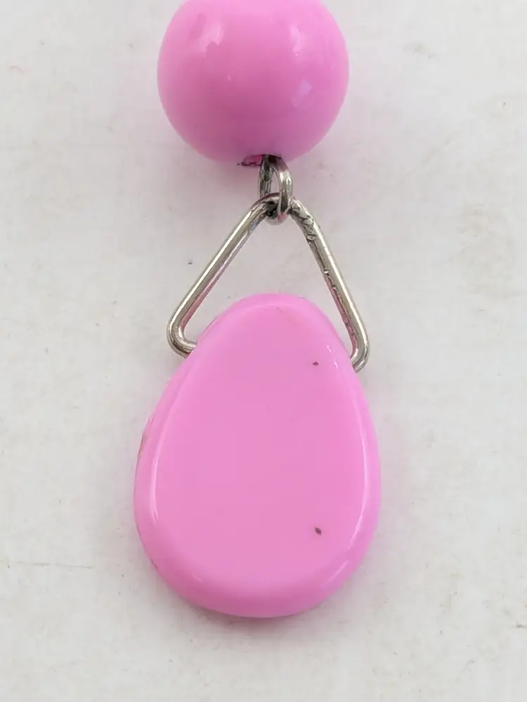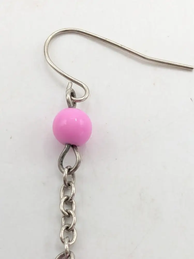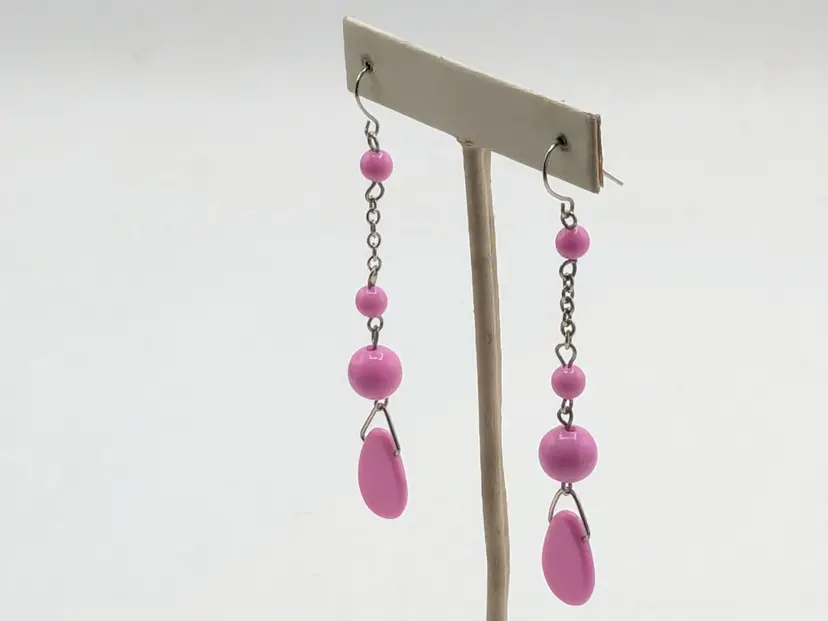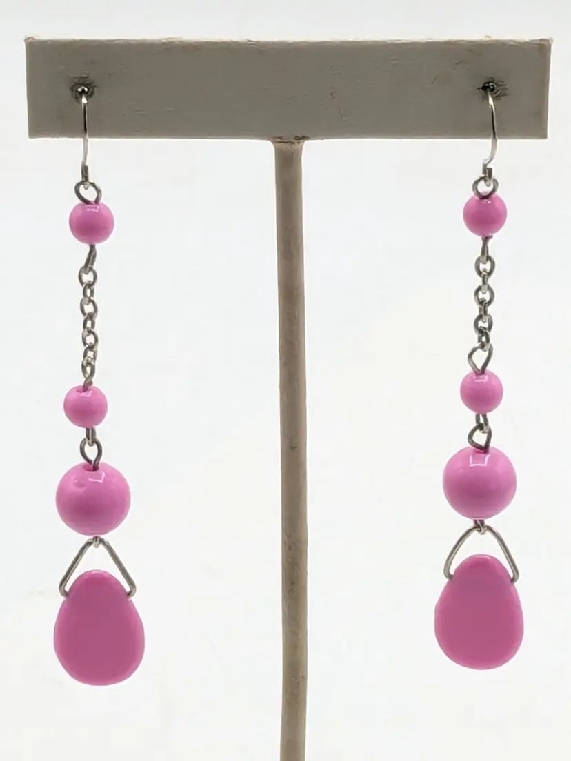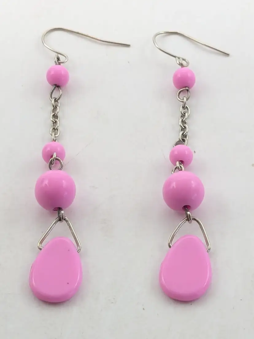 Summer Jewelry! Good condition. Silver tone fun earrings feature pink plastic beads and teardrop accents. Lightweight pierced earrings. Measures 3" long and 1/2" wide. wen