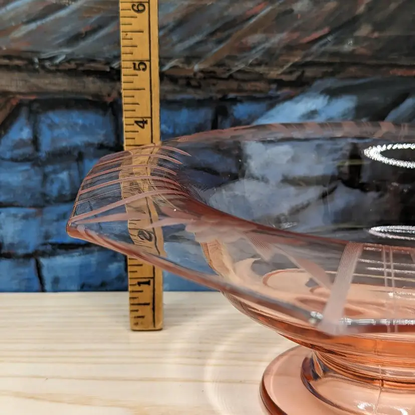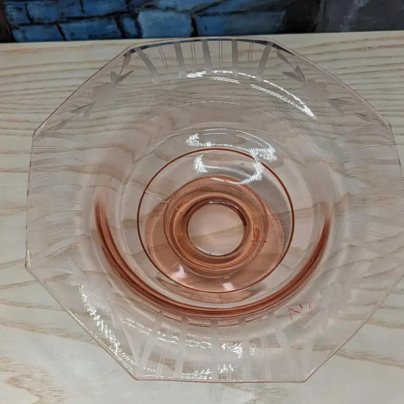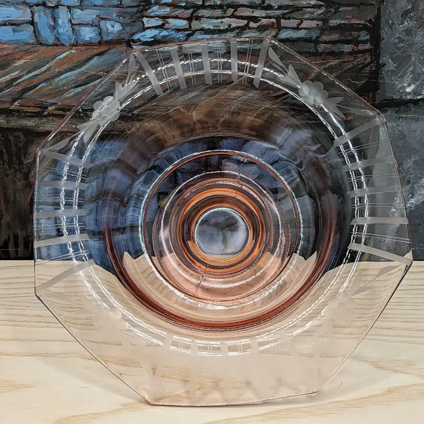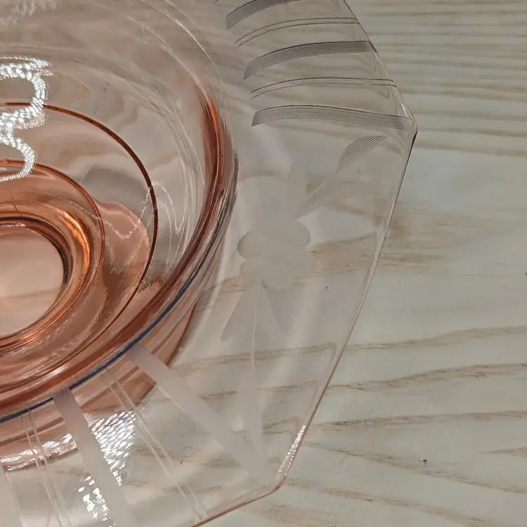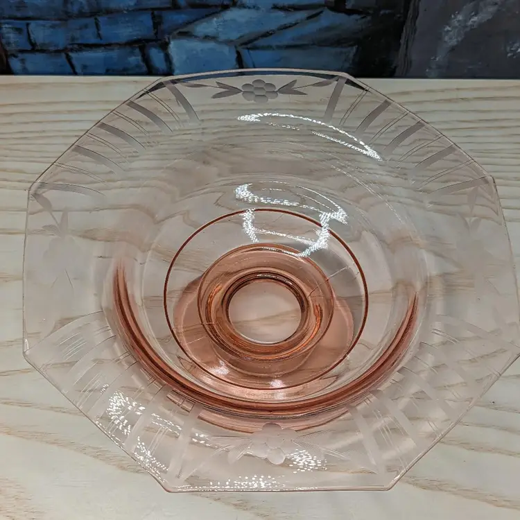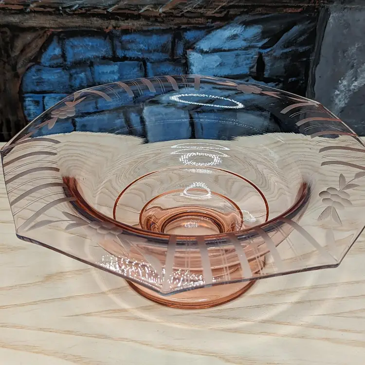 Vintage Pink Depression Elegant Glass Etched 10"x 3" Footed Bowl 1940s Has the turned edge with Flowers and Stripe Etching. 8 sided Octagon shape Could be Martinsville Glass . Fits into Art Deco , Mid Century Modern Style decor.Very good condition it does have a ding in the inside of the bowl Feels like a scratch. no chips or cracks. Please check the photos for details.