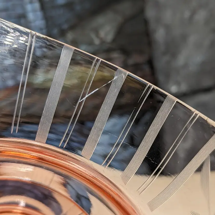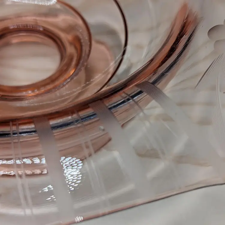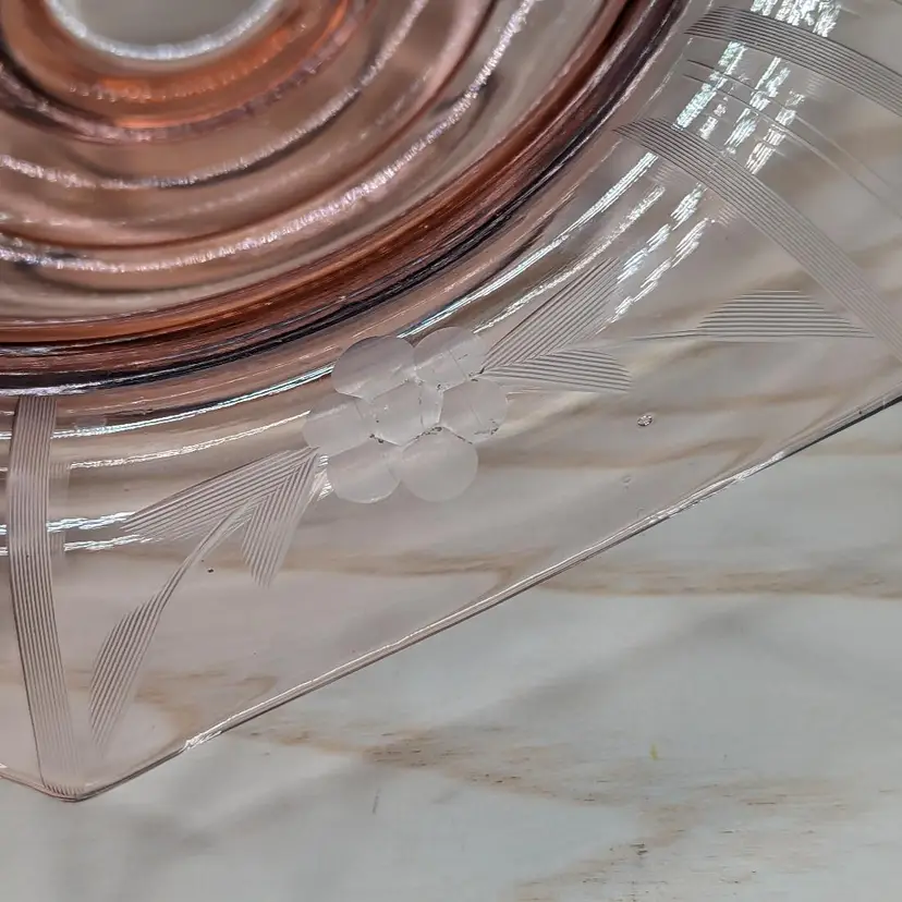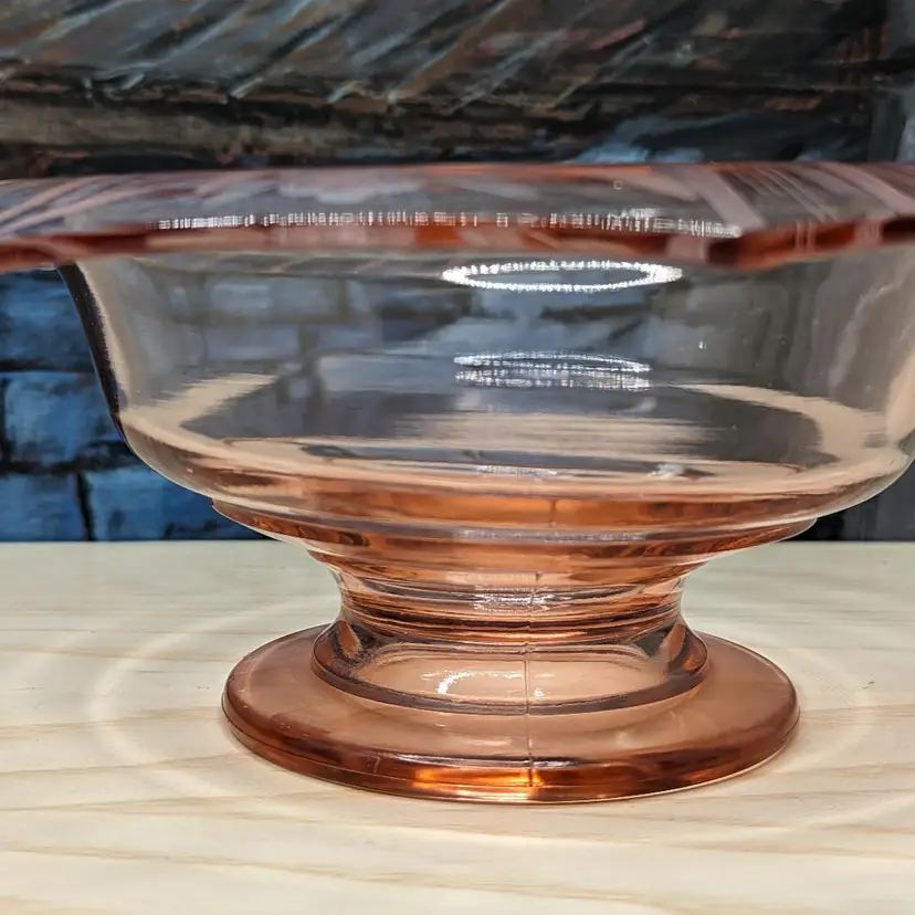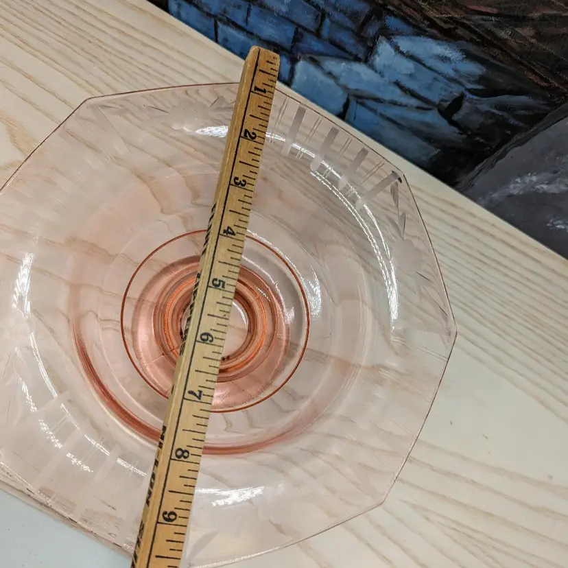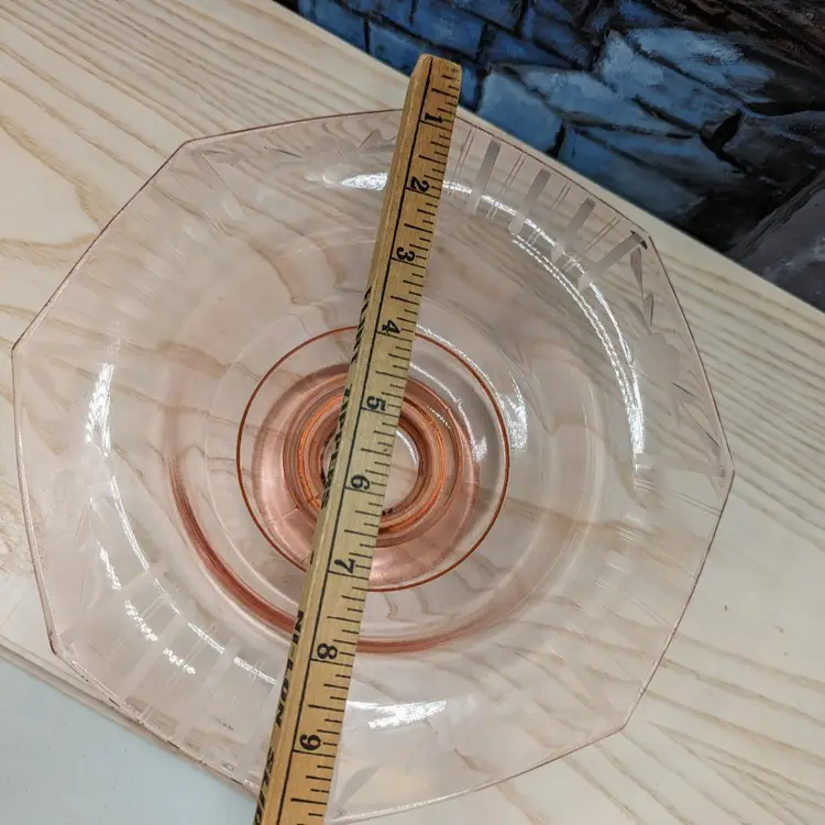 Vintage Pink Depression Elegant Glass Etched 10"x 3" Footed Bowl 1940s Has the turned edge with Flowers and Stripe Etching. 8 sided Octagon shape Could be Martinsville Glass . Fits into Art Deco , Mid Century Modern Style decor.Very good condition it does have a ding in the inside of the bowl Feels like a scratch. no chips or cracks. Please check the photos for details.