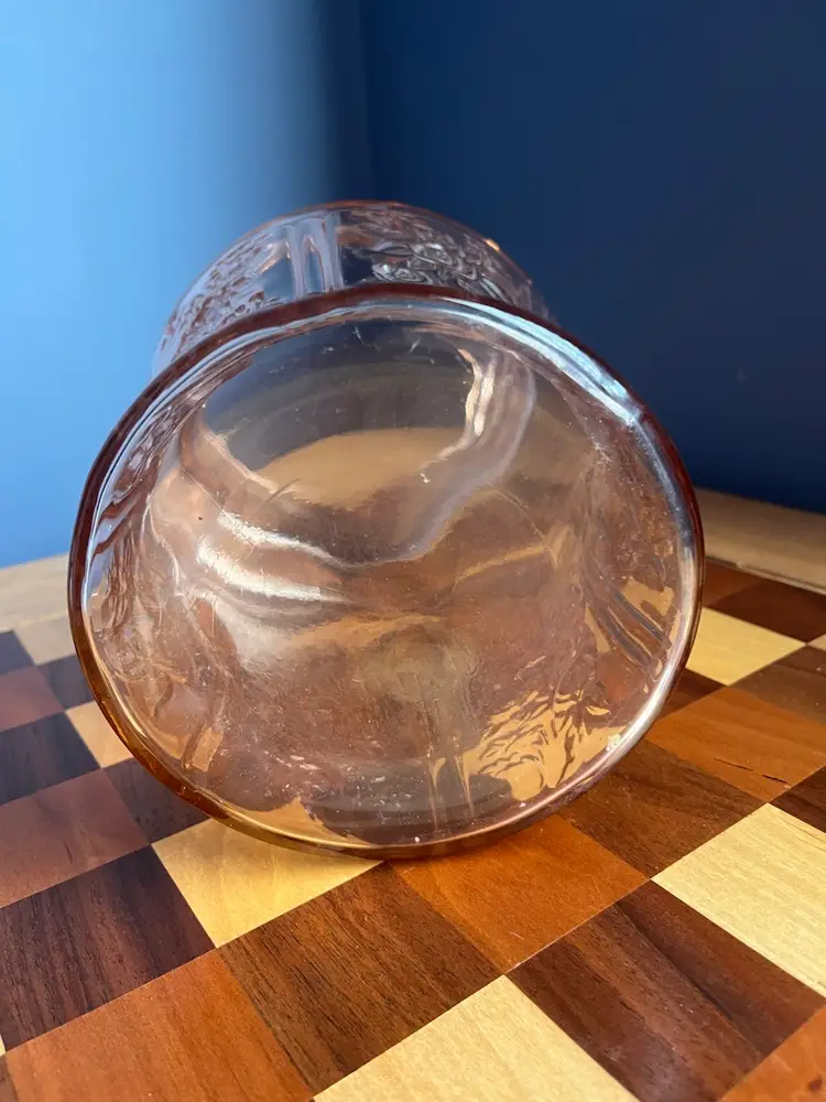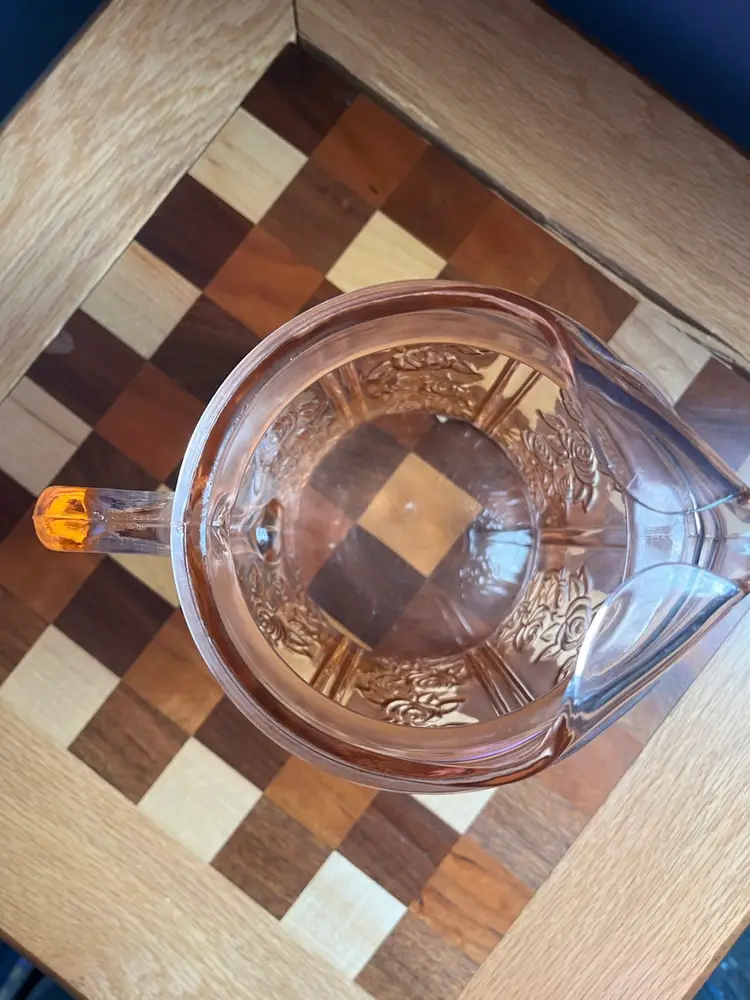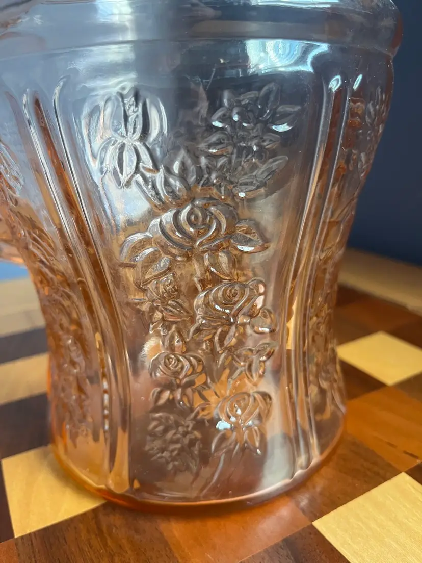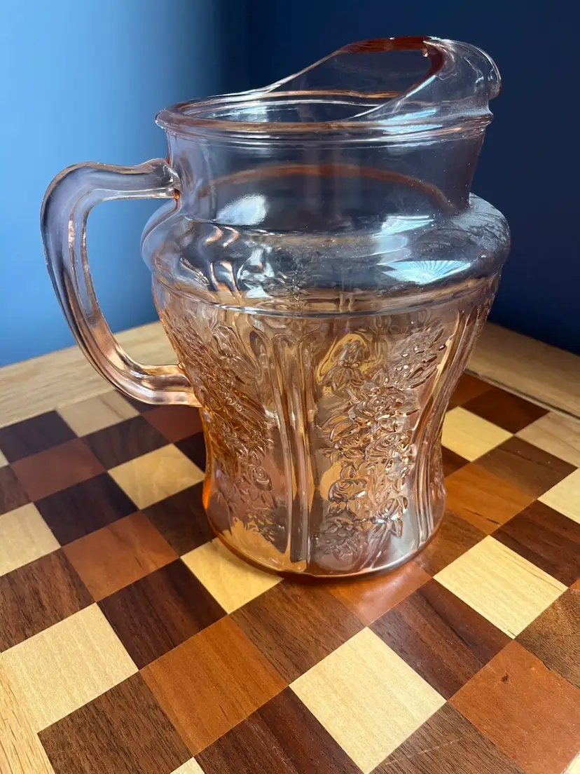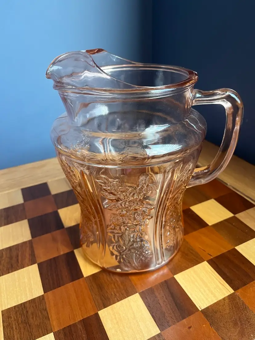 Pink depression, federal glass, cabbage rose, rose of Sharon, pink ice lip, pitcher 9 inch, 80 ounces