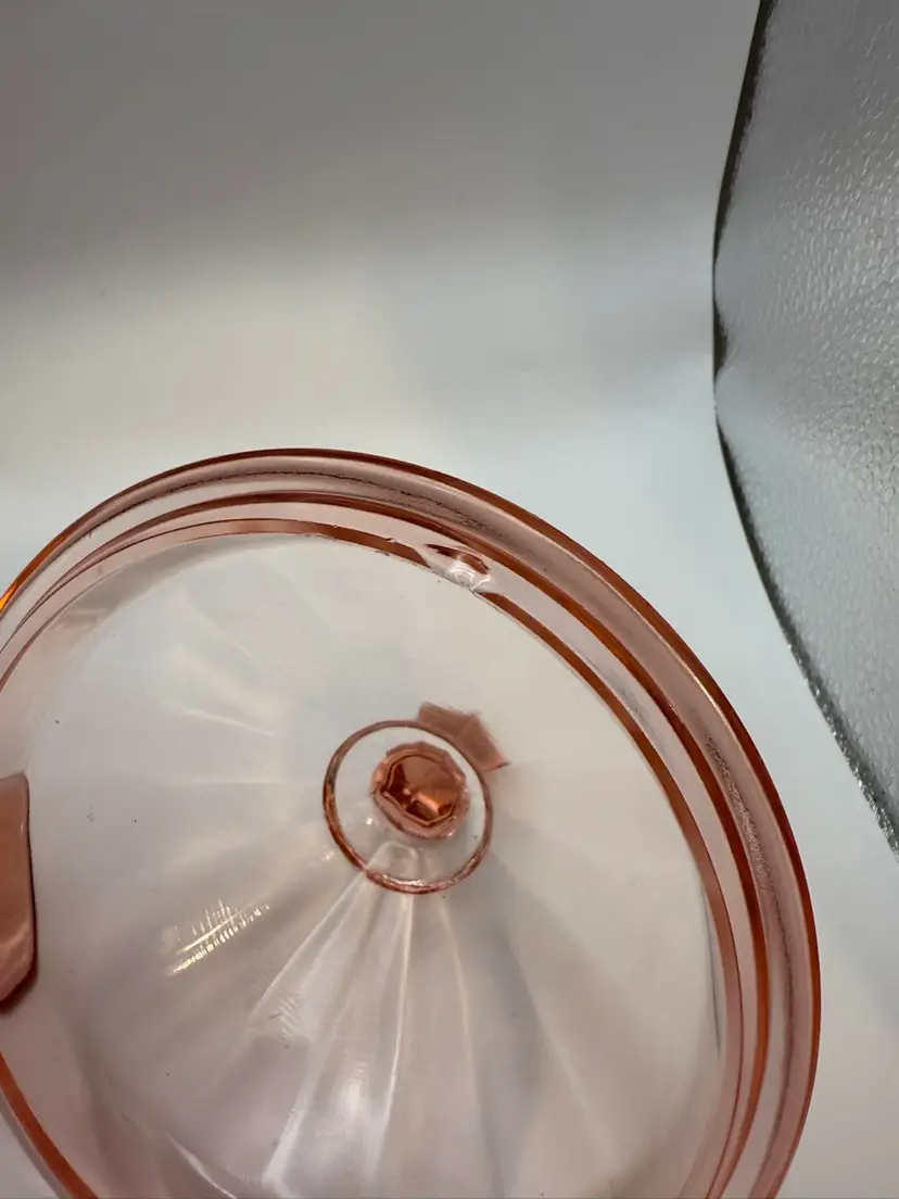 This was manufactured by Lancaster Glass during the 1930s or Indiana Glass in the 1970s. Type: Vintage Pink Depression Glass Candy Dish. Depression glass was popular during the 1930s, and this style was also produced in the 1970s. It is 9 in high and 5 in wide. As is - PLEASE NOTE SMALL CHIP ON INSODE RIM OF LID. see pictures.