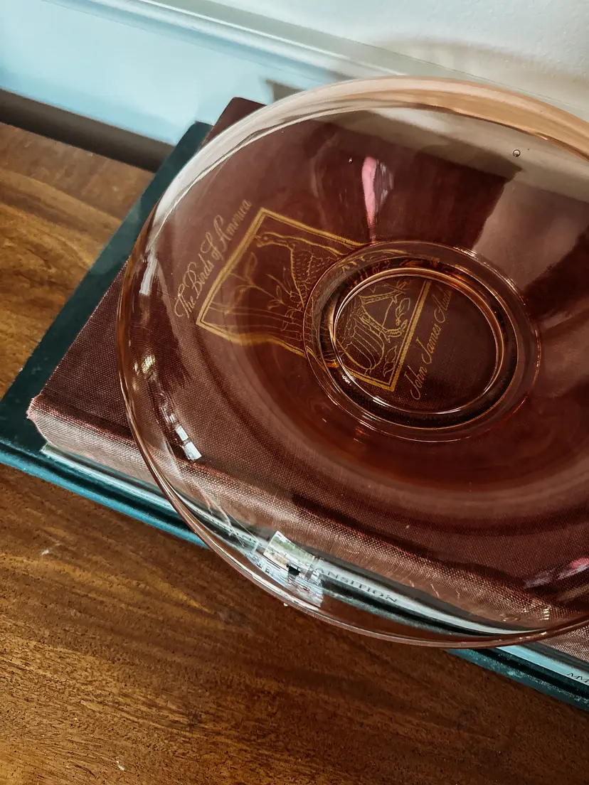 11" in diameter and about 2" tall can be used either direction as a serving bowl or display. Absolutely stunning with no chips or cracks. Some bubbles in the glass which is part of the manufacturing process, not damage.