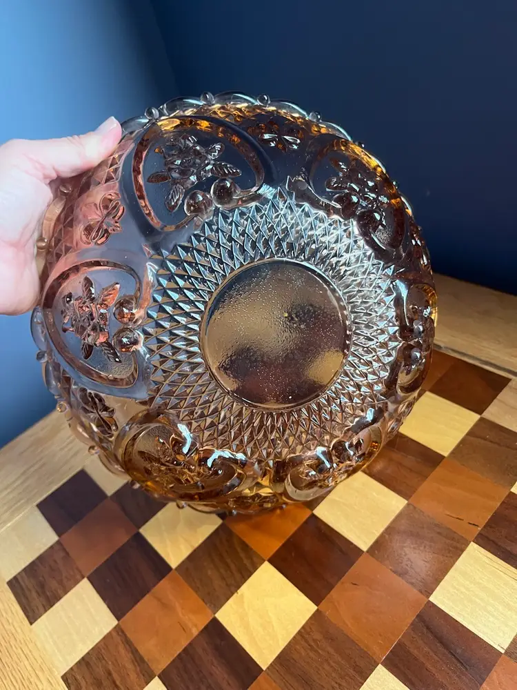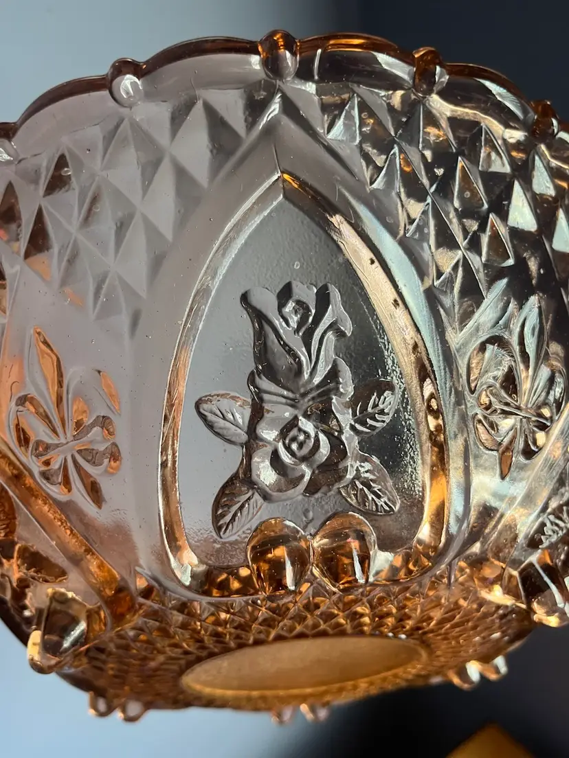 Vintage pink depression, glass, KIG Indonesia, pink glass, footed bowl , fleur de lis and roses with diamond, cut design, fruit/salad decorative bowl – 10 inch diameter