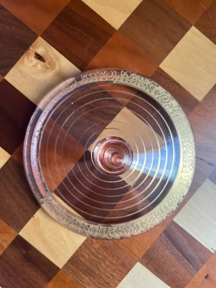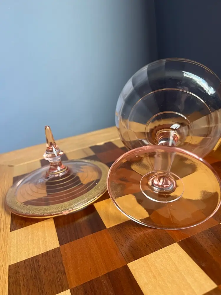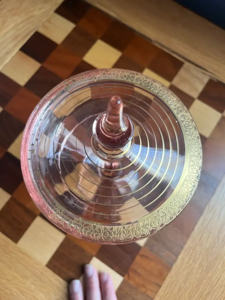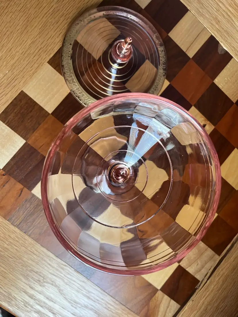Pink depression, glass pedestal dish – floral gold etched. Tiffin, rambler rose, pink panel, gold, and crusted, covered candy dish, some gold missing -9” tall