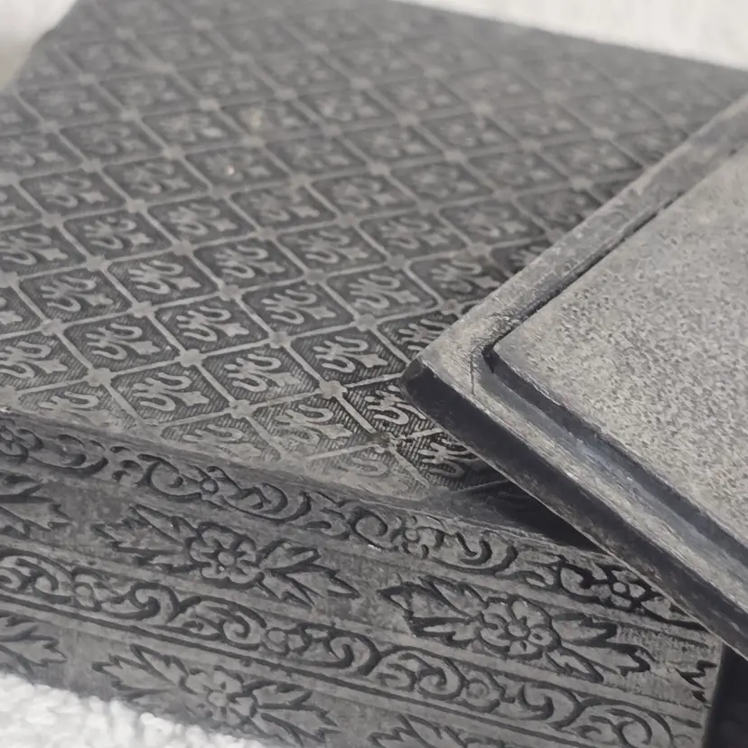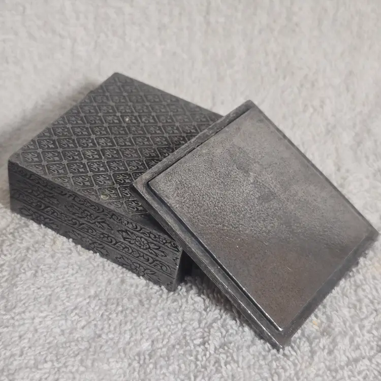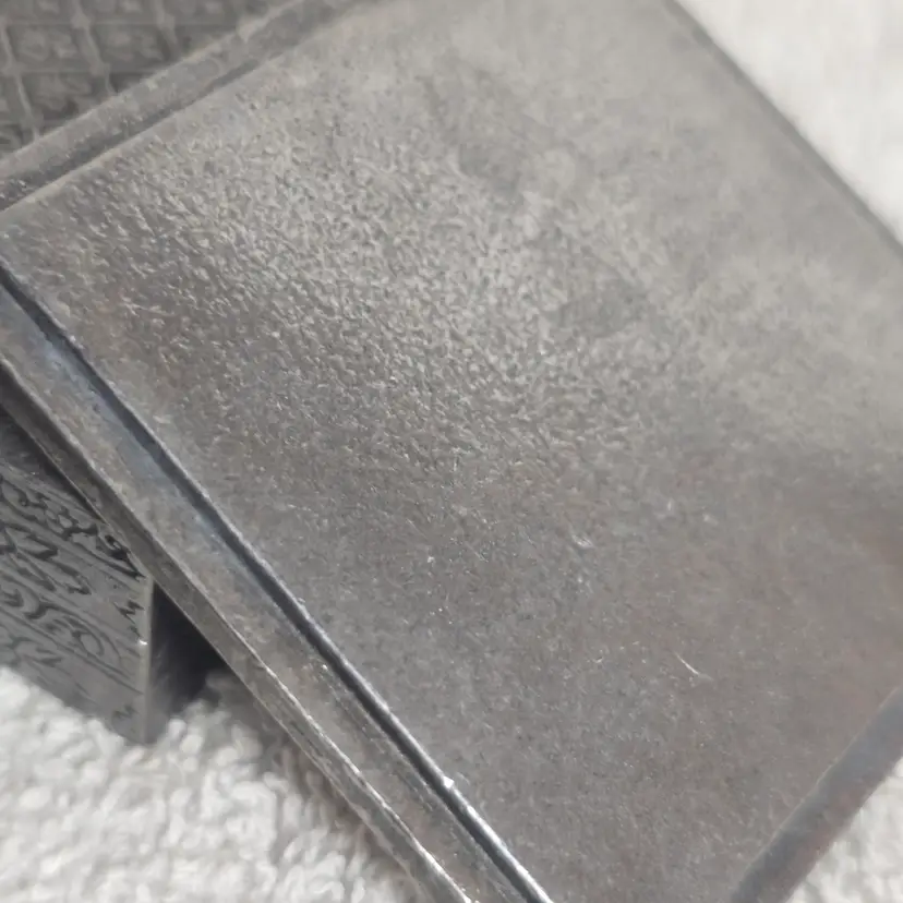 Embossed metal patterning surrounds the sides, giving the piece an antique-inspired feel.