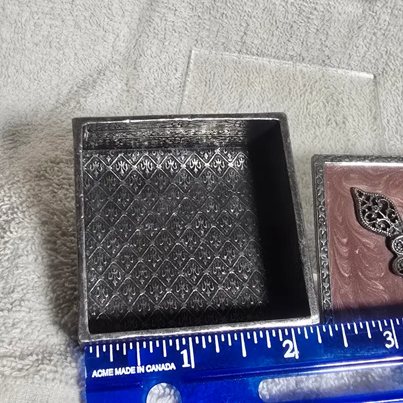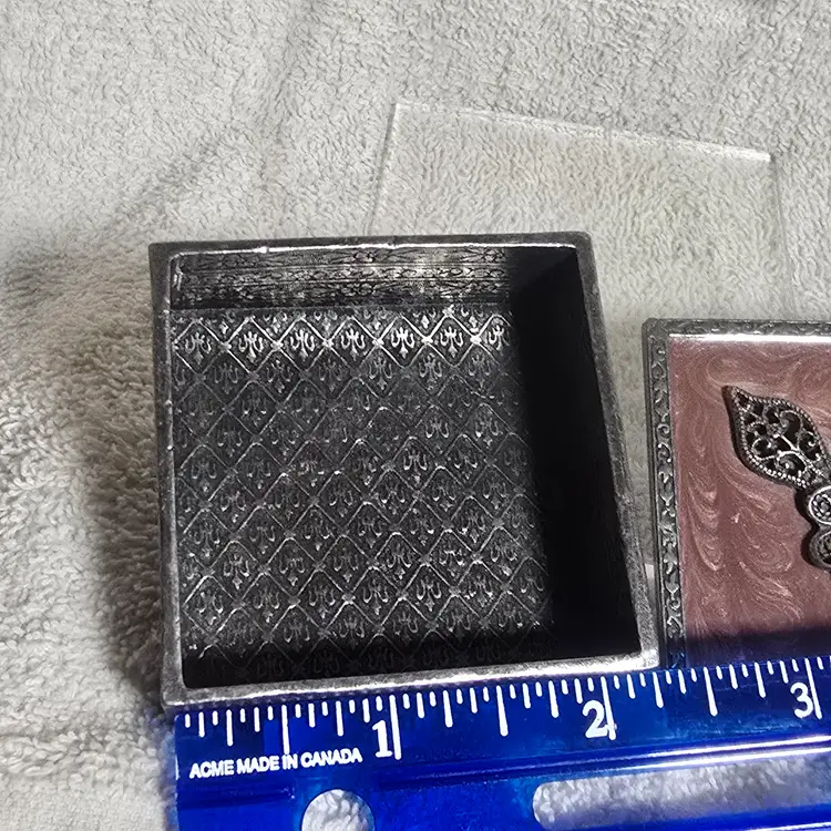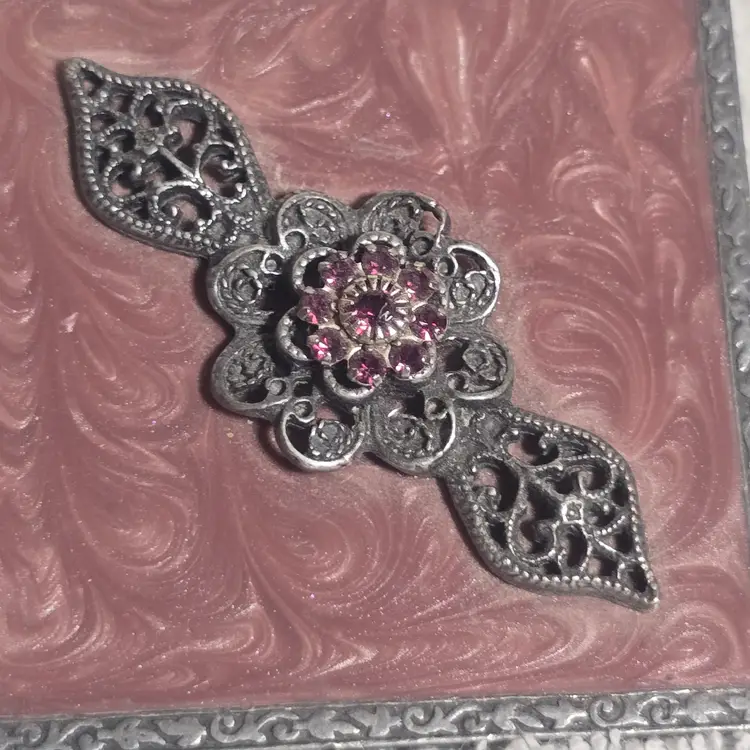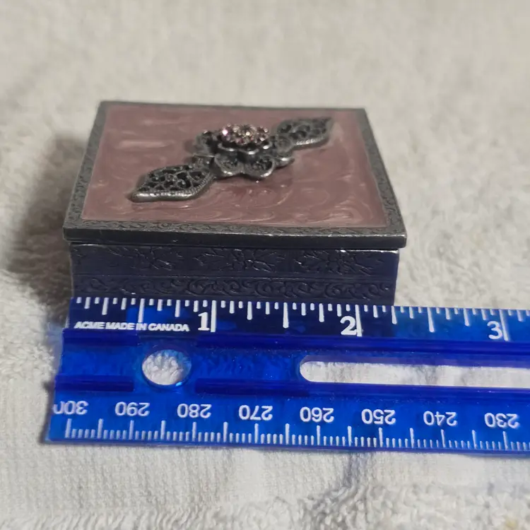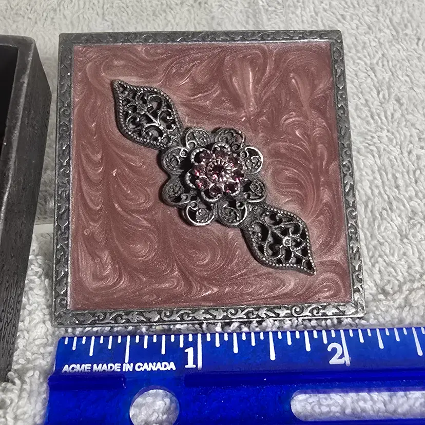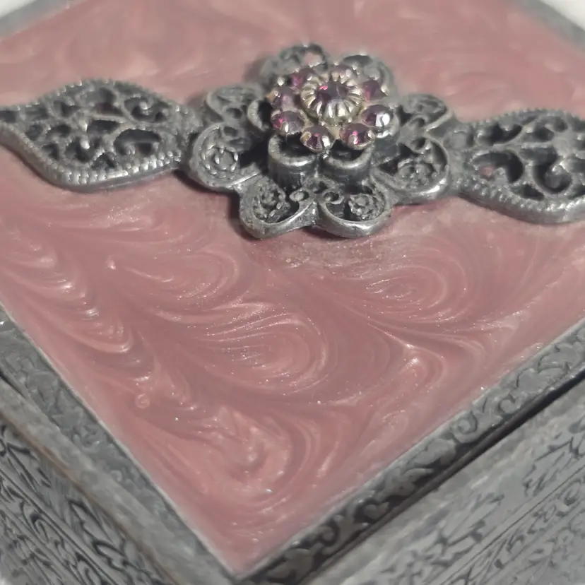 Charming square trinket box featuring a marbled pink enameled metal lid topped with ornate silver tone filigree floral embellishment set with pink rhinestones.