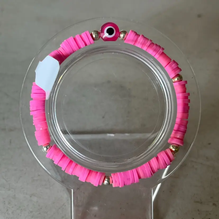 Handmade evil eye bracelet made with clay, silver hearts and acrylic beads 7 1/2 to 8 1/2 wrist size