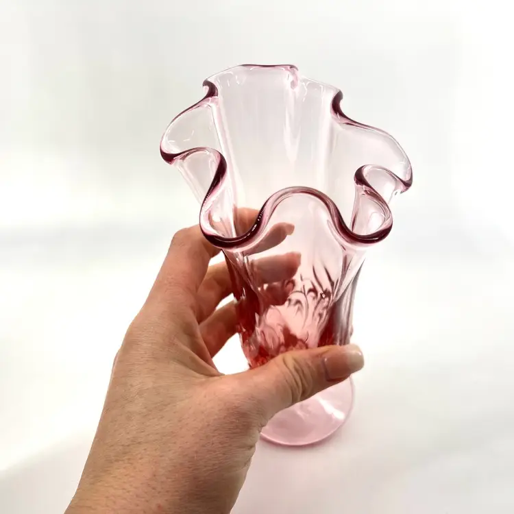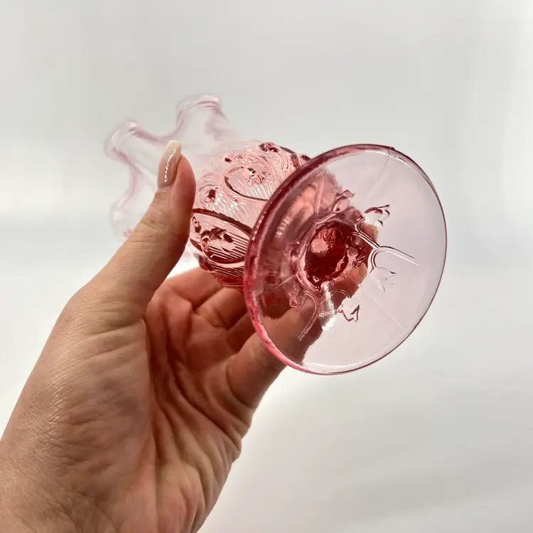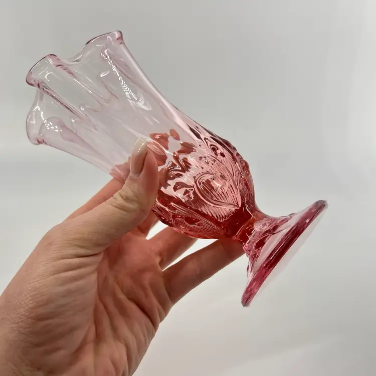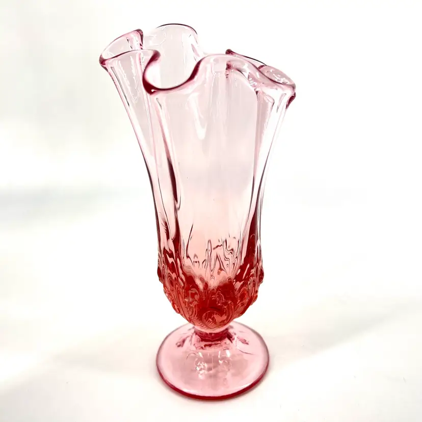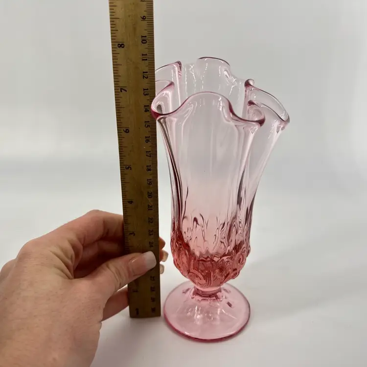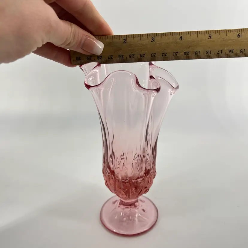 This Fenton vase is Lily if the Valley pattern. It measures approx 7.5” tall. There are no chips or cracks.
