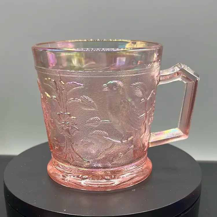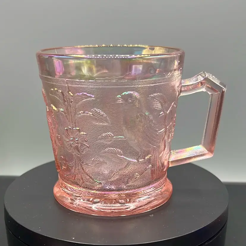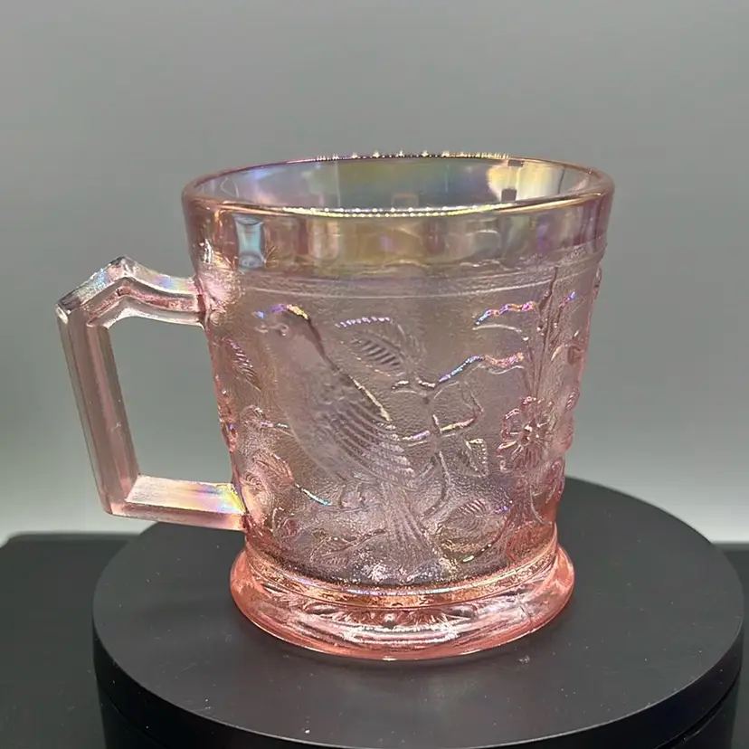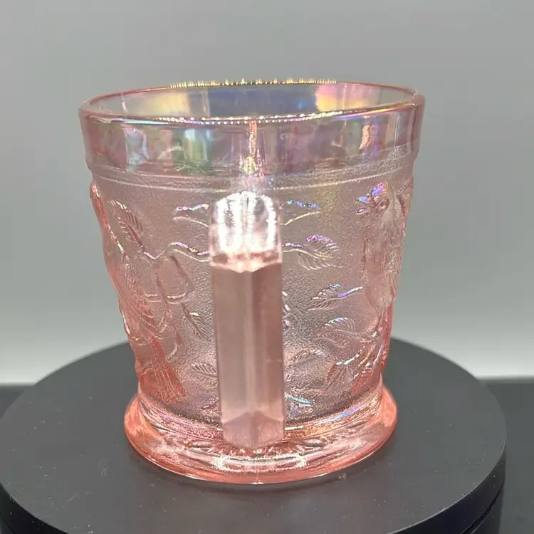 vintage Lenox Imperial Glass pink carnival glass mug featuring the "Robin Bird" pattern.