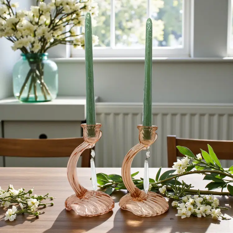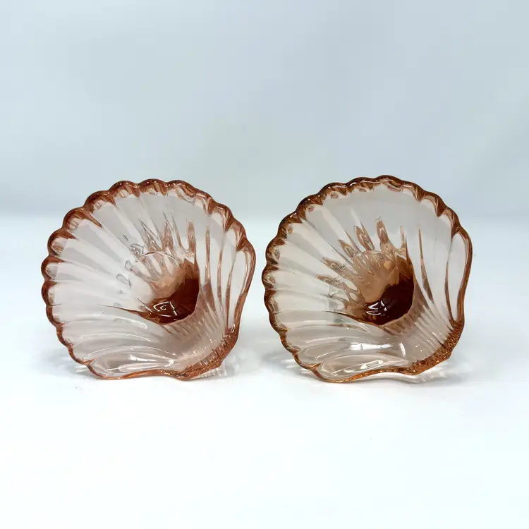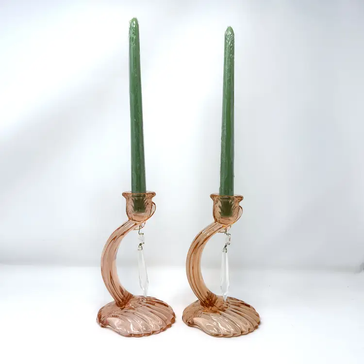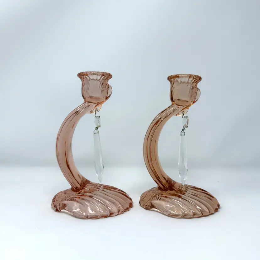 Add a touch of Art Deco elegance to your home with this stunning pair of Cambridge Caprice shell-form candle holders, crafted in delicate pink glass known as La Rosa. Featuring a graceful curved silhouette and faceted crystal prism drops, these 1938–1943 candle holders reflect the classic charm and craftsmanship of early 20th-century American glassmaking.
