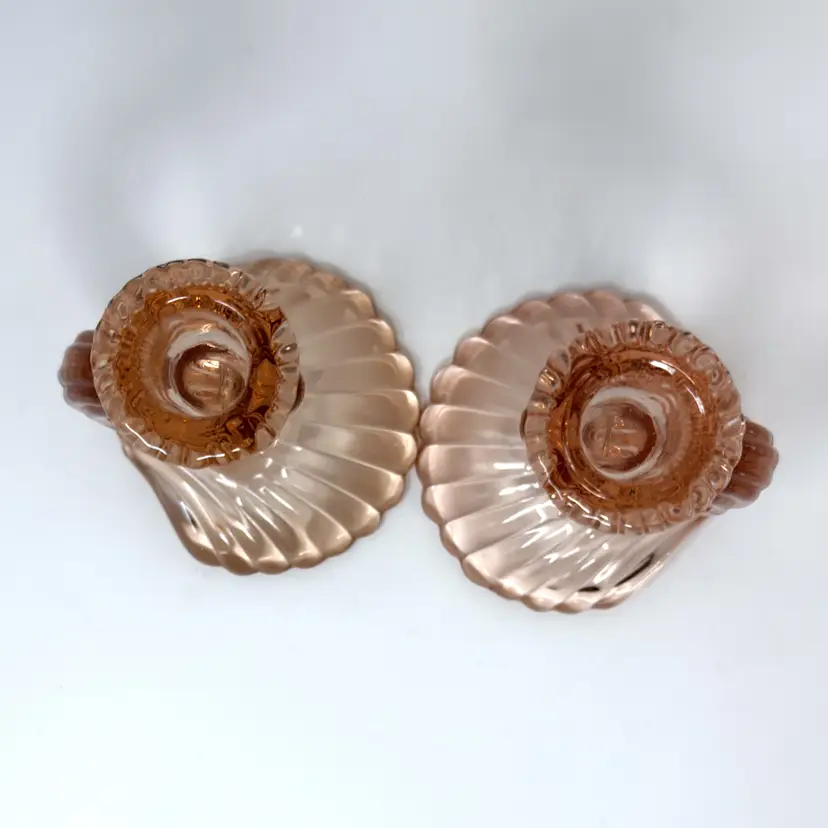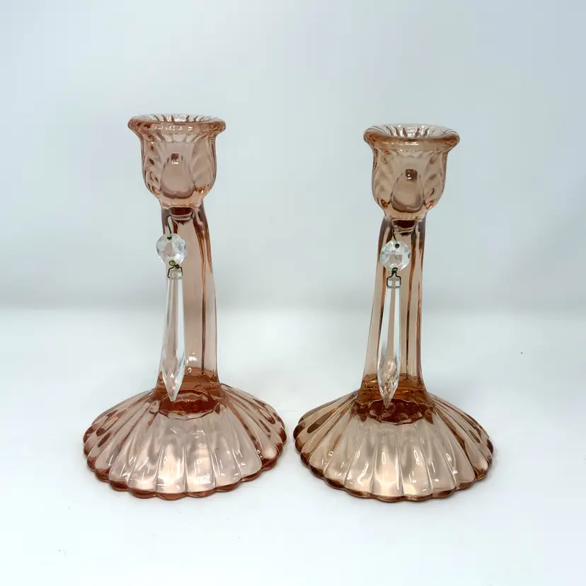 Elegant 1930s pink Cambridge Caprice shell glass candle holders with dangling prisms – a rare Art Deco pair perfect for collectors or romantic table settings.