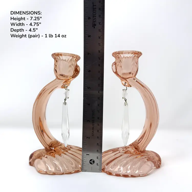Details: • Manufacturer: Cambridge Glass Co., USA • Markings: Unmarked (pattern #70 documented) • Date/Era: 1938–1943 • Design Style: Art Deco, Traditional • Shape/Style: Shell-form base, arched stem, hanging prism drop • Material: Molded pink glass (La Rosa), faceted cut glass prisms, wire hardware • Color: Soft pink / clear • Dimensions (Each): Height: 7.25" | Width: 4.75" | Depth: 4.5" |Weight (Pair): 1 lb 14 oz