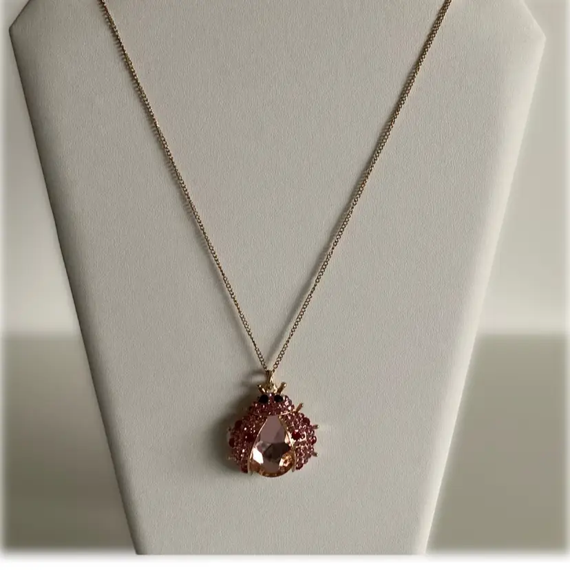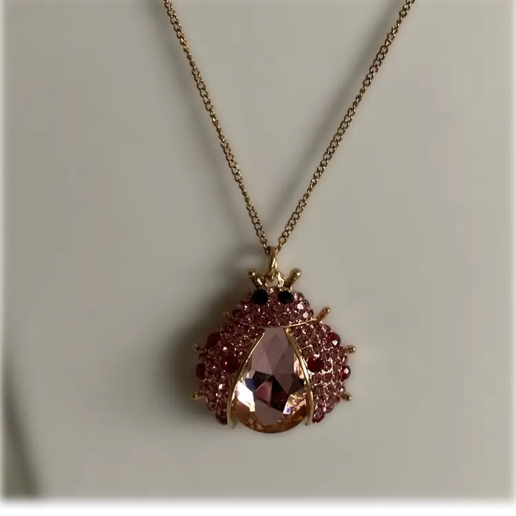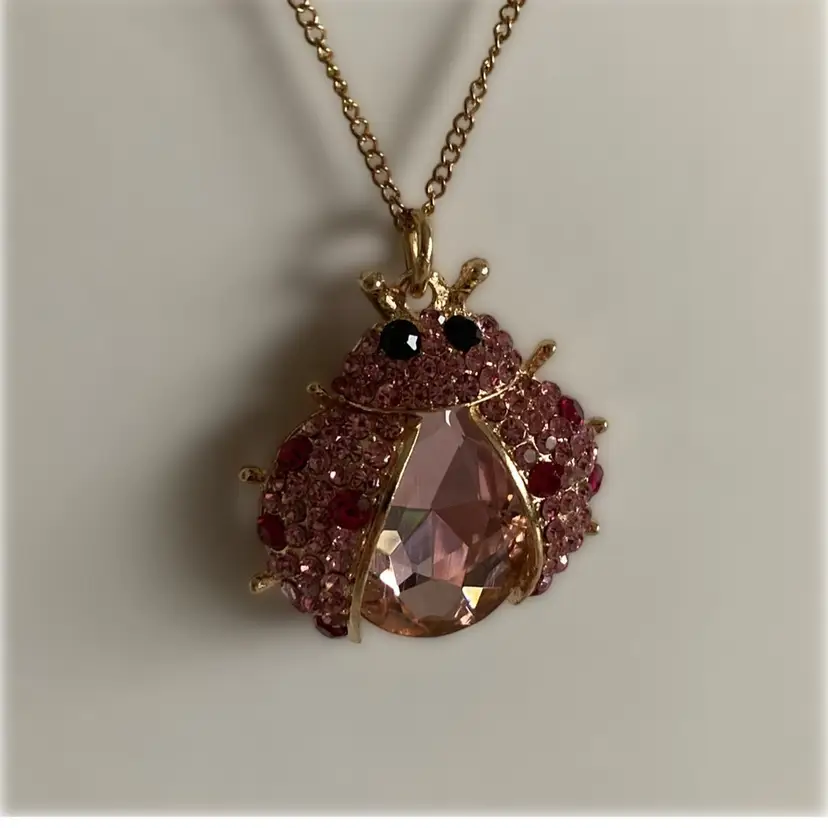 Pink glass crystal ladybug pendant on gold tone chain. Ladybug measures 1 1/2” x 1 1/2” x 1/2”. The chain measures 19” to 22” with adjustment.