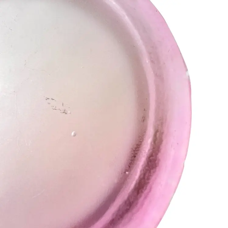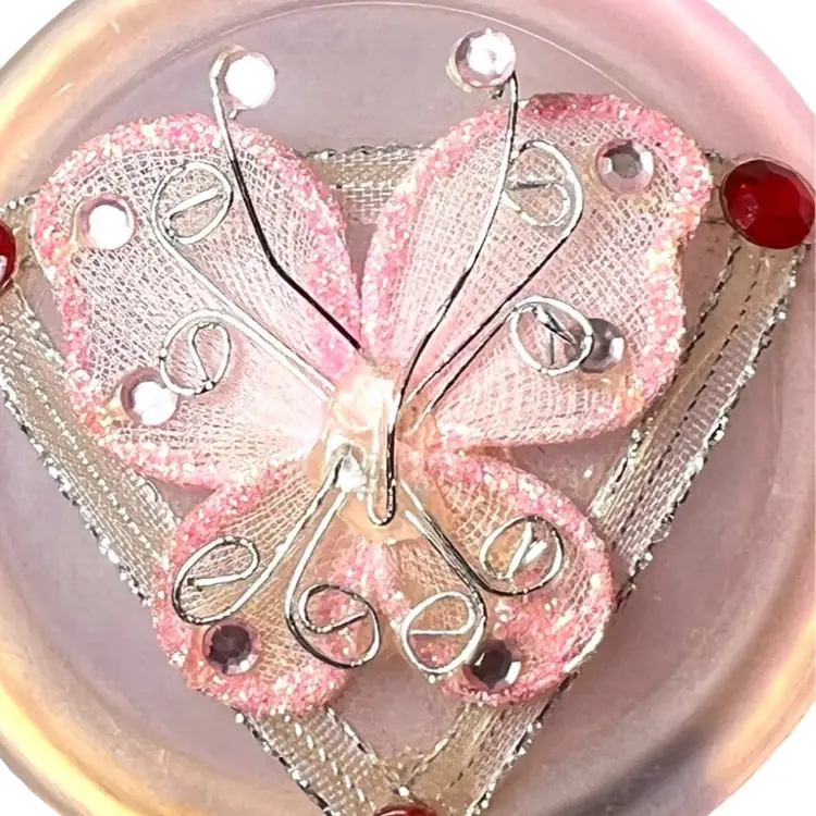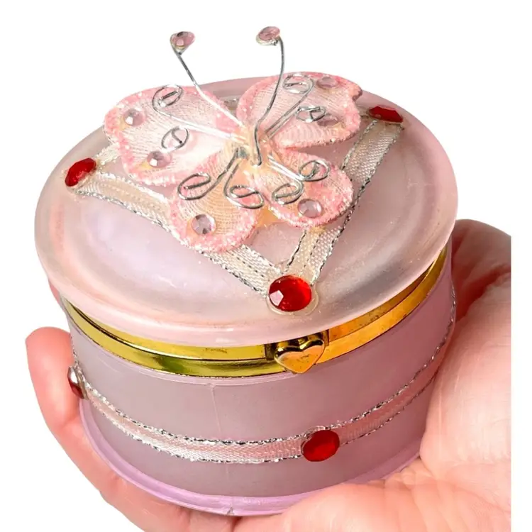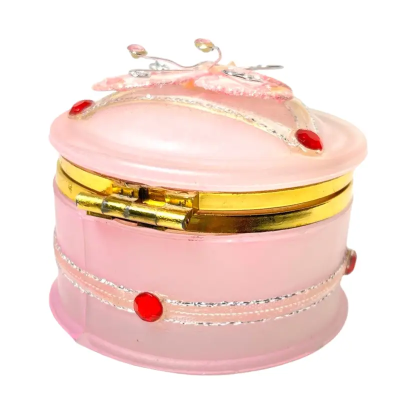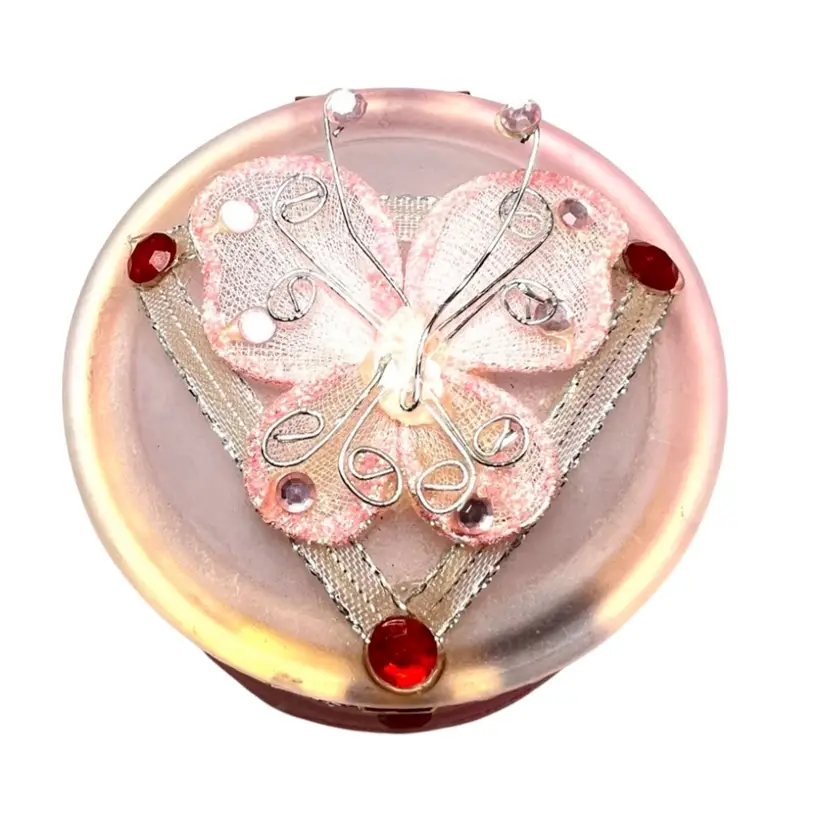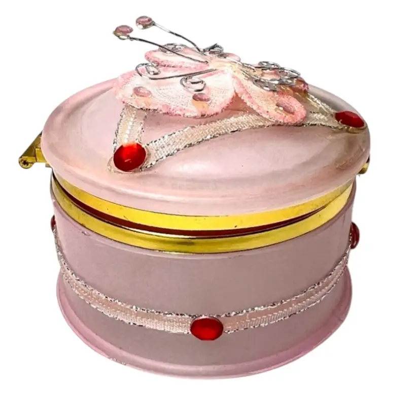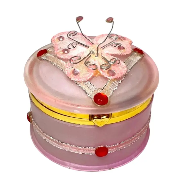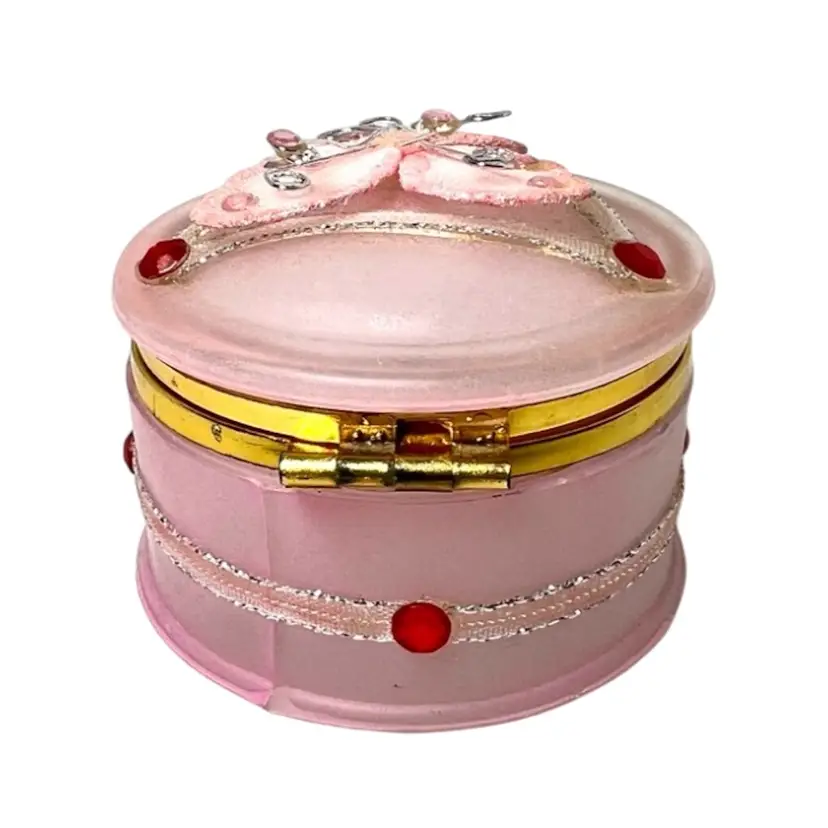 Pink Glass Jewelry Trinket Box Cute Pink Butterfly Topper Pink Ribbons Faux jewels- plastic “gems” Brass Banded. 3” Diameter x 1-3/4” Tall. Not marked. Weighs 7 ounces. Condition: Minor edge flea bites on bottom rim. Probably easy to sand down. See last 4 closeup photos.