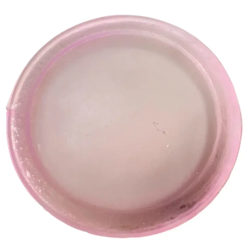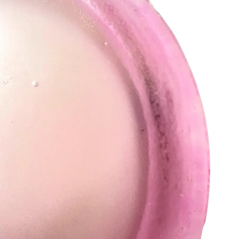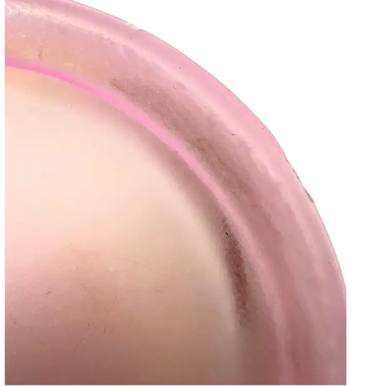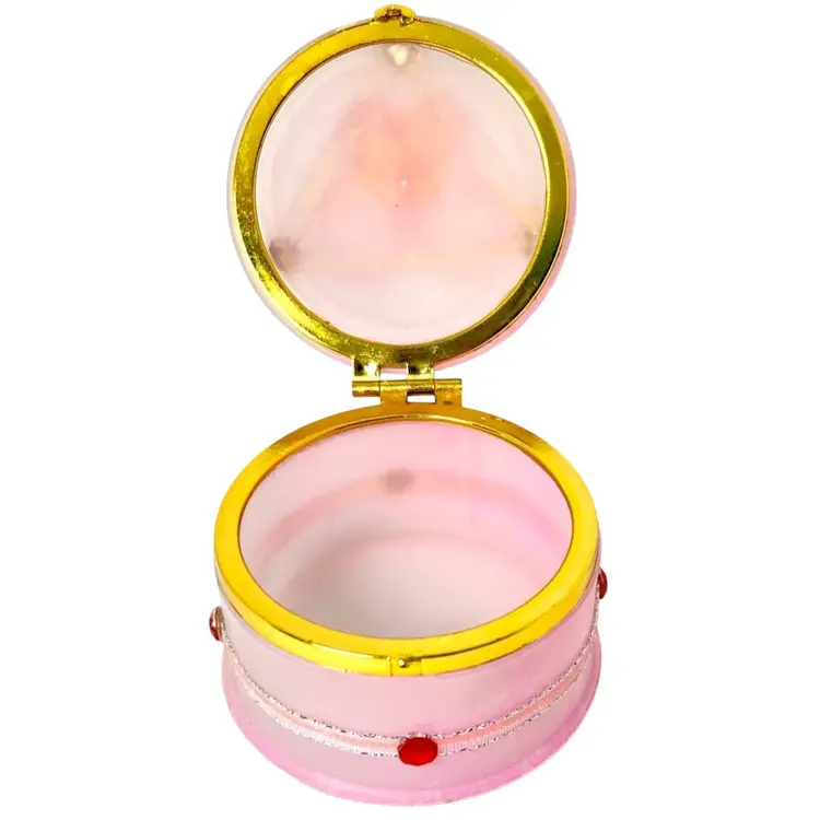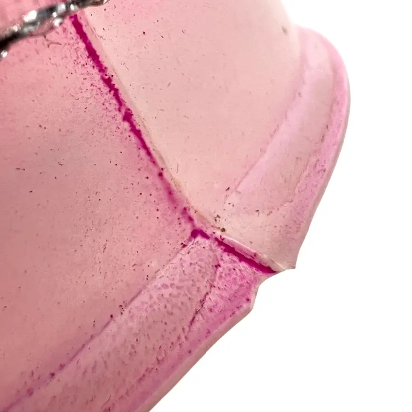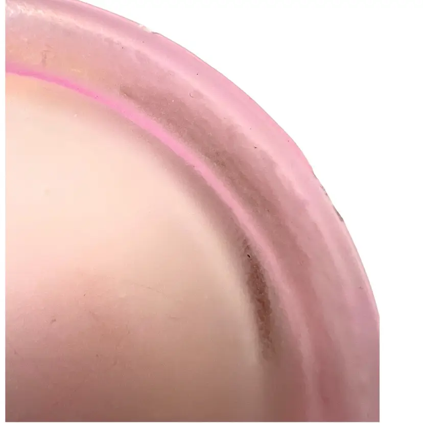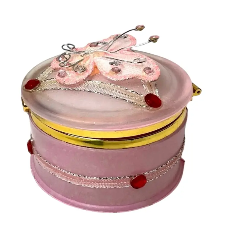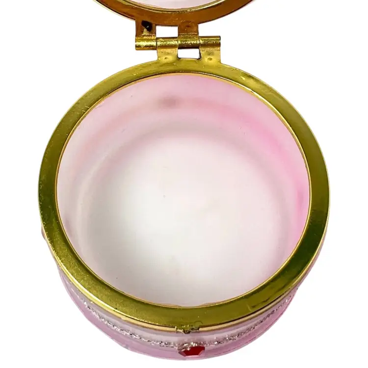 Pink Glass Jewelry Trinket Box Cute Pink Butterfly Topper Pink Ribbons Faux jewels- plastic “gems” Brass Banded. 3” Diameter x 1-3/4” Tall. Not marked. Weighs 7 ounces. Condition: Minor edge flea bites on bottom rim. Probably easy to sand down. See last 4 closeup photos.