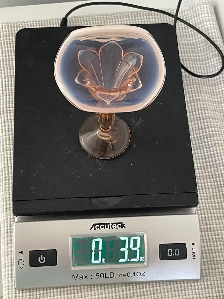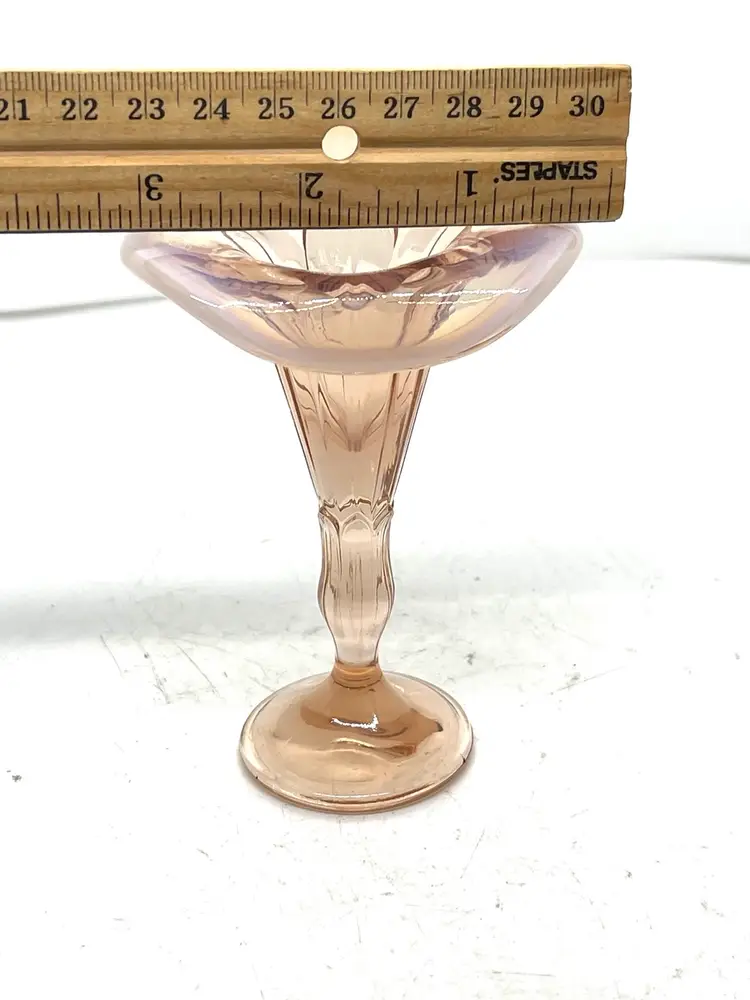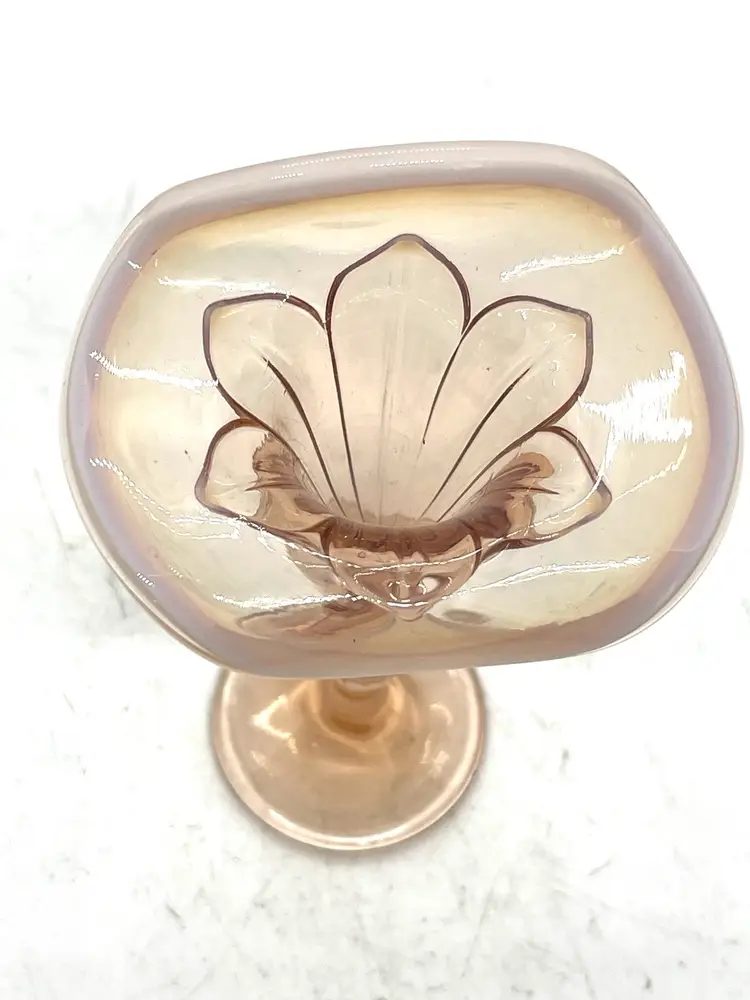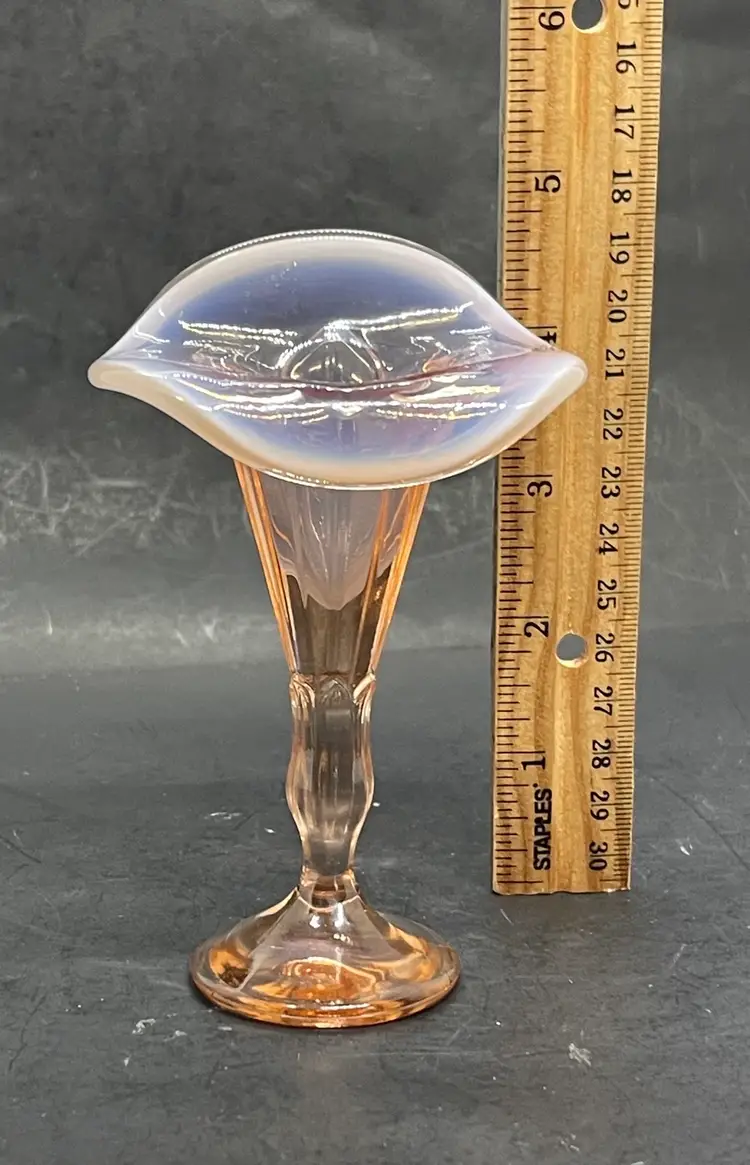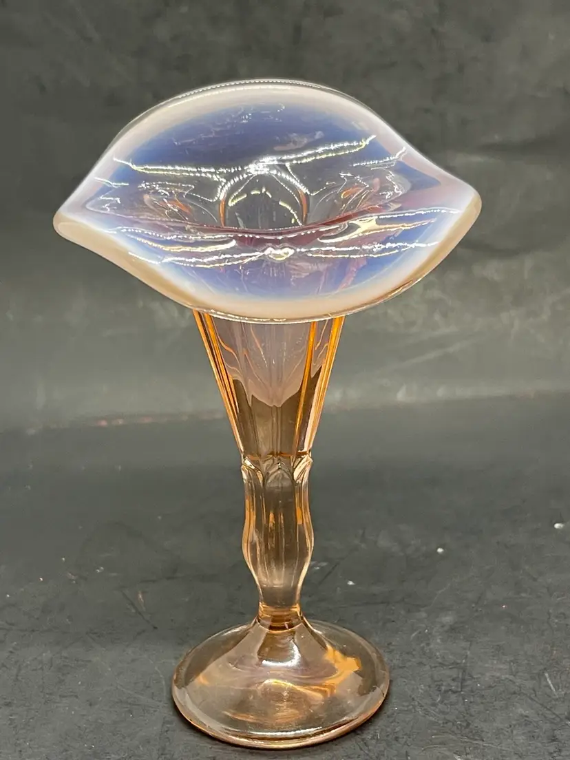 Vintage peachy pink depression art glass Jack in the Pulpit opalescent vase.