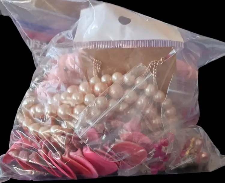LET'S HAVE A LITTLE FUN! I have curated multiple 1 lb MYSTERY bags of Jewelry. The "Pink Parfait" collection includes 18 pieces, including 5 pairs of earrings, 7 necklaces, and 6 bracelets. The vintage/modern mix adds a unique touch to this collection. Each piece in this mixed lot is versatile enough for any occasion and offers coordinating accessories without the matchy-matchy look. This collection is a must-have for any fashionista looking for a unique addition to their accessory collection. What a deal!