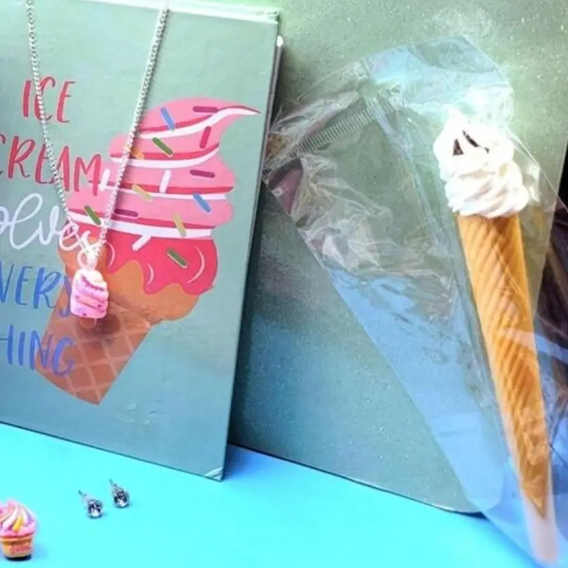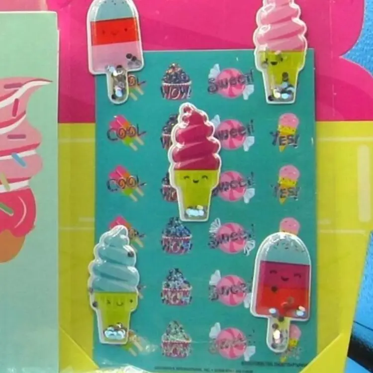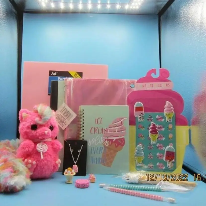 Pink folder mint green glitter composition notebook Ice Cream journal Pink Irridescent Zipper bag ice cream pen 2 mechanical pencils, pink and green that look like old fashion ice cream parlor poles :) Ice Cream sleeve sticker holder, 1 sheet ice cream, sweets stickers, plus 4 extra ice cream stickers pink ice cream necklace and ring! rhinestone studded earrings Ice cream erasers, sundae and pink ice cream sandwich
