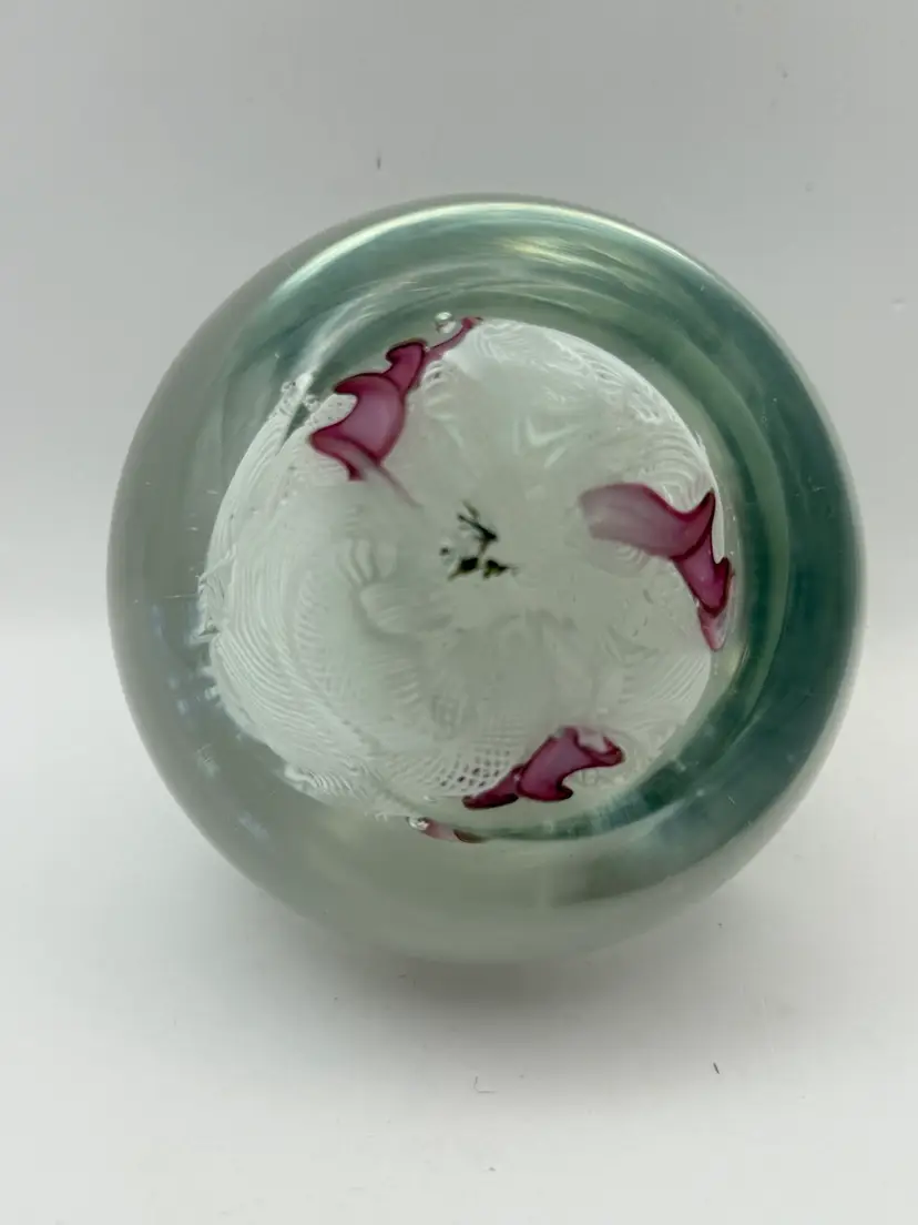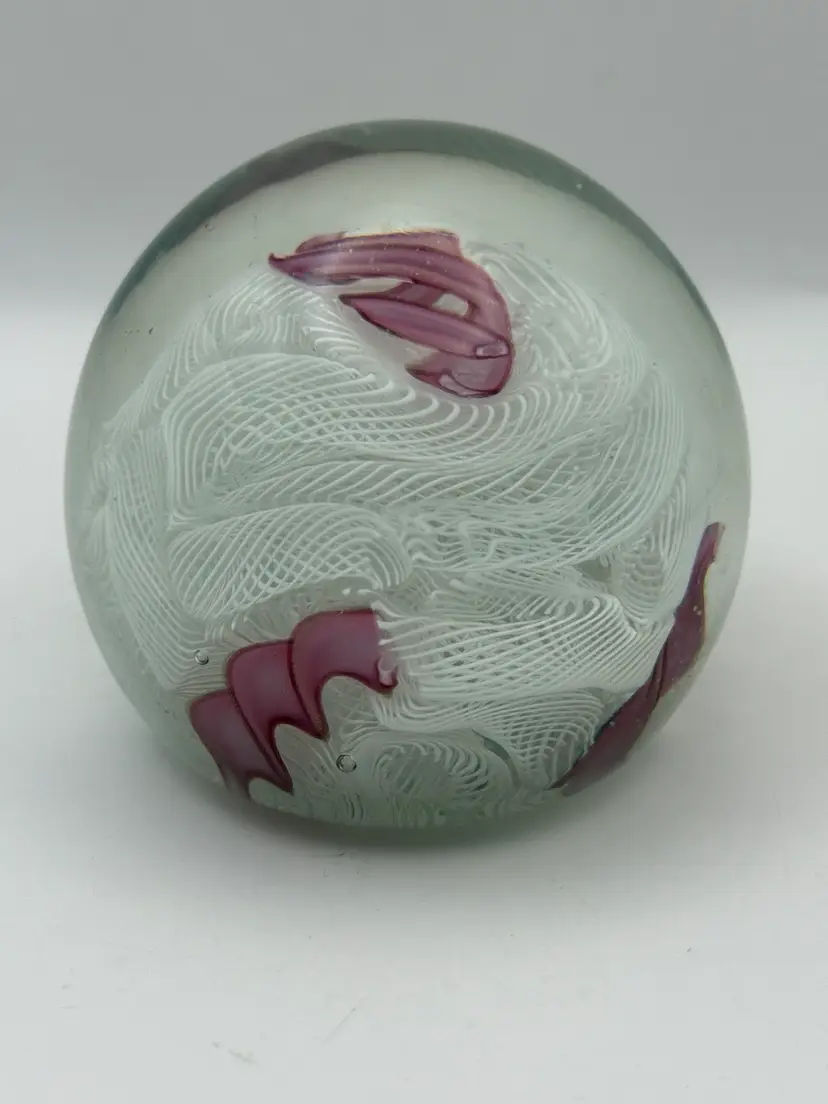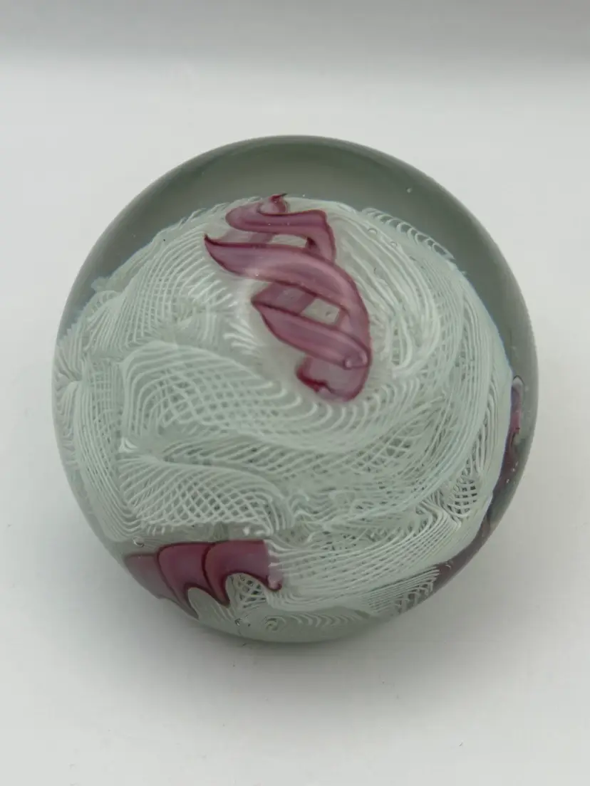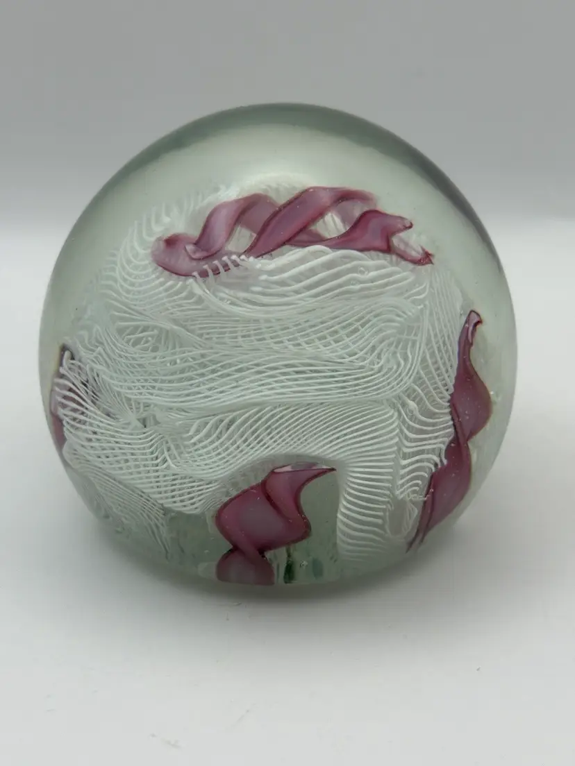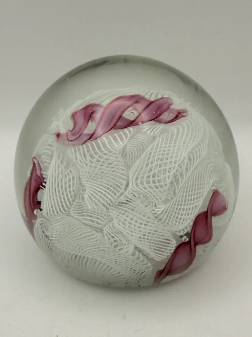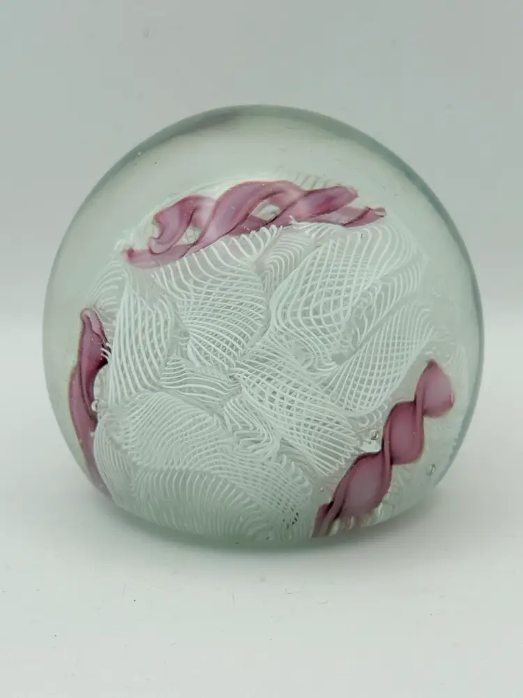 Beautiful Pink and white ribbon art glass paperweight Polished bottom No chips or cracks Some bubbles and color inclusions on bottom. See pics 2-1/4”
